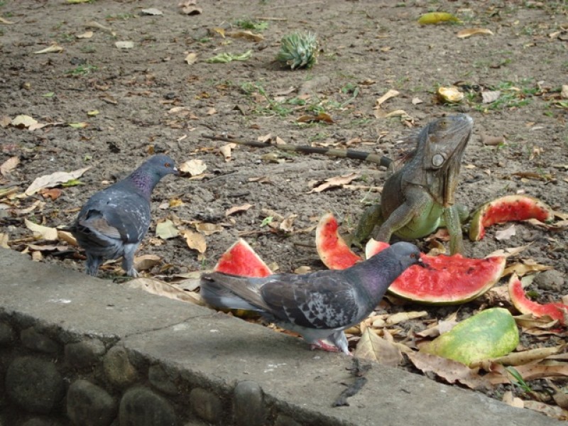 Toen we een keer in een park zaten te genieten van wat koud drinken, ontdekten we dat het in dat park stikte van de leguanen. De bomen zaten er vol mee. Ze hadden watermeloen gekregen en dat stelden ze zeer op prijs. De grote beesten zaten in de bomen uit te buiken en de kleinere exemplaren mochten eten toen wij er waren.