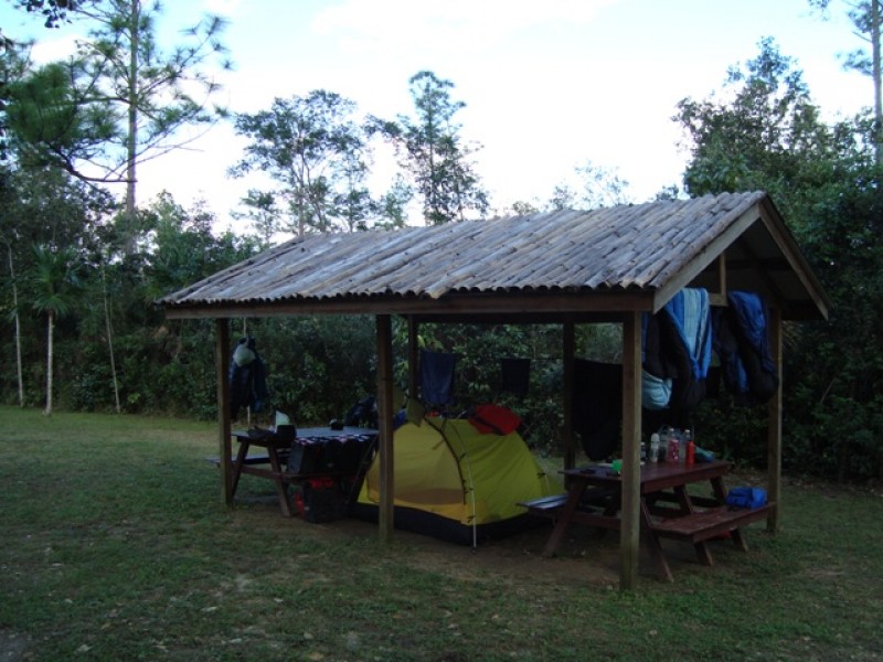 We wilden naar de Belize Zoo, waarbij je ook kunt kamperen. Vlak voor we de zoo bereikten, waren we aan het eind van het heuvelige stuk. Vanaf daar zou het vlak zijn. We konden de tent opzetten onder een dak op een groot grasveld. Een prachtige plek, midden in de natuur.