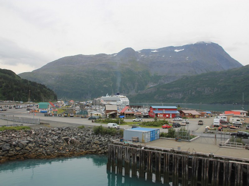 En weer gingen we met de boot. Whittier ligt vlak bij Anchorage, dus we konden er naar toe fietsen. Maar om er te komen moet je door een lange, smalle tunnel die ooit alleen voor de trein is gebouwd. Daar mag je niet doorheen fietsen, dus moet je een andere manier verzinnen om er doorheen te komen. Je kunt bij het begin (tolhokje) gaan staan en elke auto die stopt vragen om een lift, of je kunt de trein nemen. Wij wilden er gewoon naar toe gaan en een lift proberen te krijgen. Mocht dat niet lukken, dan konden we altijd nog de trein nemen.