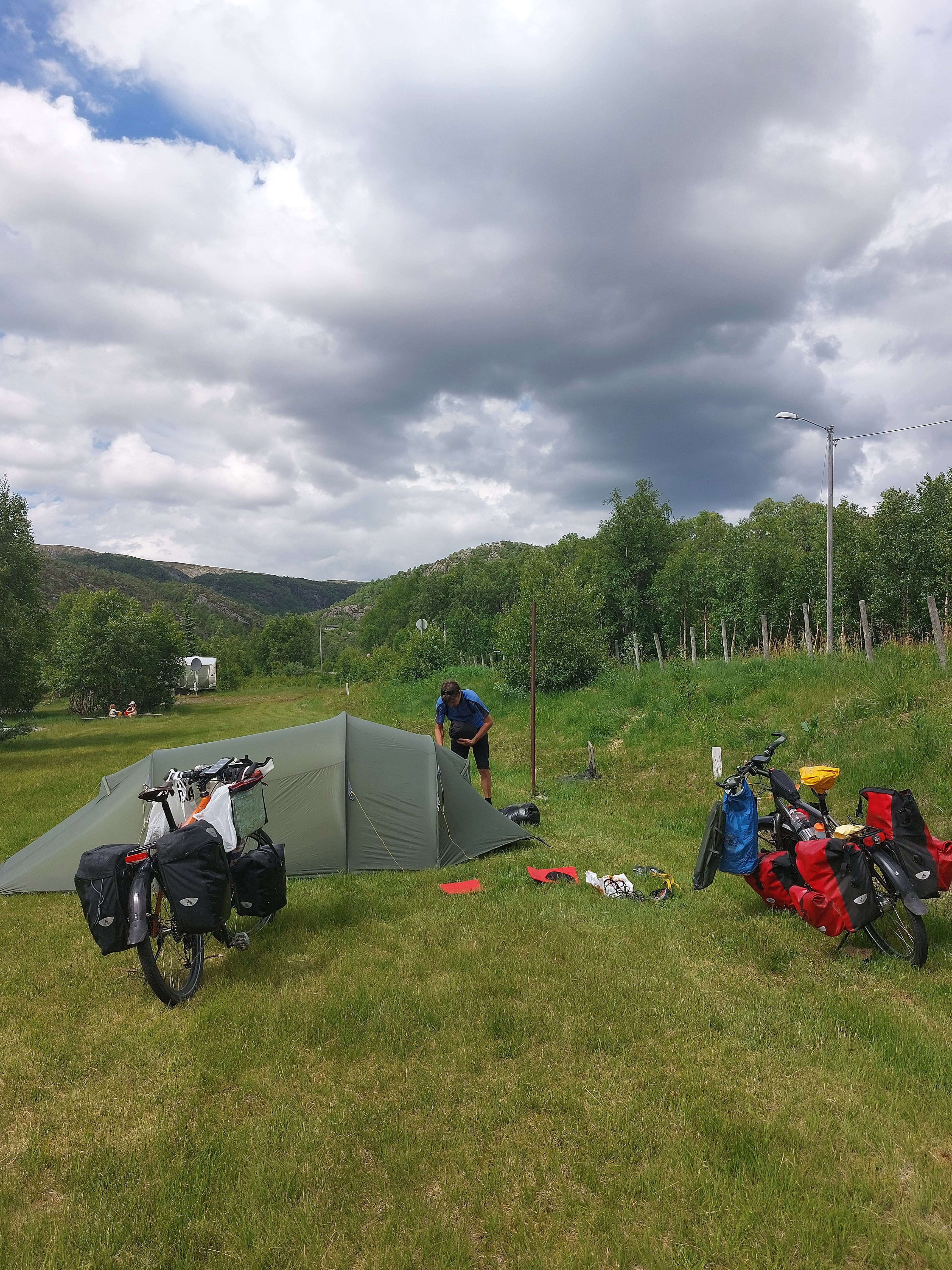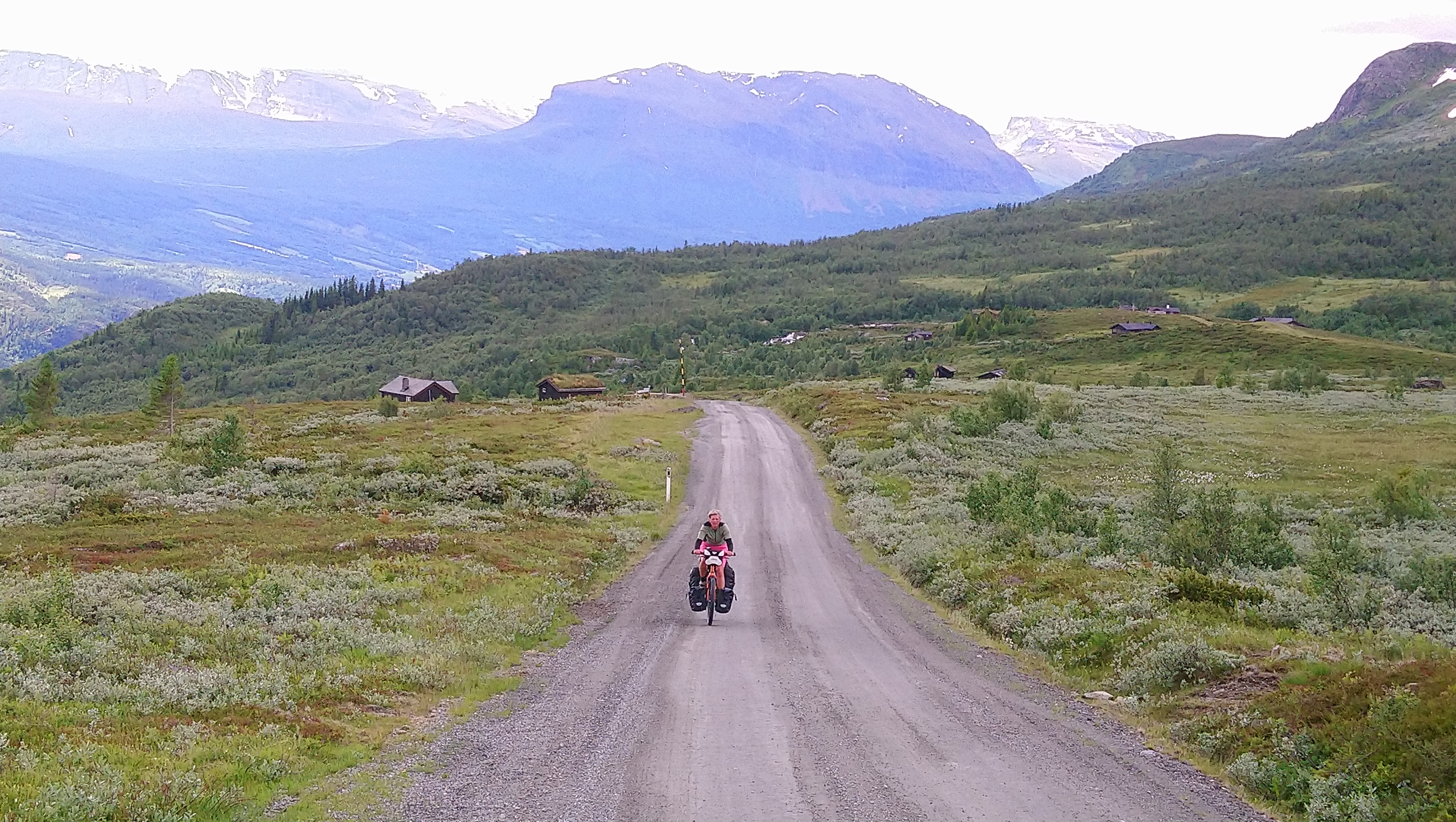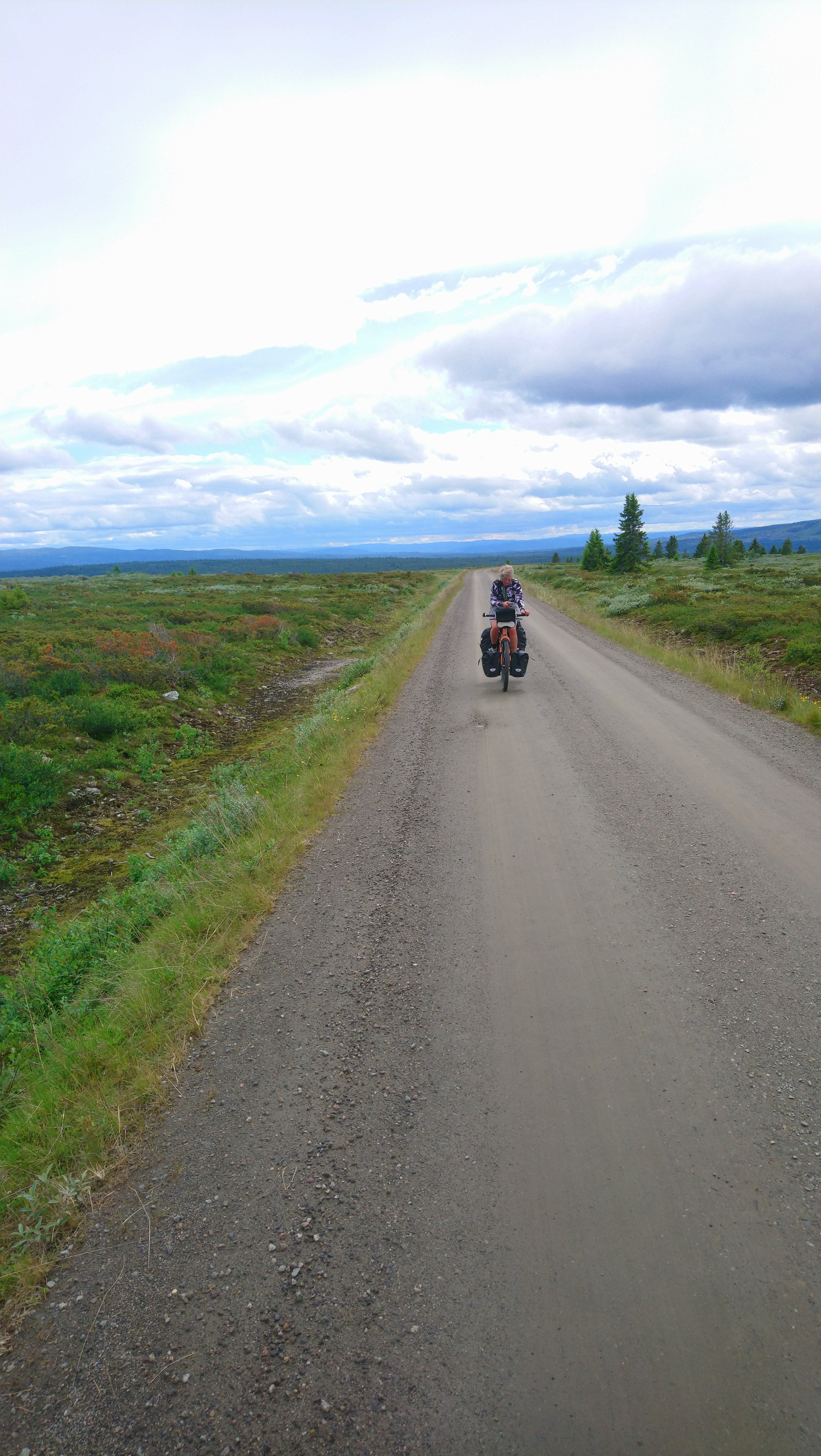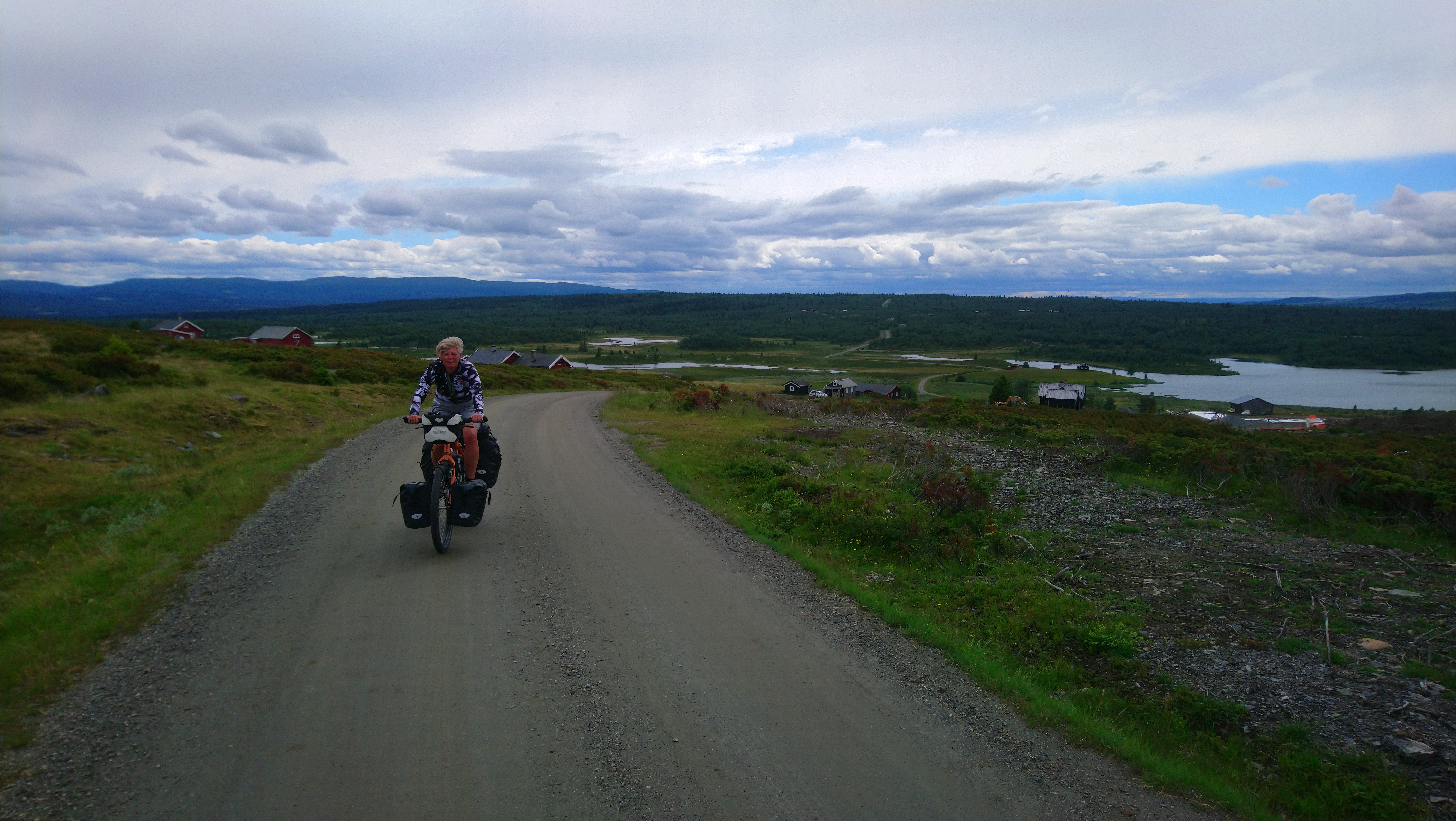 Voor de volgende dag was vanaf ongeveer 1 uur regen voorspelt en we wilden tegen die tijd zo ver mogelijk zijn. Dus we vertrokken vroeg van ons mooie kampeerplekje. Het was koud en de wind waaide hard, maar het was gelukkig droog. Na een aantal kms zijn we van de route af gegaan voor een alternatieve route naar het plaatsje Forset. Dat bleek een goede keus, want het was een heel mooi stuk over een klein weggetje en we zagen er geen enkel ander mens. Het was ook niet heel zwaar om te fietsen omdat bijna alles vlak was of naar beneden ging. We kwamen langs een meer en langs afgelegen boerderijtjes en aan het eind daalden we af naar een prachtig groen dal. We kwamen mooi voor de regen aan in Forset en hebben getwijfeld of we door zouden fietsen naar Dokka of in Forset naar de camping zouden gaan. We wilden eigenlijk door naar Dokka, maar er wachtte ons nog een lange steile klim en de voorspelde regen zat ons inmiddels al op de hielen. We besloten toch om door te gaan.