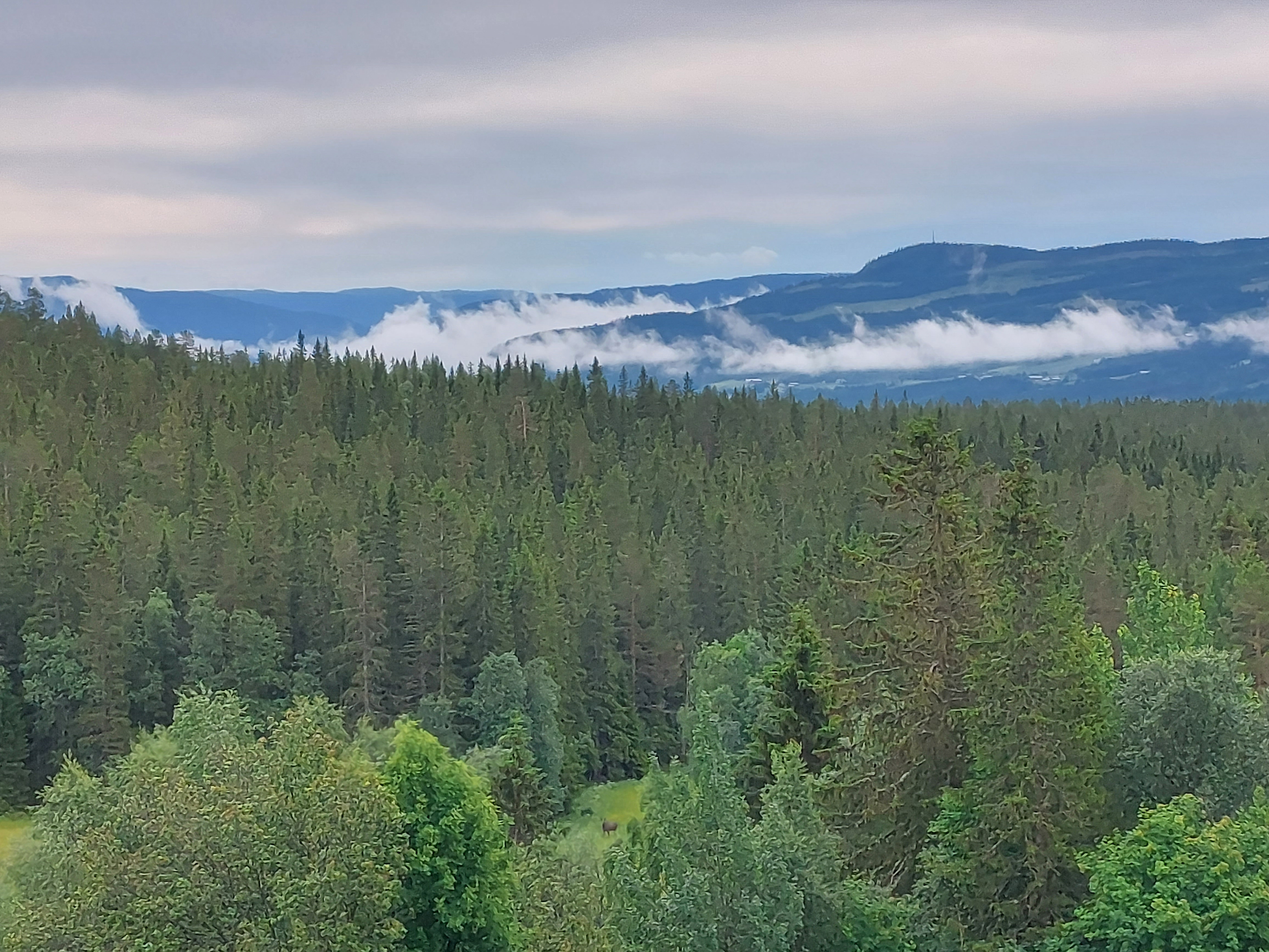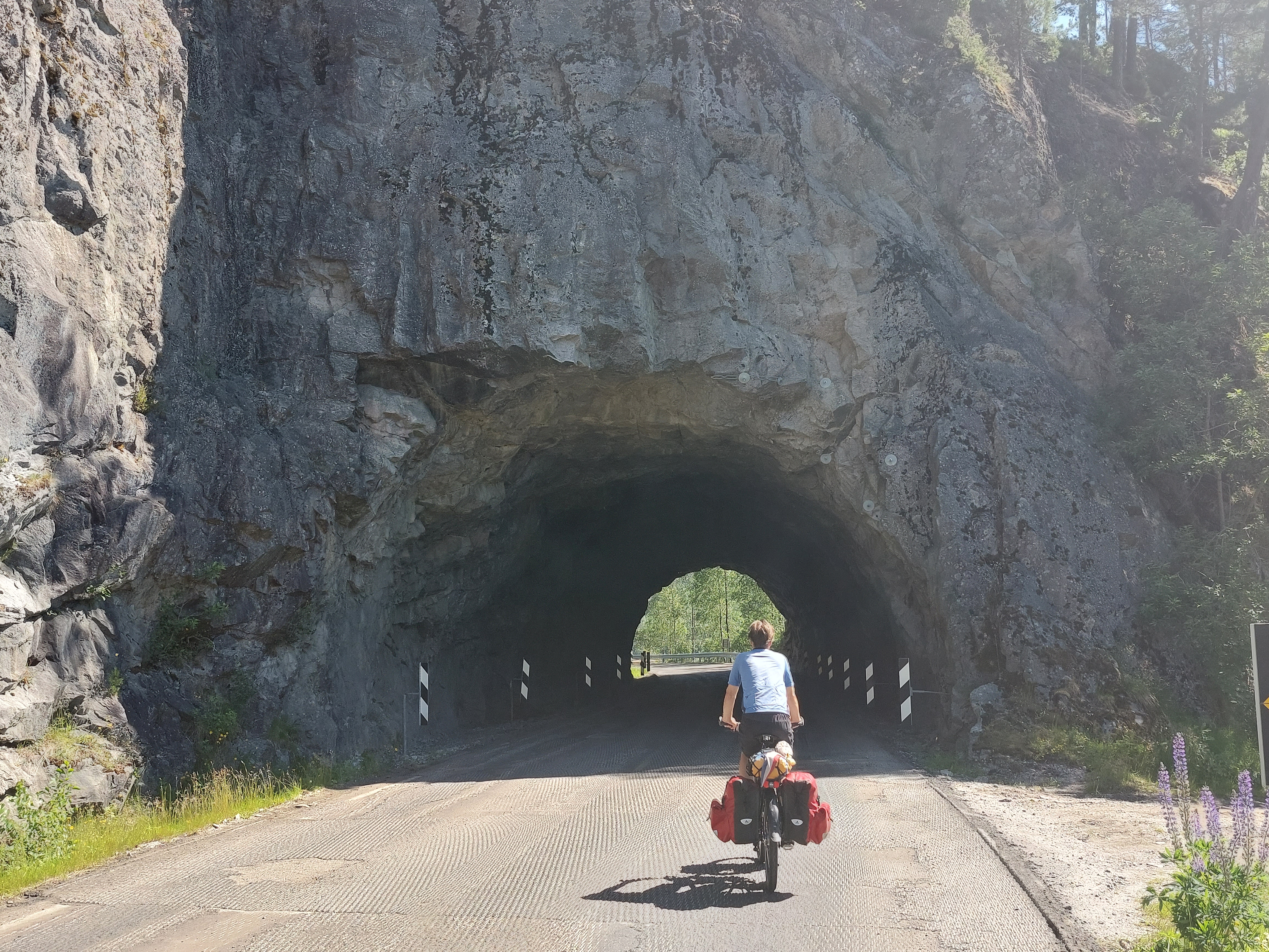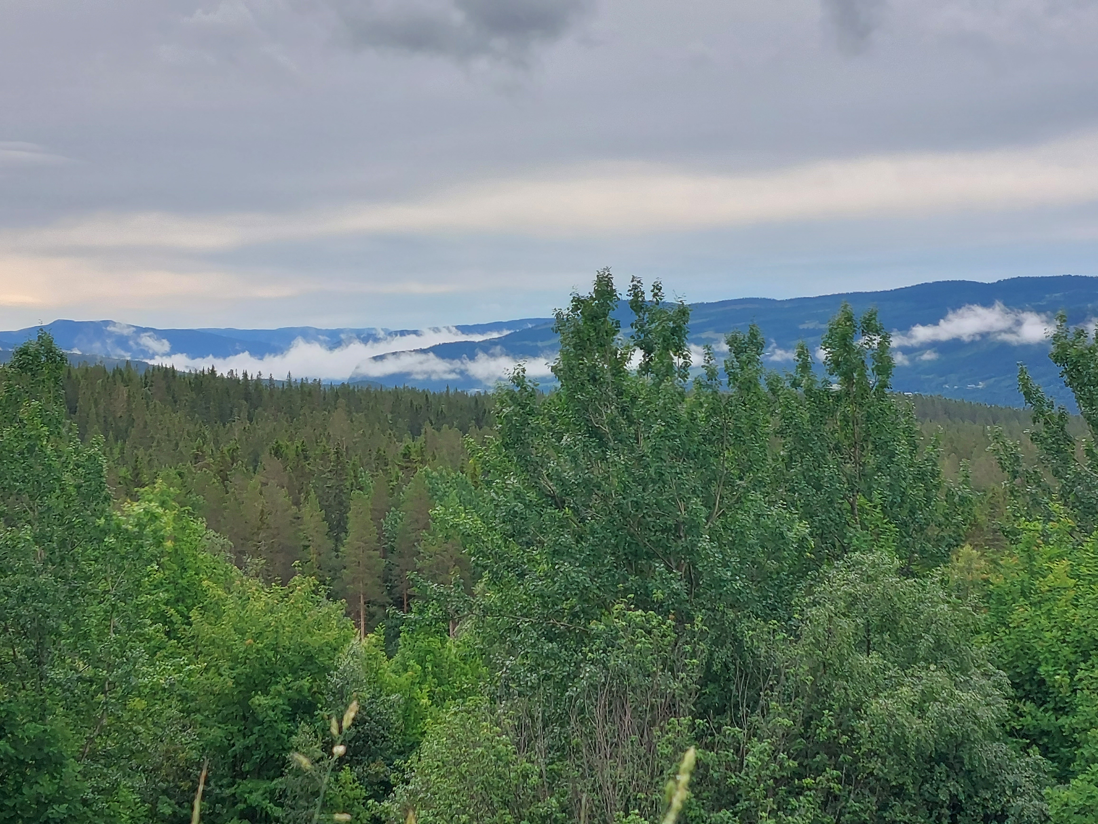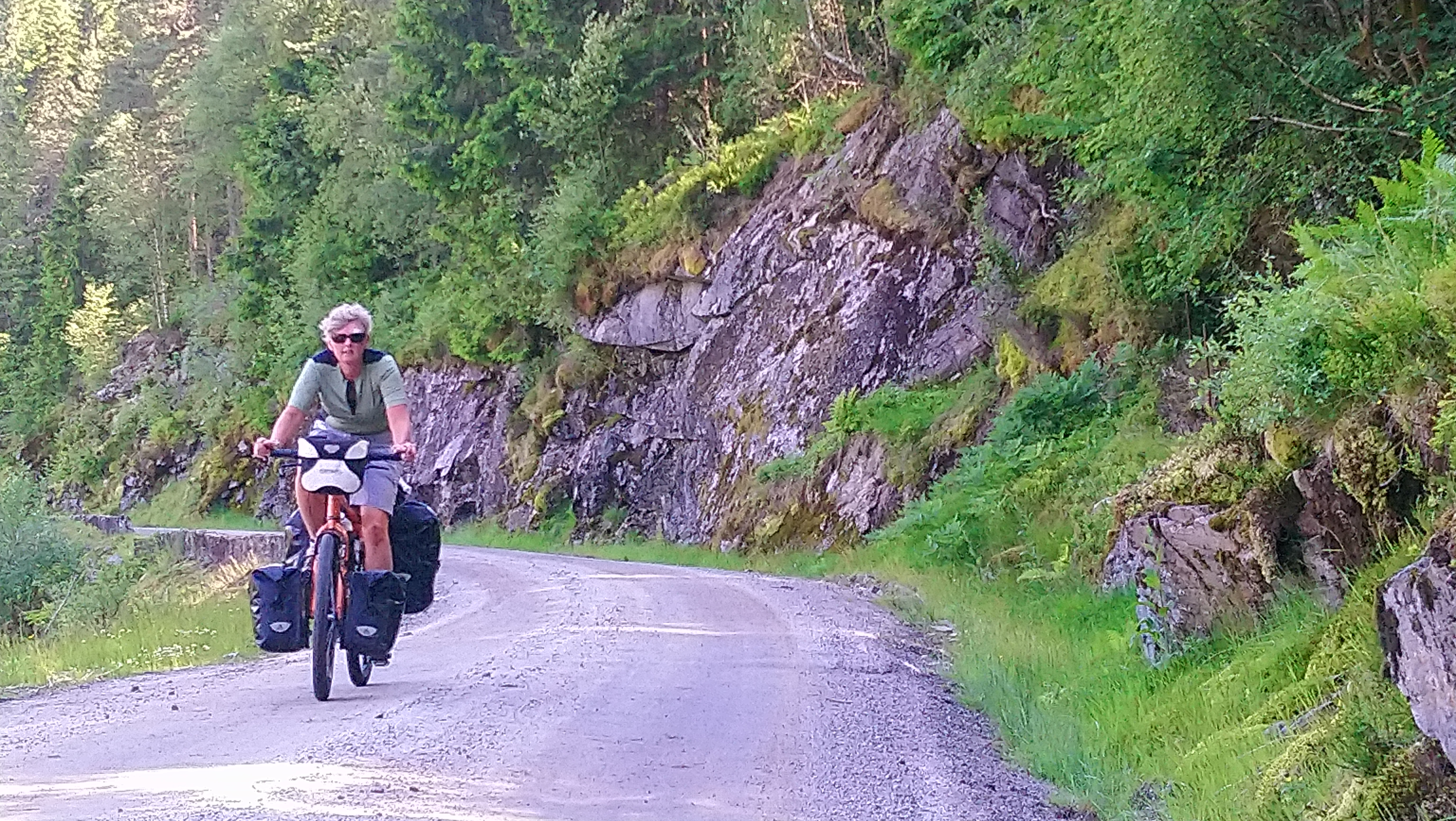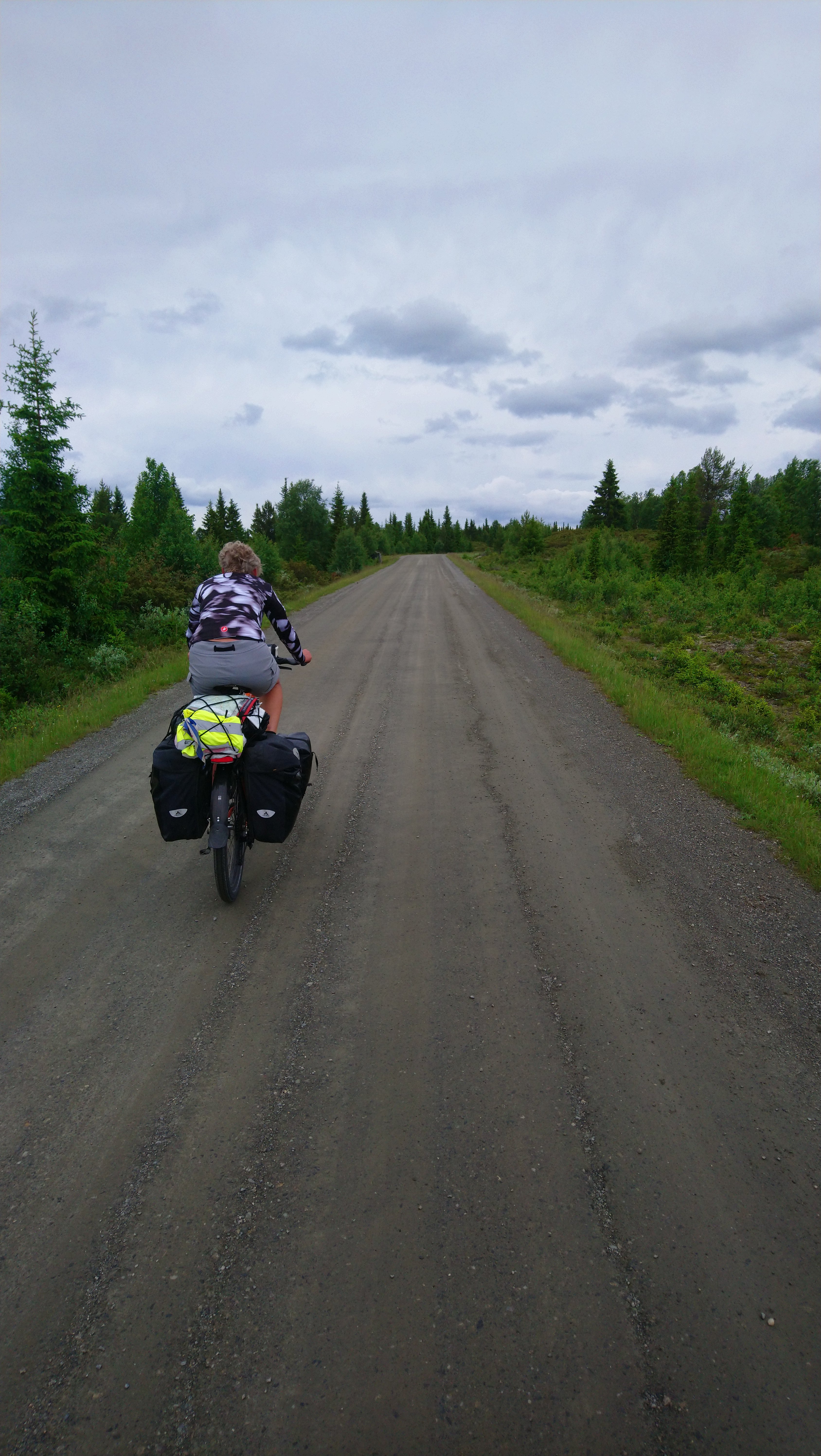 Voor de volgende dag was vanaf ongeveer 1 uur regen voorspelt en we wilden tegen die tijd zo ver mogelijk zijn. Dus we vertrokken vroeg van ons mooie kampeerplekje. Het was koud en de wind waaide hard, maar het was gelukkig droog. Na een aantal kms zijn we van de route af gegaan voor een alternatieve route naar het plaatsje Forset. Dat bleek een goede keus, want het was een heel mooi stuk over een klein weggetje en we zagen er geen enkel ander mens. Het was ook niet heel zwaar om te fietsen omdat bijna alles vlak was of naar beneden ging. We kwamen langs een meer en langs afgelegen boerderijtjes en aan het eind daalden we af naar een prachtig groen dal. We kwamen mooi voor de regen aan in Forset en hebben getwijfeld of we door zouden fietsen naar Dokka of in Forset naar de camping zouden gaan. We wilden eigenlijk door naar Dokka, maar er wachtte ons nog een lange steile klim en de voorspelde regen zat ons inmiddels al op de hielen. We besloten toch om door te gaan.