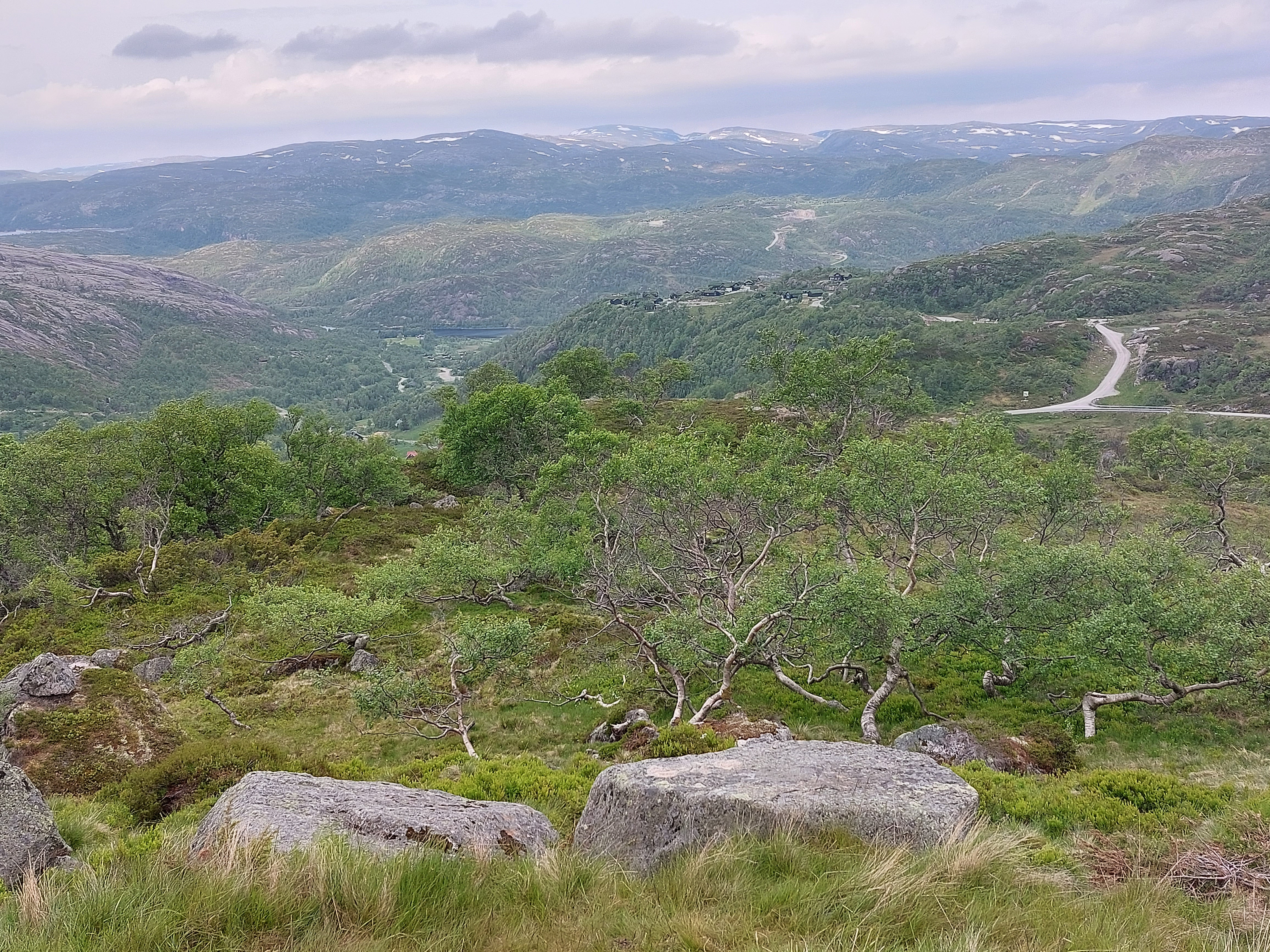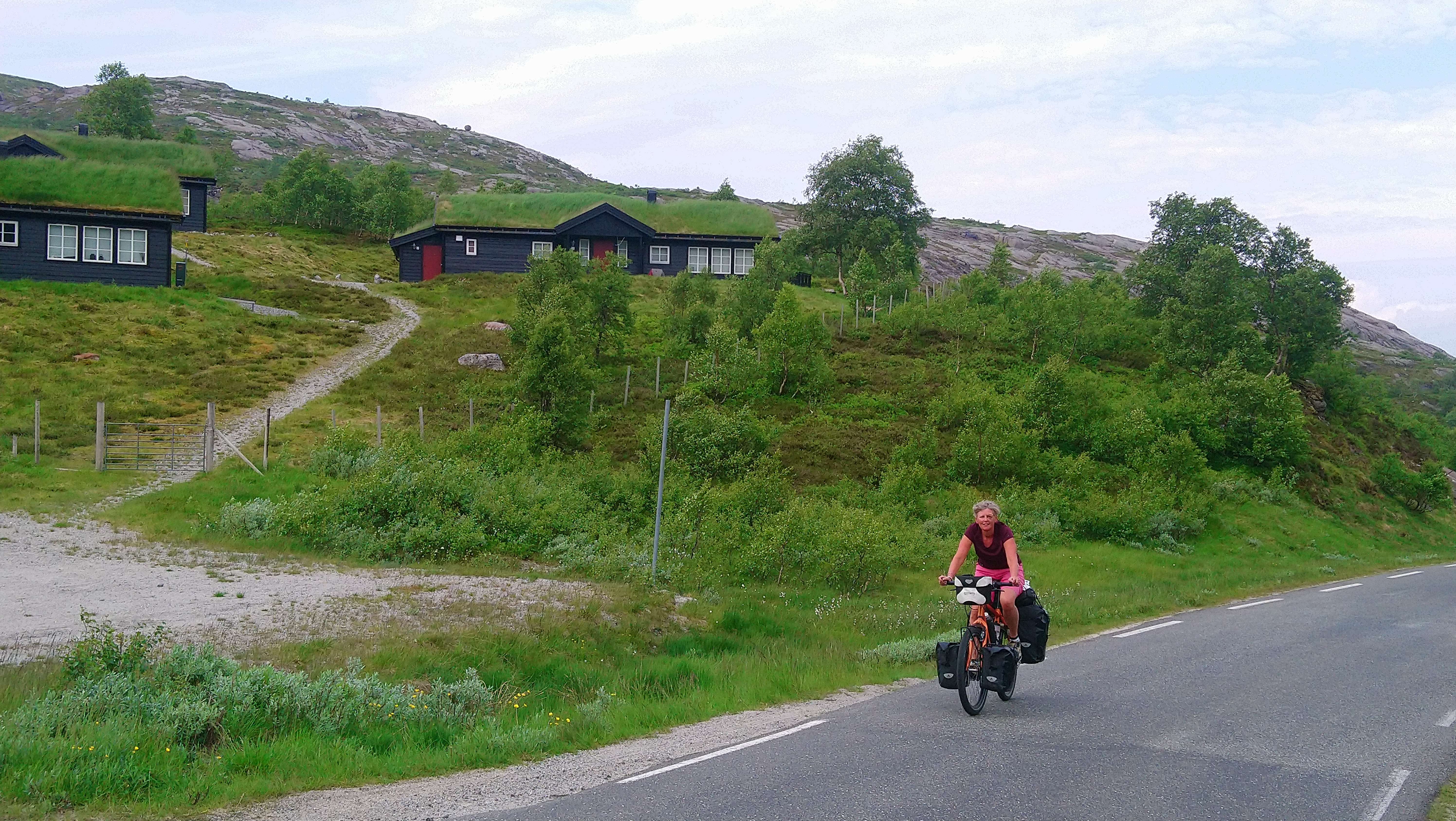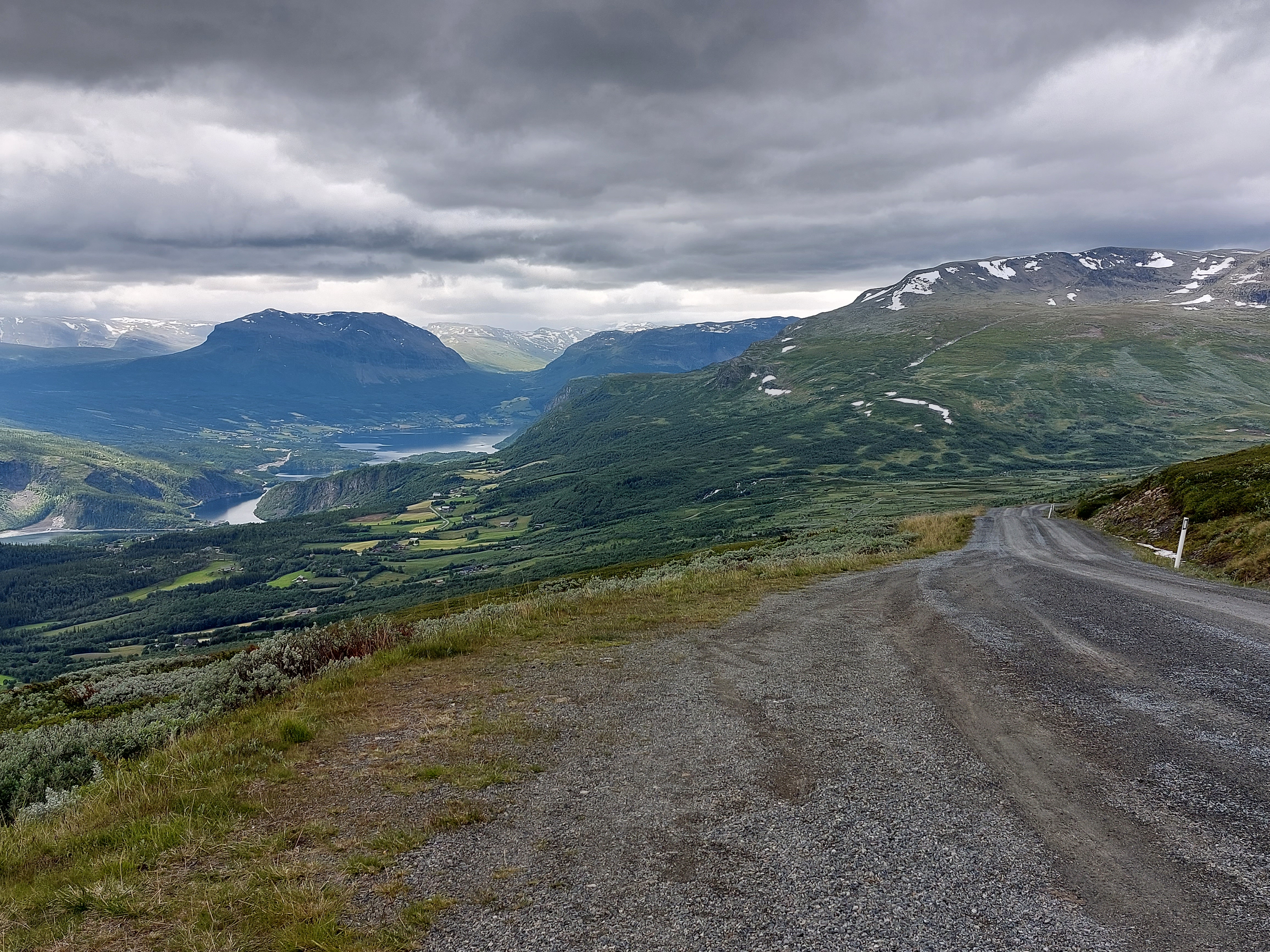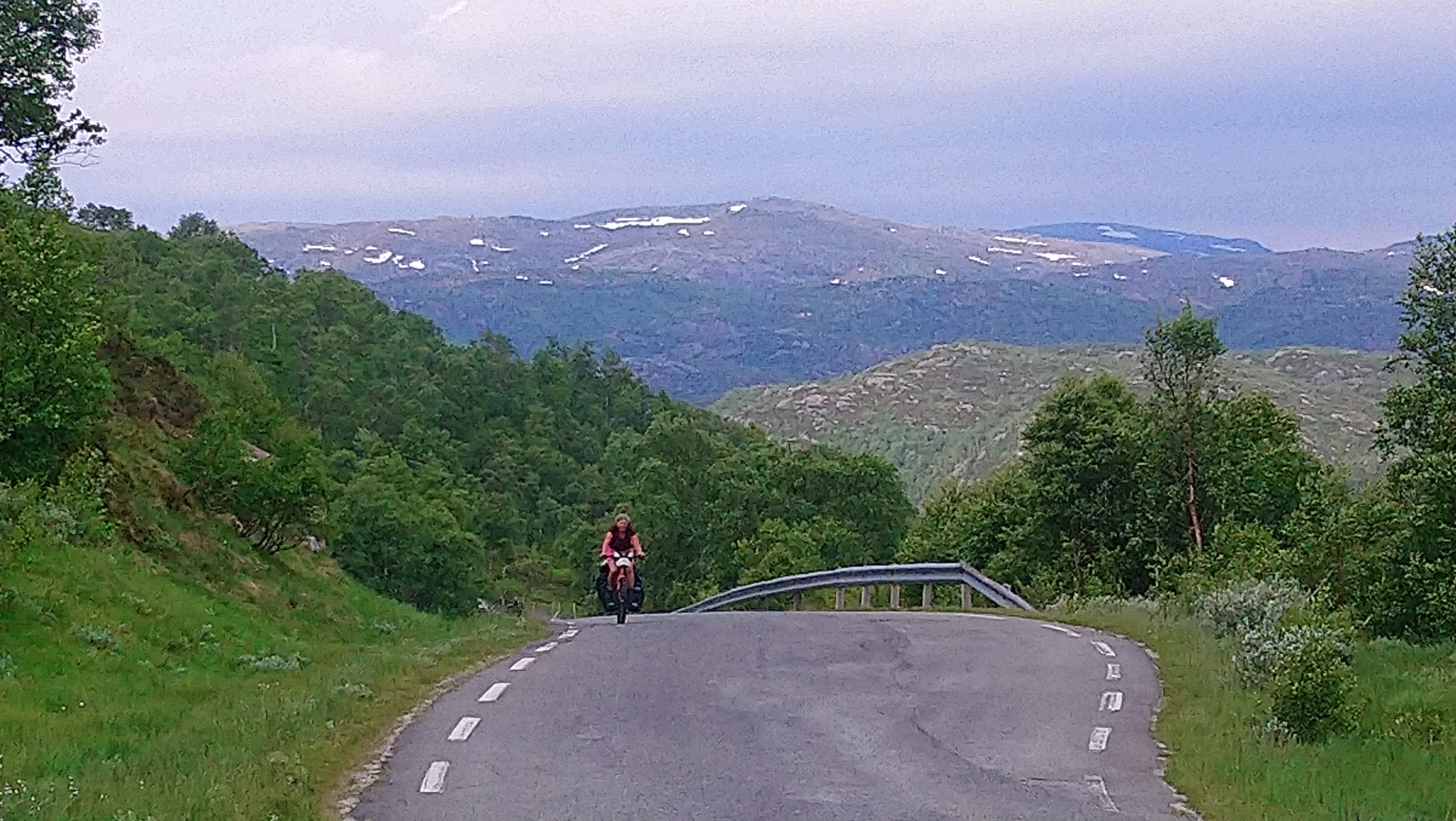 De dagen daarna fietsten we over mooie, kleine weggetjes via Kvinesdal en Tonstad omhoog naar Adneram. We hadden prachtig zonnig en warm weer, dus dat was wel een meevaller. Vanaf daar kom je op een hoogvlakte waar de wind vrij spel heeft en er op veel plekken nog (wat) sneeuw ligt. Een prachtige omgeving die mede door de dreigende wolken en de harde wind nog indrukwekkender werd. We fietsten over de vlakte en daalden aan de andere kant weer af. We moesten door naar de plaats Dalen omdat de weg daar naartoe op doordeweekse dagen afgesloten was in verband met werkzaamheden. Het was zondag, dus we moesten wel door, ook omdat het de volgende dag de hele dag zou regenen. We wilden dan wel ergens op een camping zijn. Er kwam dus nog een lange klim bij, maar het was wel weer een heel mooi stuk. Aan het eind wachtte een steile afdaling voor we het dorp in rolden. De volgende dag heeft het inderdaad zo ongeveer de hele dag geregend, dus we waren blij dat we daar waren.