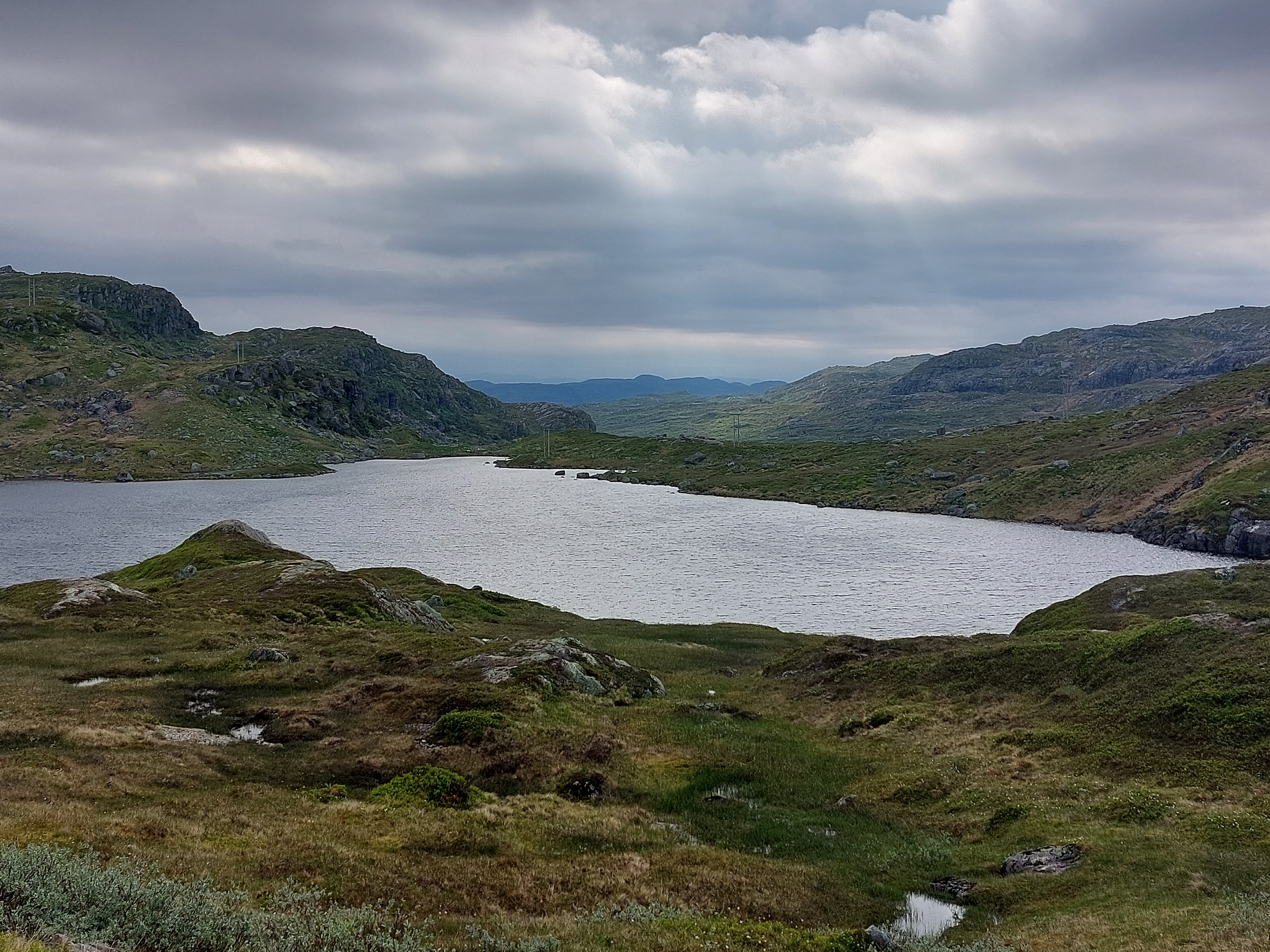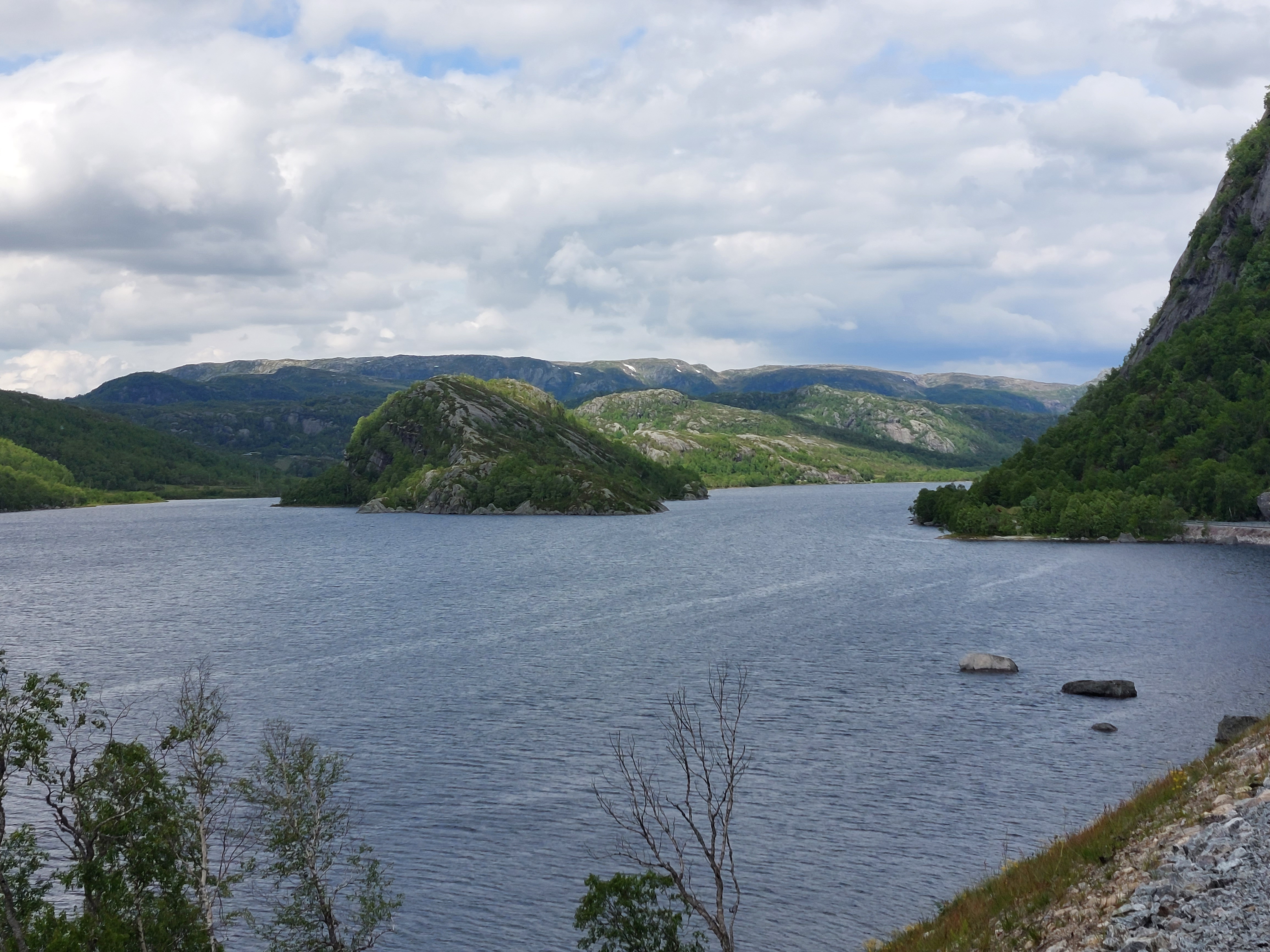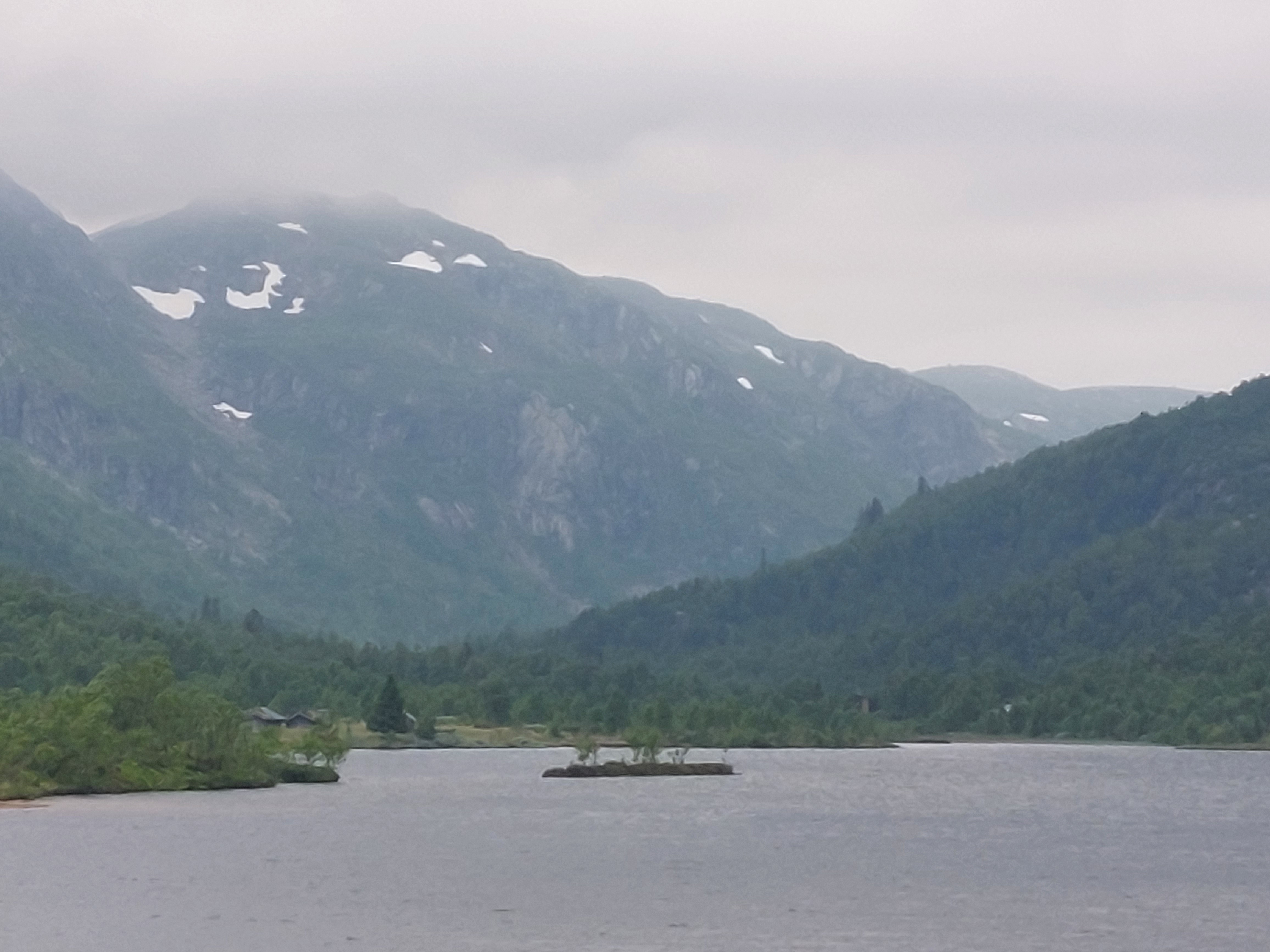 De dagen daarna fietsten we over mooie, kleine weggetjes via Kvinesdal en Tonstad omhoog naar Adneram. We hadden prachtig zonnig en warm weer, dus dat was wel een meevaller. Vanaf daar kom je op een hoogvlakte waar de wind vrij spel heeft en er op veel plekken nog (wat) sneeuw ligt. Een prachtige omgeving die mede door de dreigende wolken en de harde wind nog indrukwekkender werd. We fietsten over de vlakte en daalden aan de andere kant weer af. We moesten door naar de plaats Dalen omdat de weg daar naartoe op doordeweekse dagen afgesloten was in verband met werkzaamheden. Het was zondag, dus we moesten wel door, ook omdat het de volgende dag de hele dag zou regenen. We wilden dan wel ergens op een camping zijn. Er kwam dus nog een lange klim bij, maar het was wel weer een heel mooi stuk. Aan het eind wachtte een steile afdaling voor we het dorp in rolden. De volgende dag heeft het inderdaad zo ongeveer de hele dag geregend, dus we waren blij dat we daar waren.