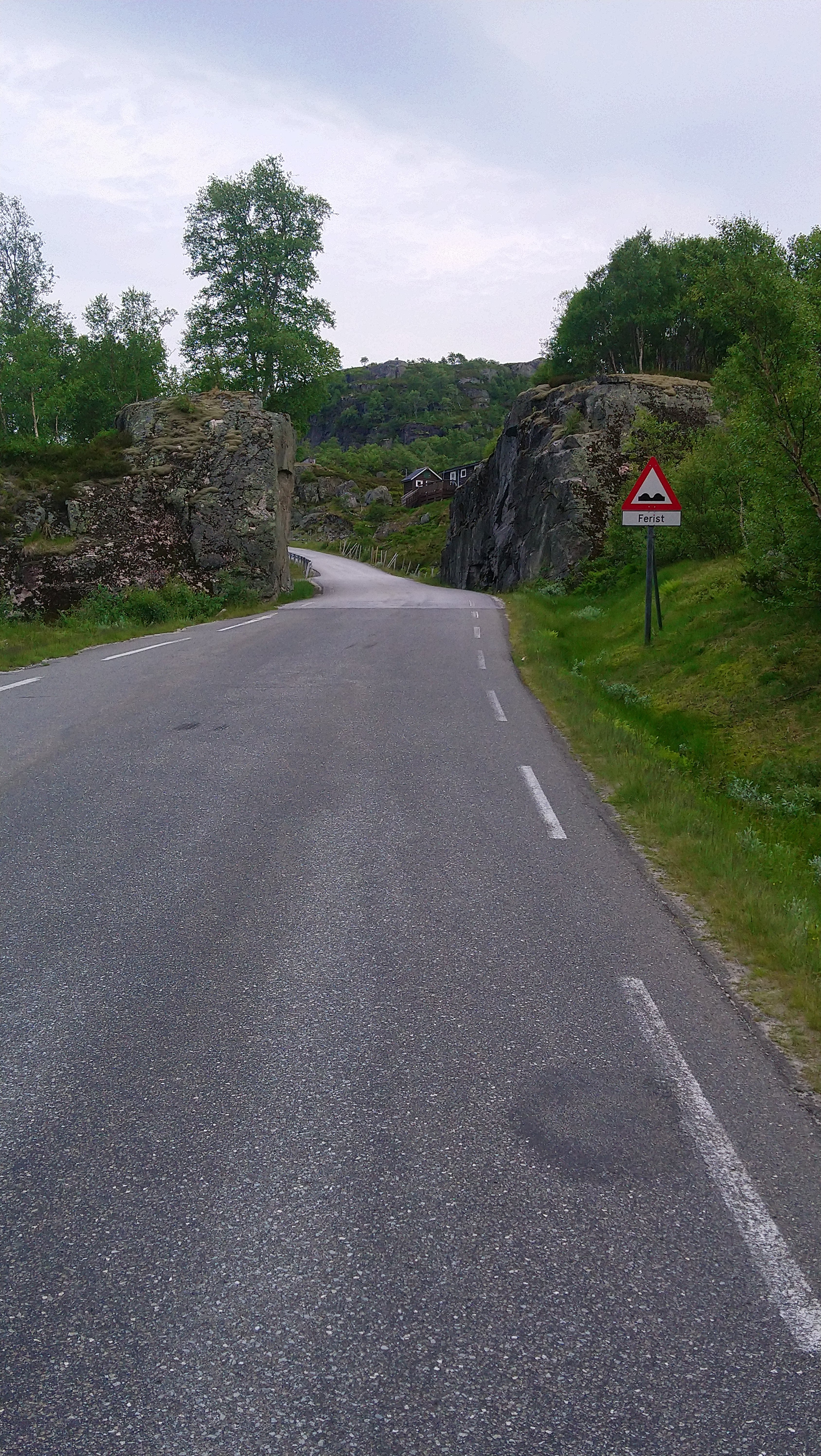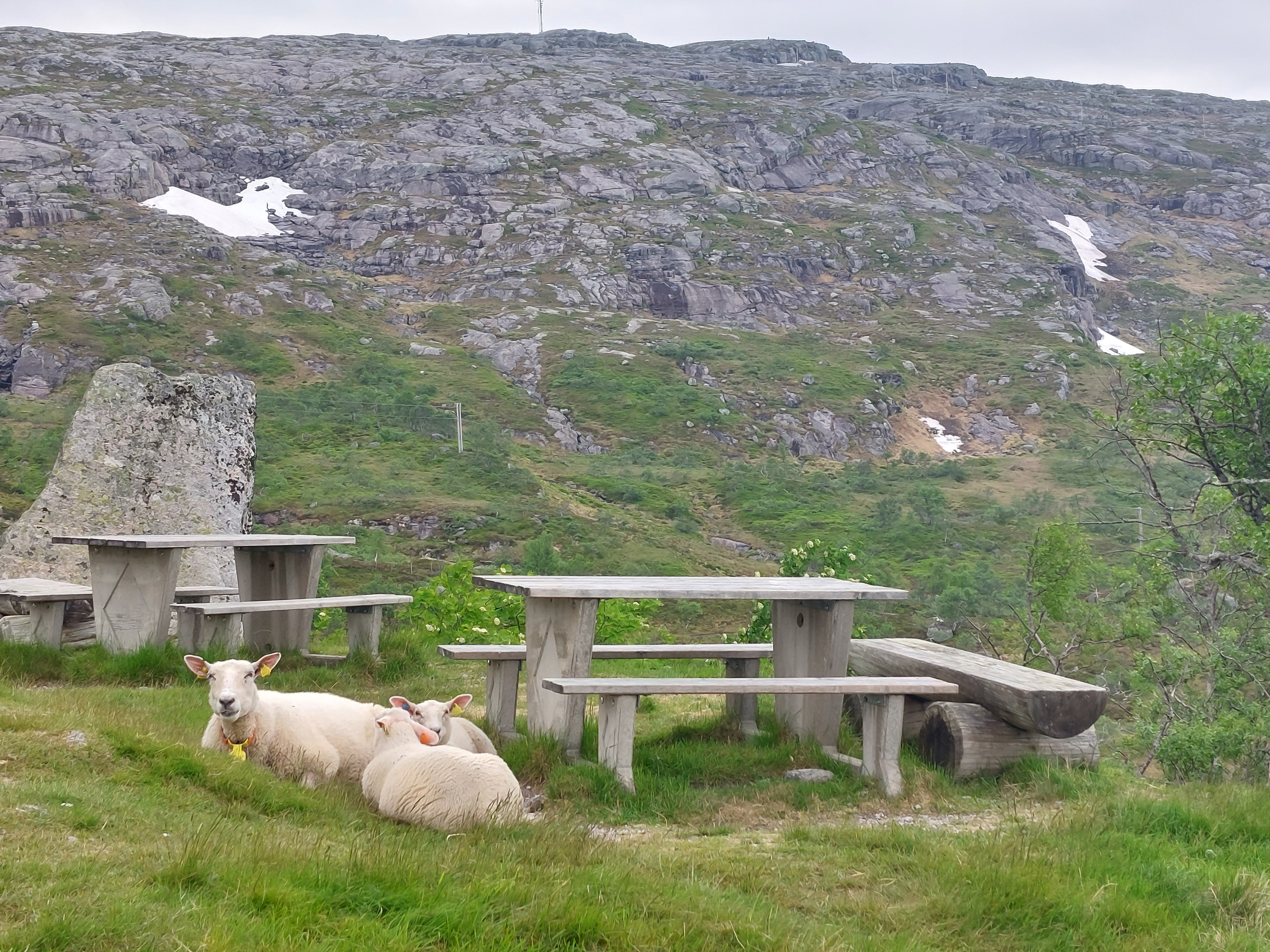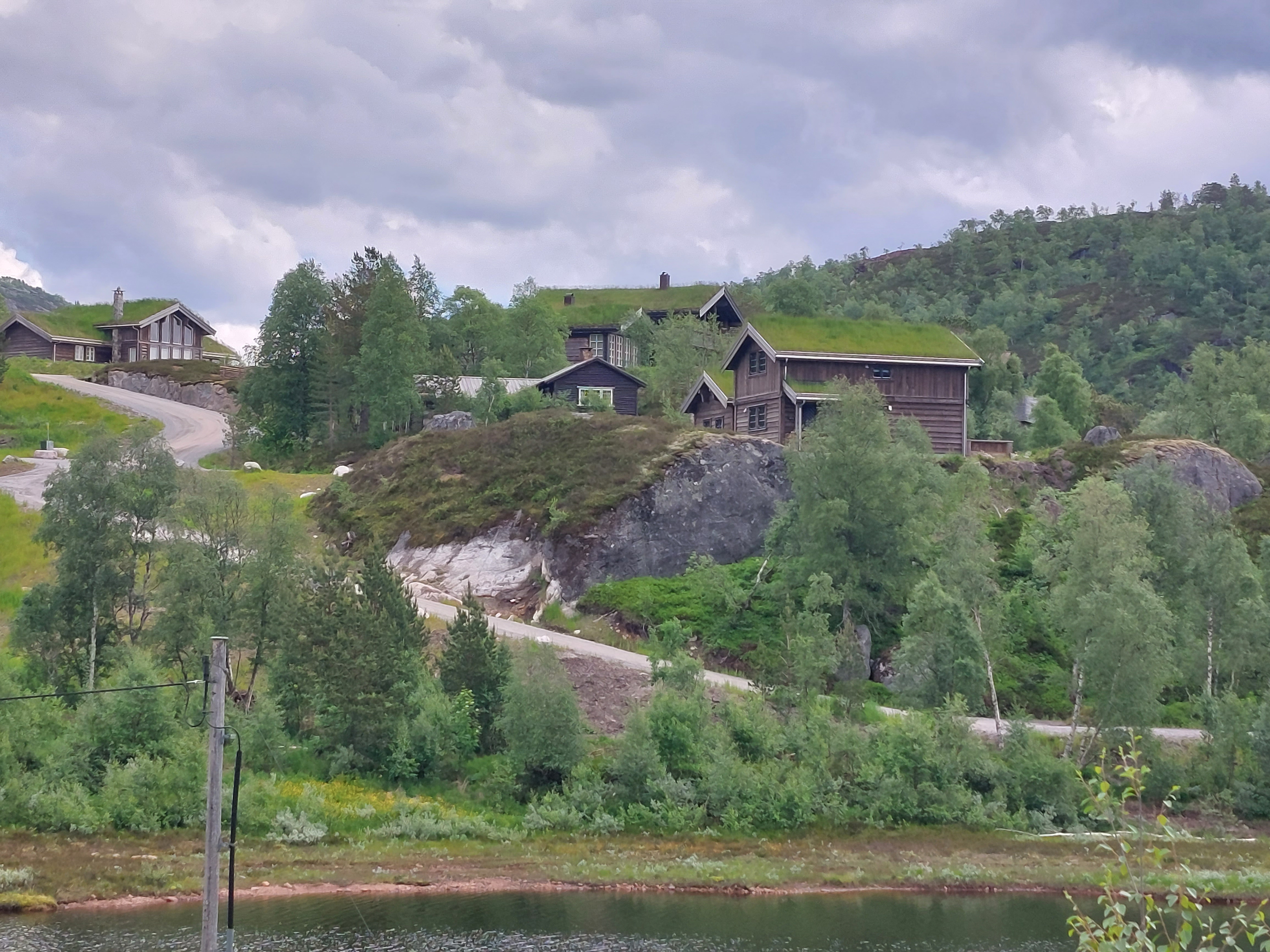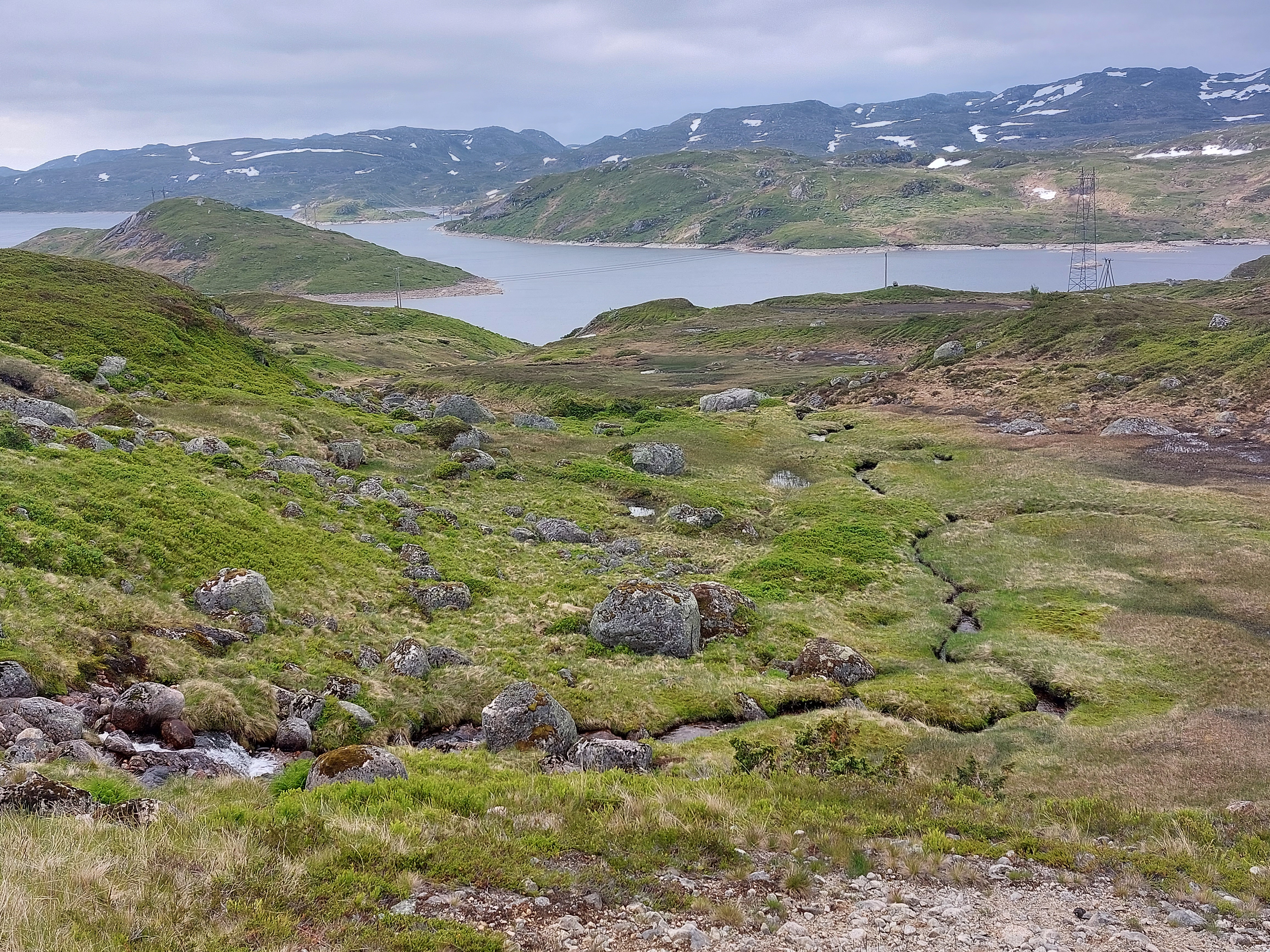 De dagen daarna fietsten we over mooie, kleine weggetjes via Kvinesdal en Tonstad omhoog naar Adneram. We hadden prachtig zonnig en warm weer, dus dat was wel een meevaller. Vanaf daar kom je op een hoogvlakte waar de wind vrij spel heeft en er op veel plekken nog (wat) sneeuw ligt. Een prachtige omgeving die mede door de dreigende wolken en de harde wind nog indrukwekkender werd. We fietsten over de vlakte en daalden aan de andere kant weer af. We moesten door naar de plaats Dalen omdat de weg daar naartoe op doordeweekse dagen afgesloten was in verband met werkzaamheden. Het was zondag, dus we moesten wel door, ook omdat het de volgende dag de hele dag zou regenen. We wilden dan wel ergens op een camping zijn. Er kwam dus nog een lange klim bij, maar het was wel weer een heel mooi stuk. Aan het eind wachtte een steile afdaling voor we het dorp in rolden. De volgende dag heeft het inderdaad zo ongeveer de hele dag geregend, dus we waren blij dat we daar waren.