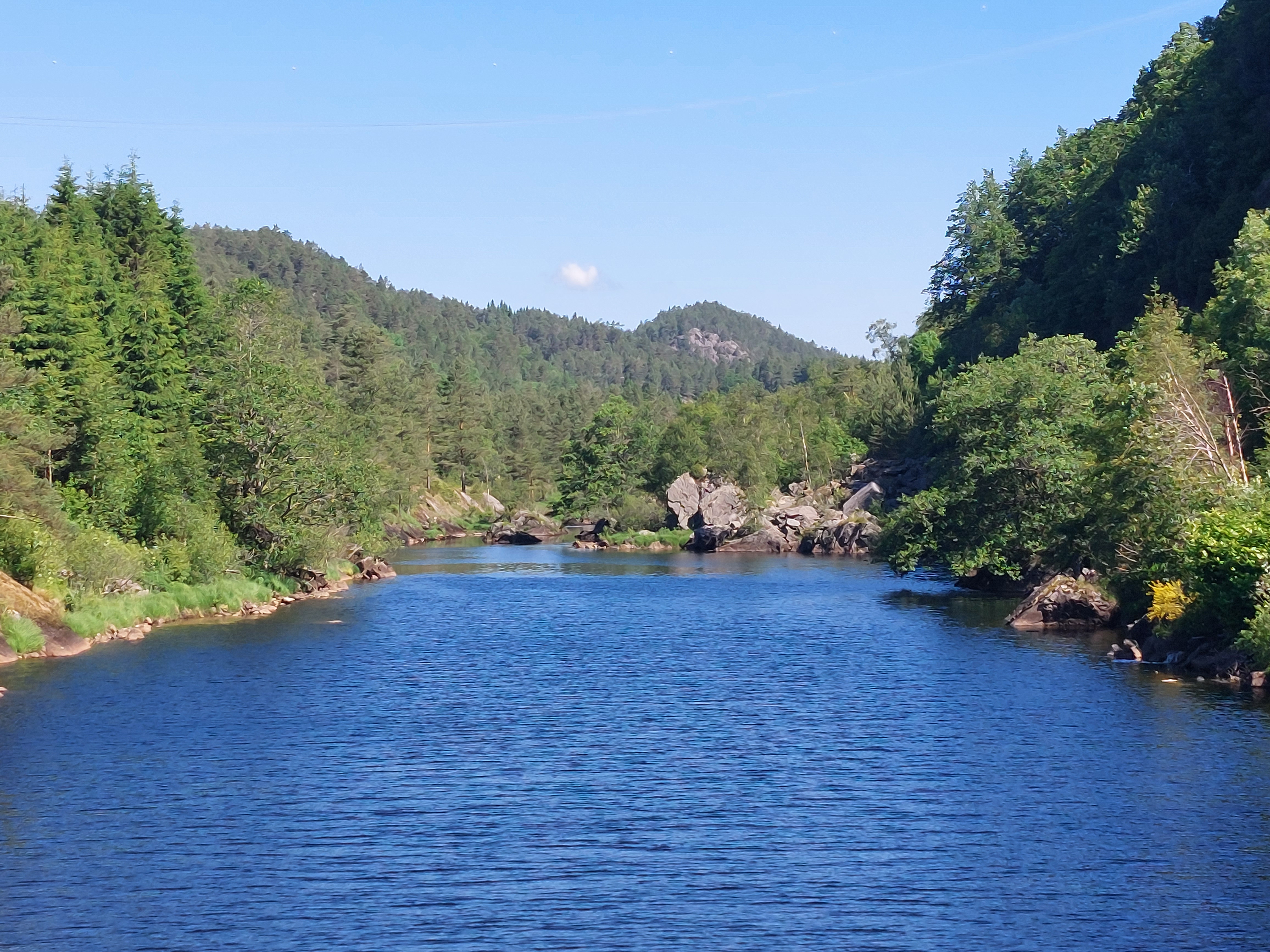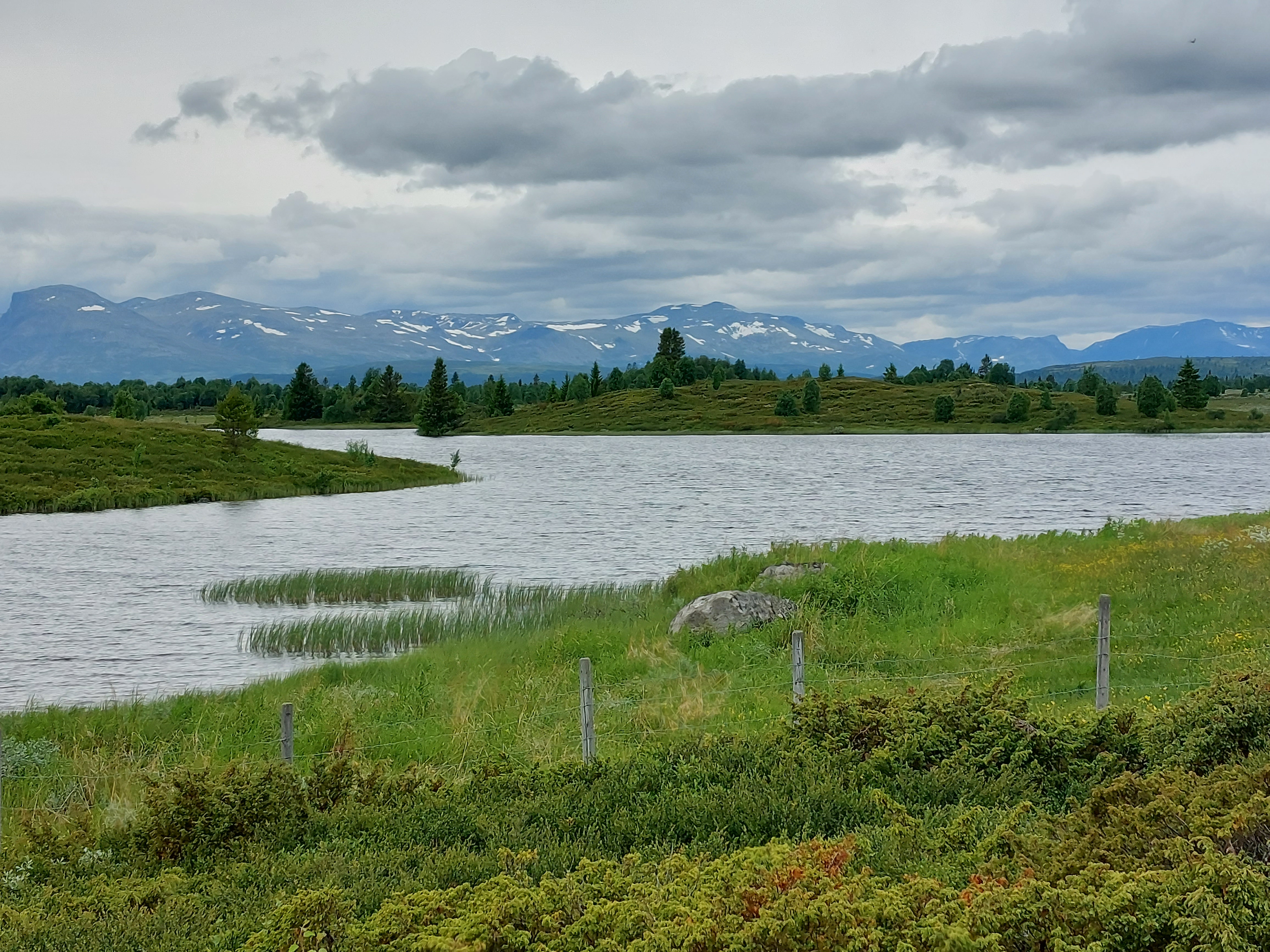 Na die regenachtige dag was de lucht weer schoon gespoeld en was het weer prachtig weer. De lucht was ook lekker opgefrist, dus het was heerlijk fietsweer en dat bleef de dagen daarna ook zo. We fietsten via Austbygde naar de energiecentrale van Rjukan en daarna met heel veel klimmen naar Dagali vanwaar we doorfietsten naar Gol. De omgeving bleef prachtig, met veel klimmen en met bossen, meren, besneeuwde bergen aan de horizon en weer een prachtige hoogvlakte.
