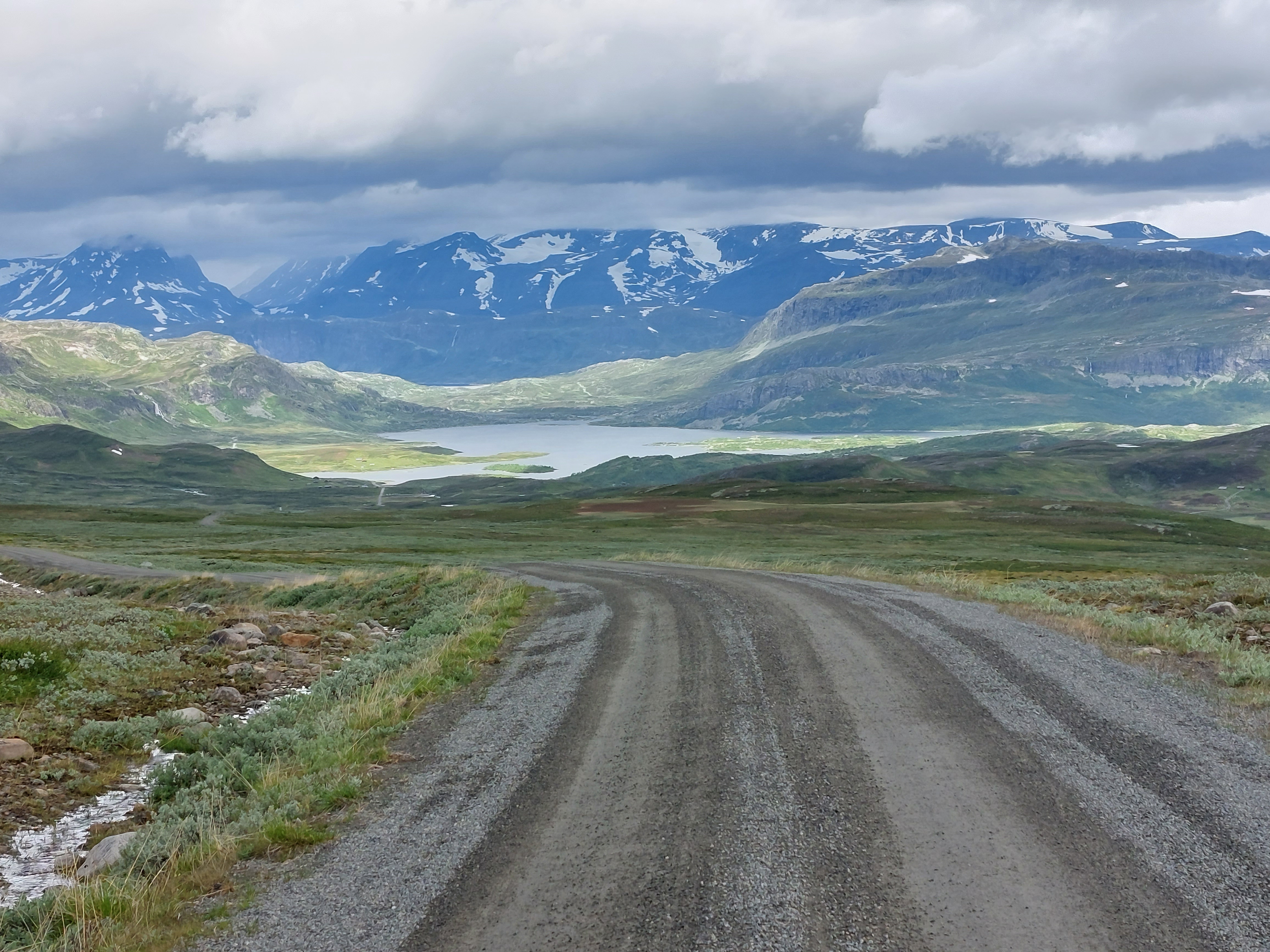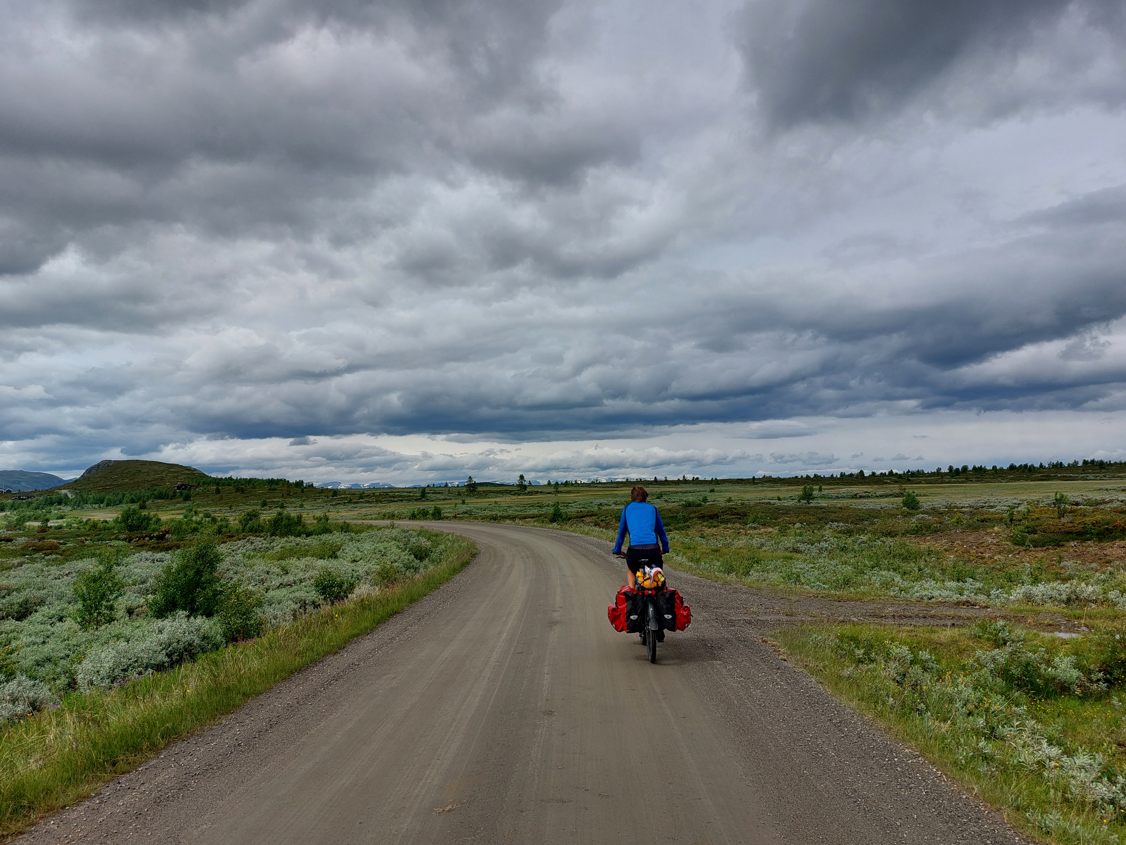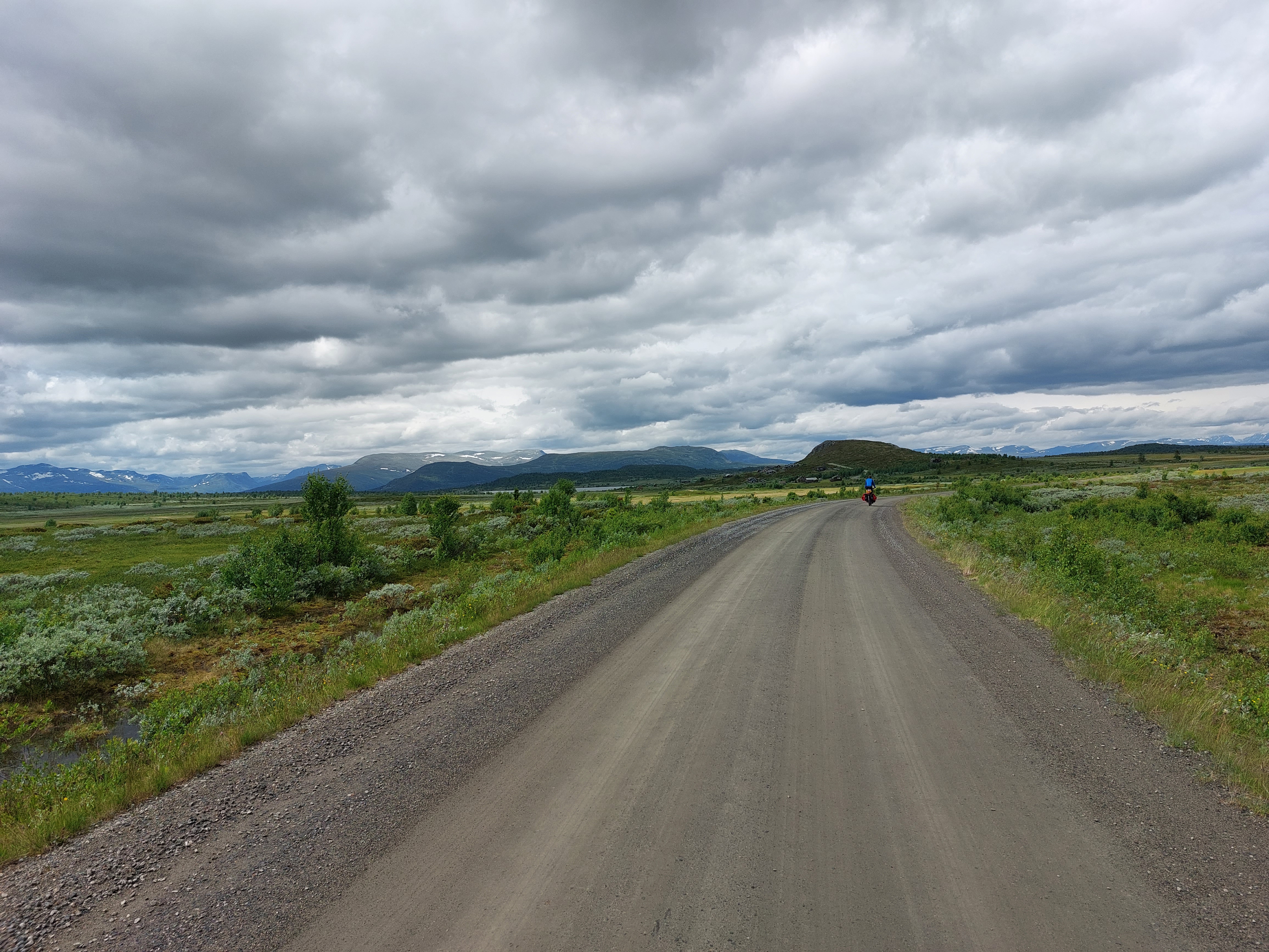 Vanaf Beitostolen volg je Jotunheimvegen. Dat is ook een (bekende) onverharde route die we ook al een keer eerder gereden hadden. Ook deze route gaat weer door de natuur en over (soms heuvelige) hoogvlaktes. Helaas was het gedaan met ons geluk om de regen voor te blijven. Net toen we na een lange klim boven kwamen begon het toch echt te regenen. En het werd ook niet meer droog. Gelukkig hadden we het meeste klimmen al gehad en ging het meeste vanaf daar naar beneden. We wilden eigenlijk een mooi wildkampeer plekje zoeken langs de route, maar door de regen hebben we daar maar vanaf gezien. In Skabu hebben we een camping opgezocht waar we lekker binnen konden zitten en konden opwarmen onder een warme douche.