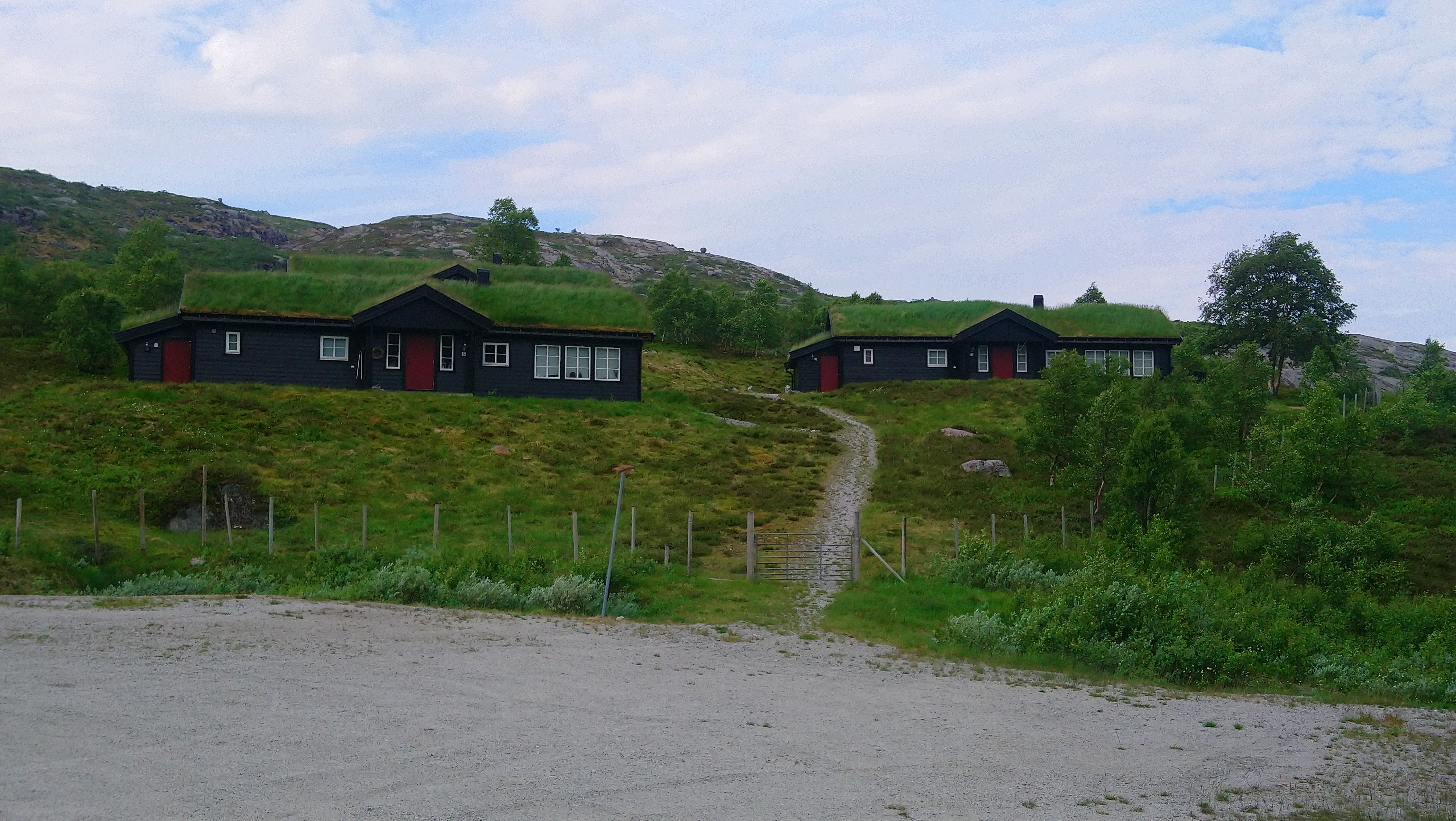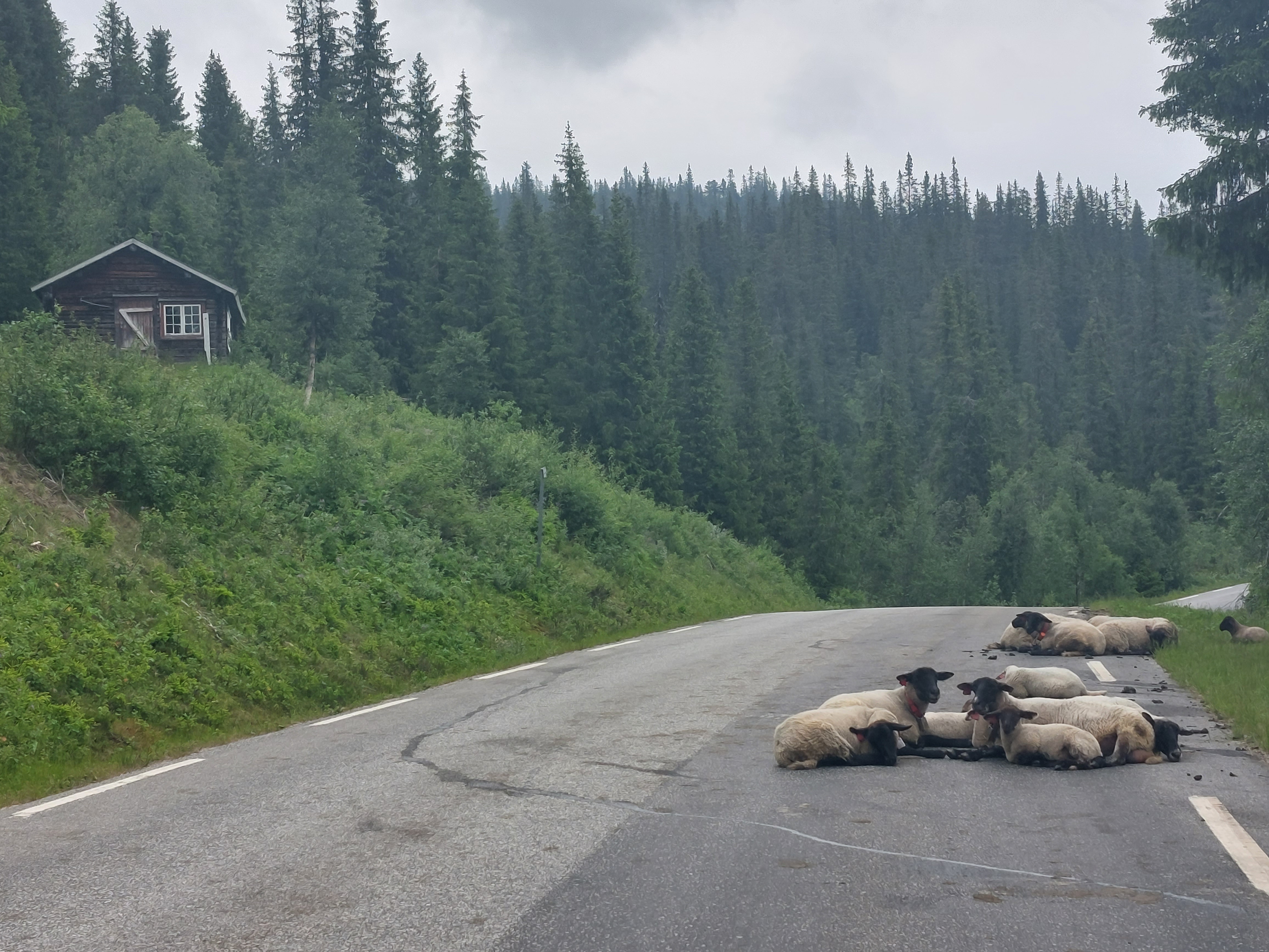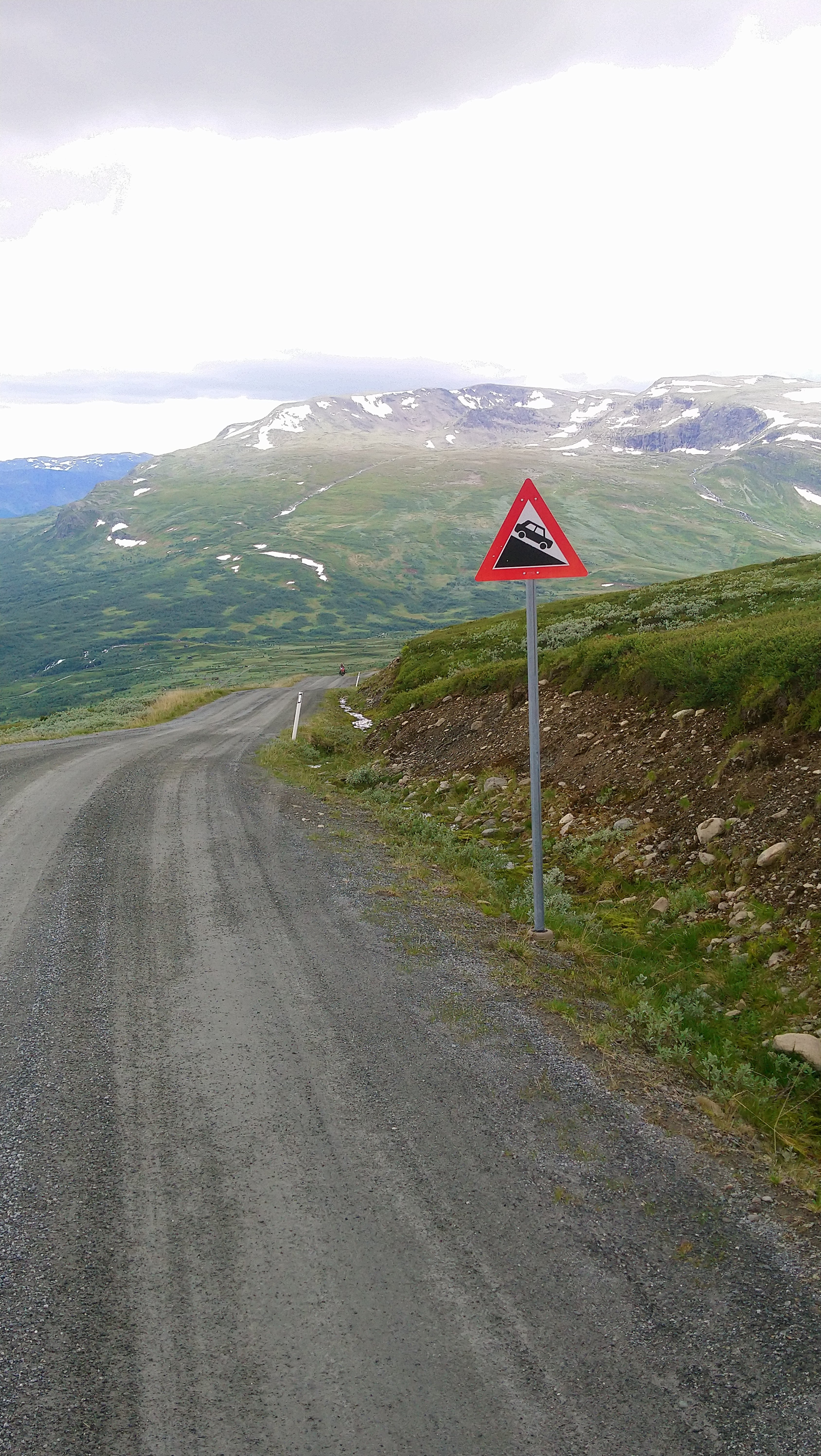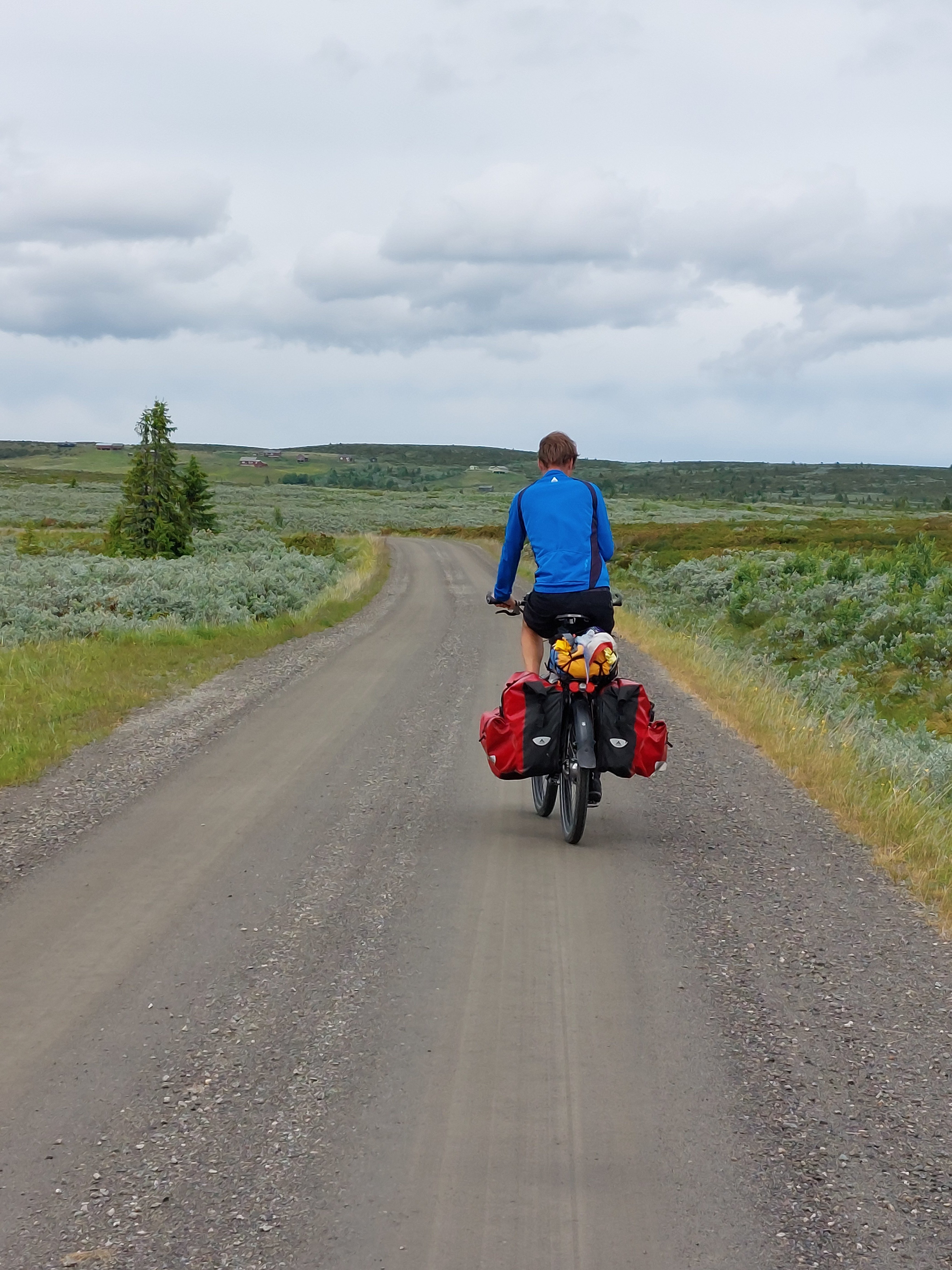 Vanaf Beitostolen volg je Jotunheimvegen. Dat is ook een (bekende) onverharde route die we ook al een keer eerder gereden hadden. Ook deze route gaat weer door de natuur en over (soms heuvelige) hoogvlaktes. Helaas was het gedaan met ons geluk om de regen voor te blijven. Net toen we na een lange klim boven kwamen begon het toch echt te regenen. En het werd ook niet meer droog. Gelukkig hadden we het meeste klimmen al gehad en ging het meeste vanaf daar naar beneden. We wilden eigenlijk een mooi wildkampeer plekje zoeken langs de route, maar door de regen hebben we daar maar vanaf gezien. In Skabu hebben we een camping opgezocht waar we lekker binnen konden zitten en konden opwarmen onder een warme douche.