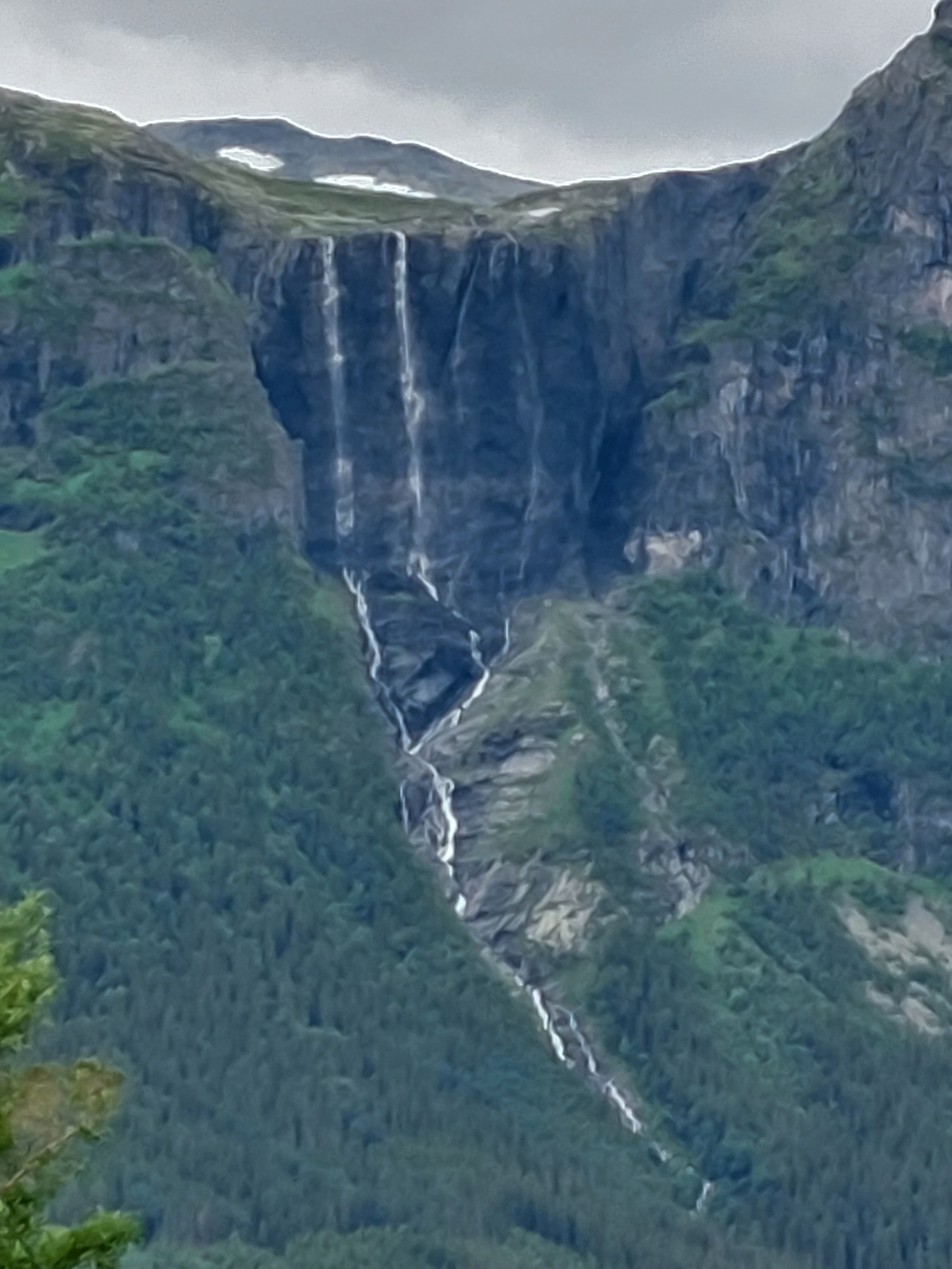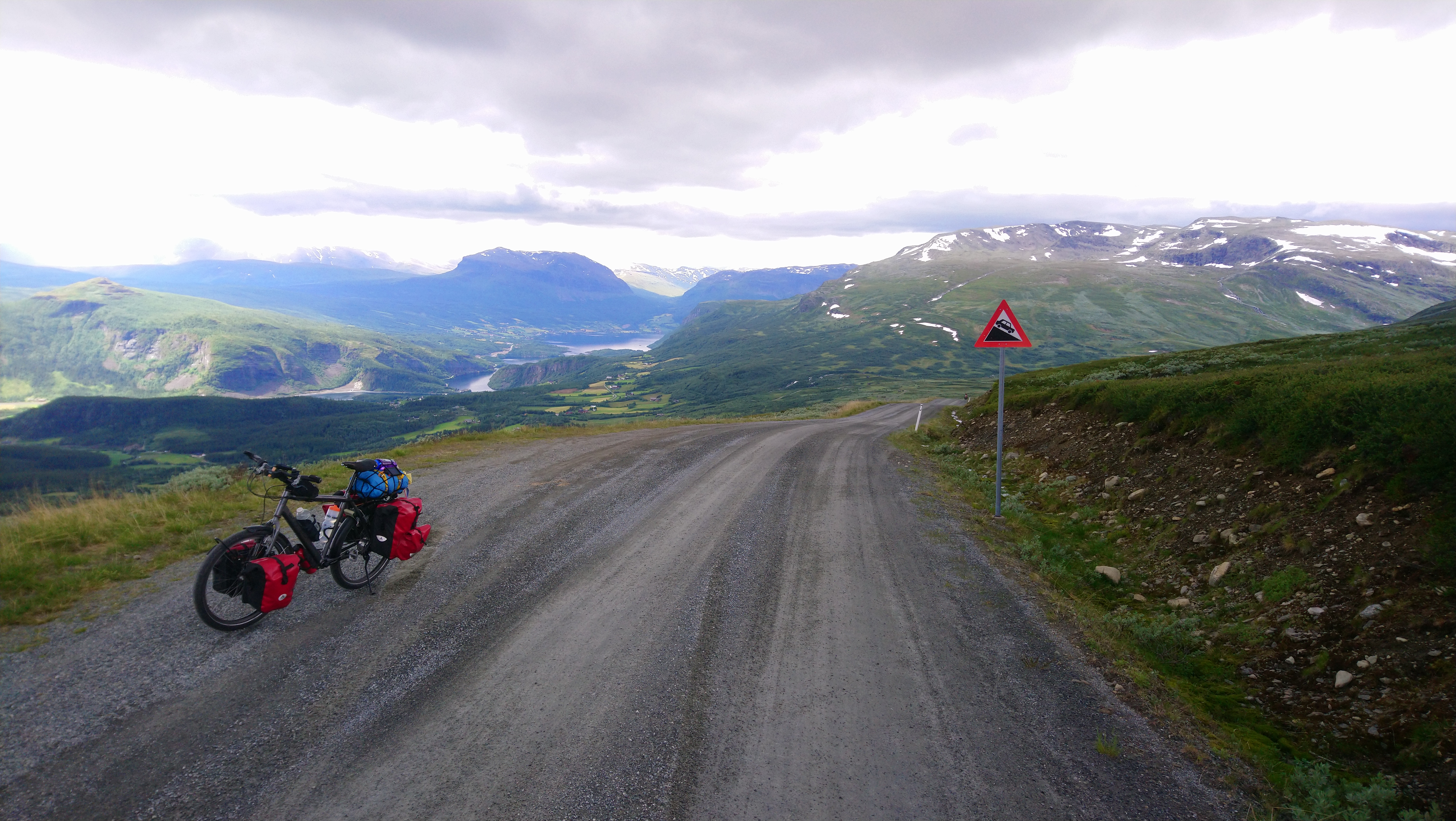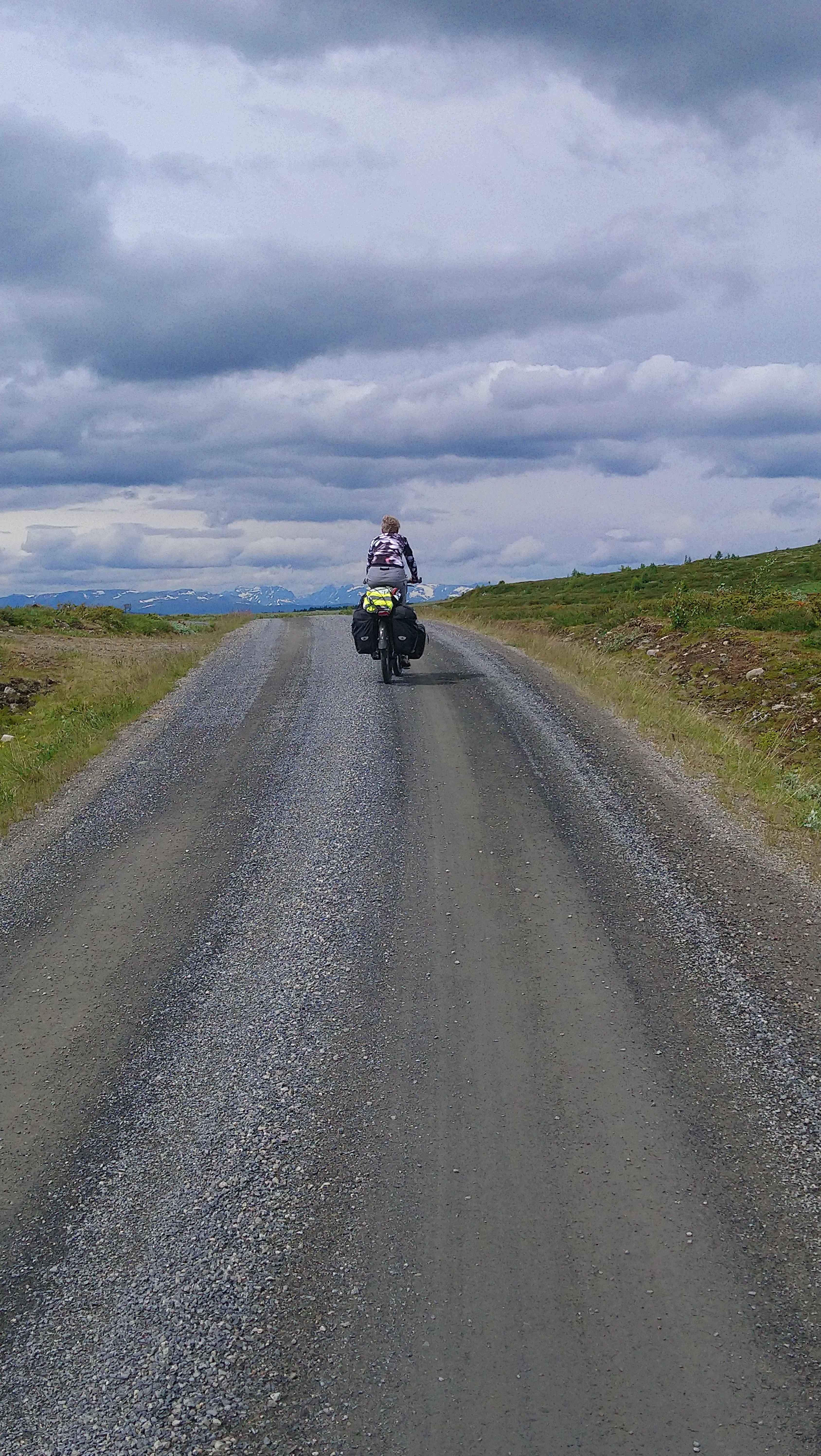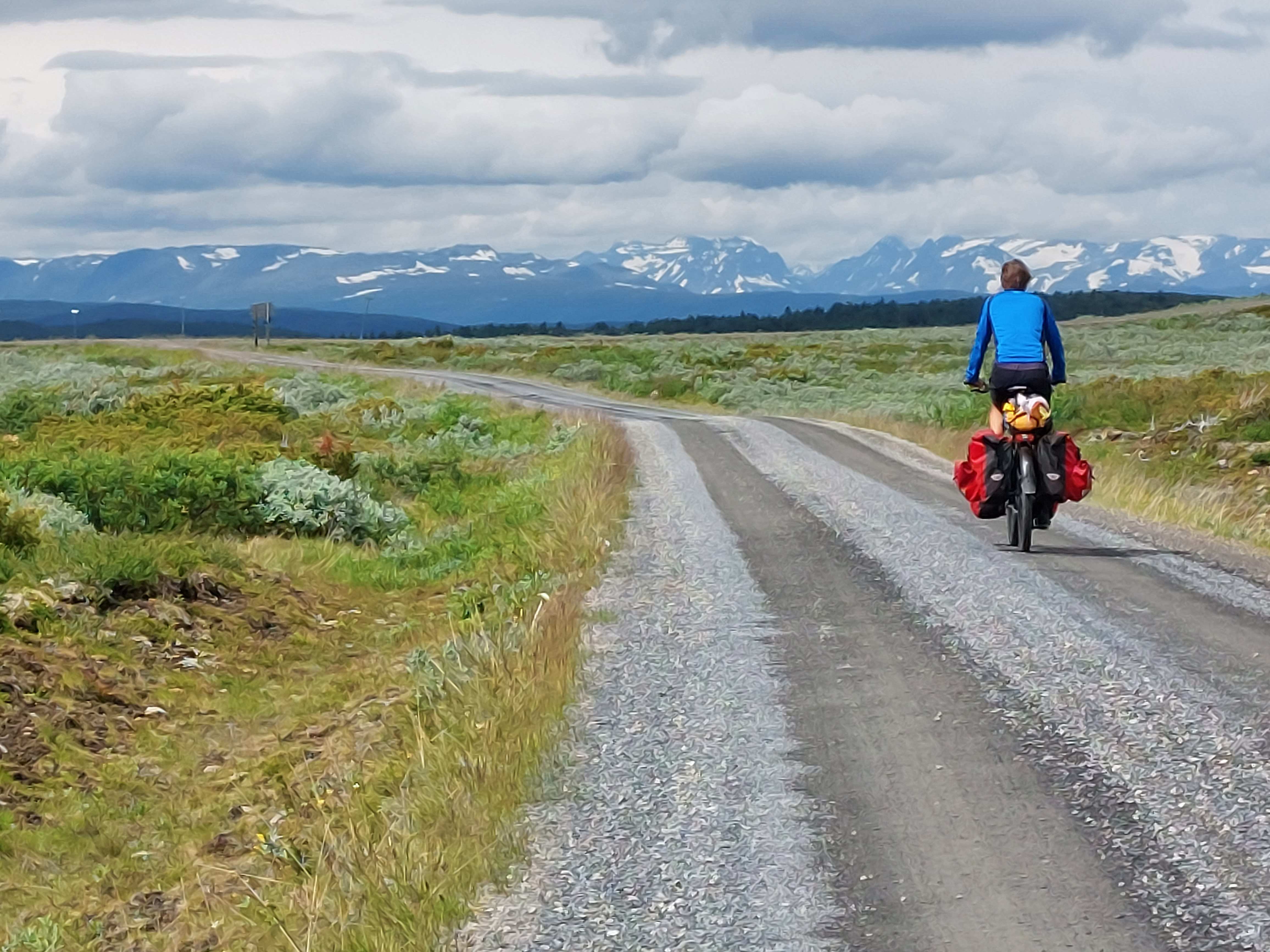 Het begon niet zo goed voor ons, want de dag dat we vertrokken begon het al heel snel te regenen. We besloten daarom om die dag niet verder te gaan omdat we dat zonde zouden vinden voor die mooie route. We hebben dus de dichtstbijzijnde camping opgezocht en zijn daar de rest van de dag gebleven. De volgende dag was het bewolkt, maar droog en dus konden we het nog een keer proberen. De ondergrond bestond eigenlijk uit hard zand, dus het was niet heel zwaar fietsen, en langzaam kwamen we hoger, tot we weer op bijna 1000 meter hoogte waren. De omgeving was weer prachtig en we hadden een schitterend uitzicht op de besneeuwde bergen om ons heen. Na een lange dag met in het laatste stuk nog heel veel heuvels en met de dreigende regen achter ons, kwamen we aan in Ryfoss.