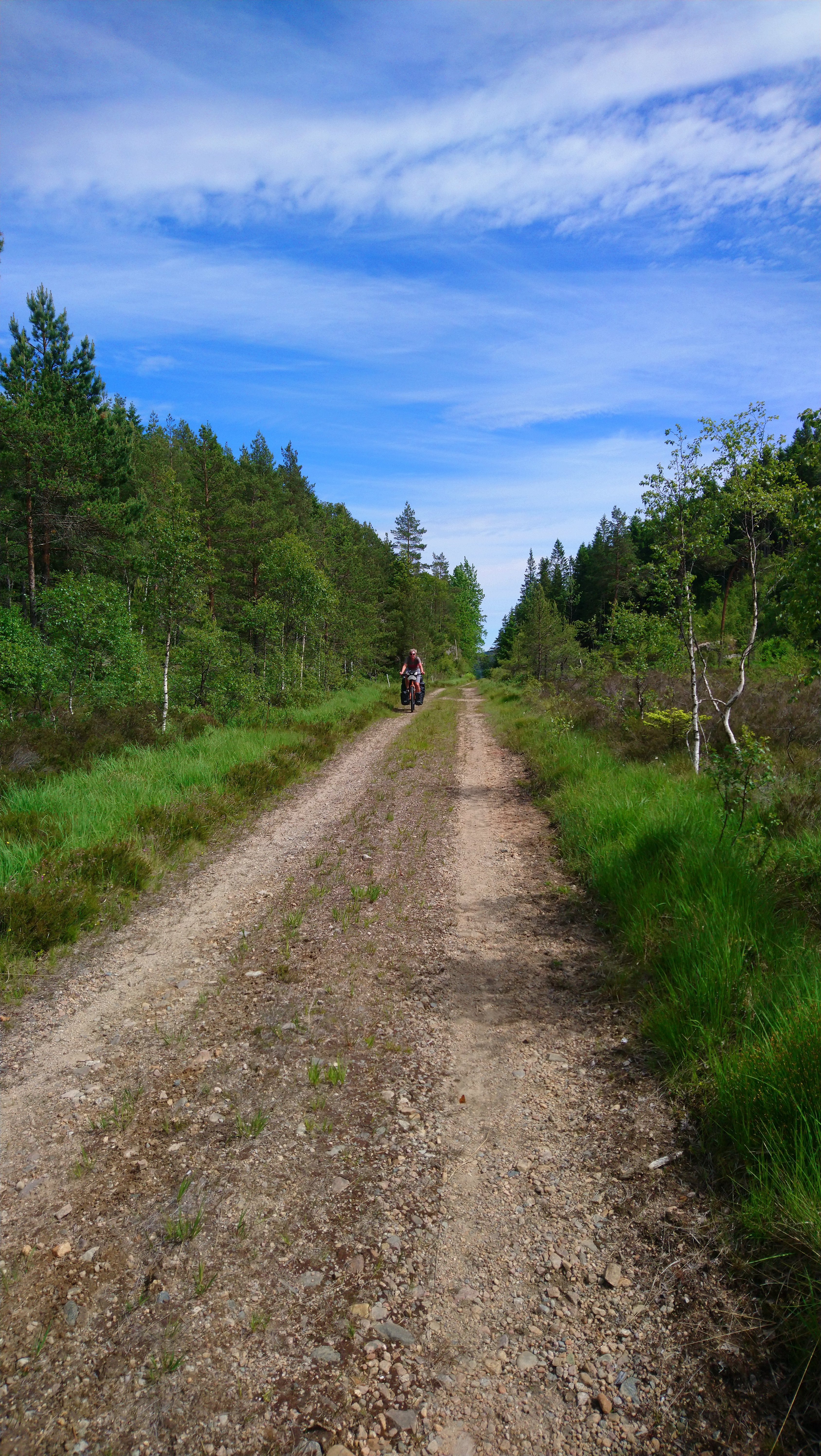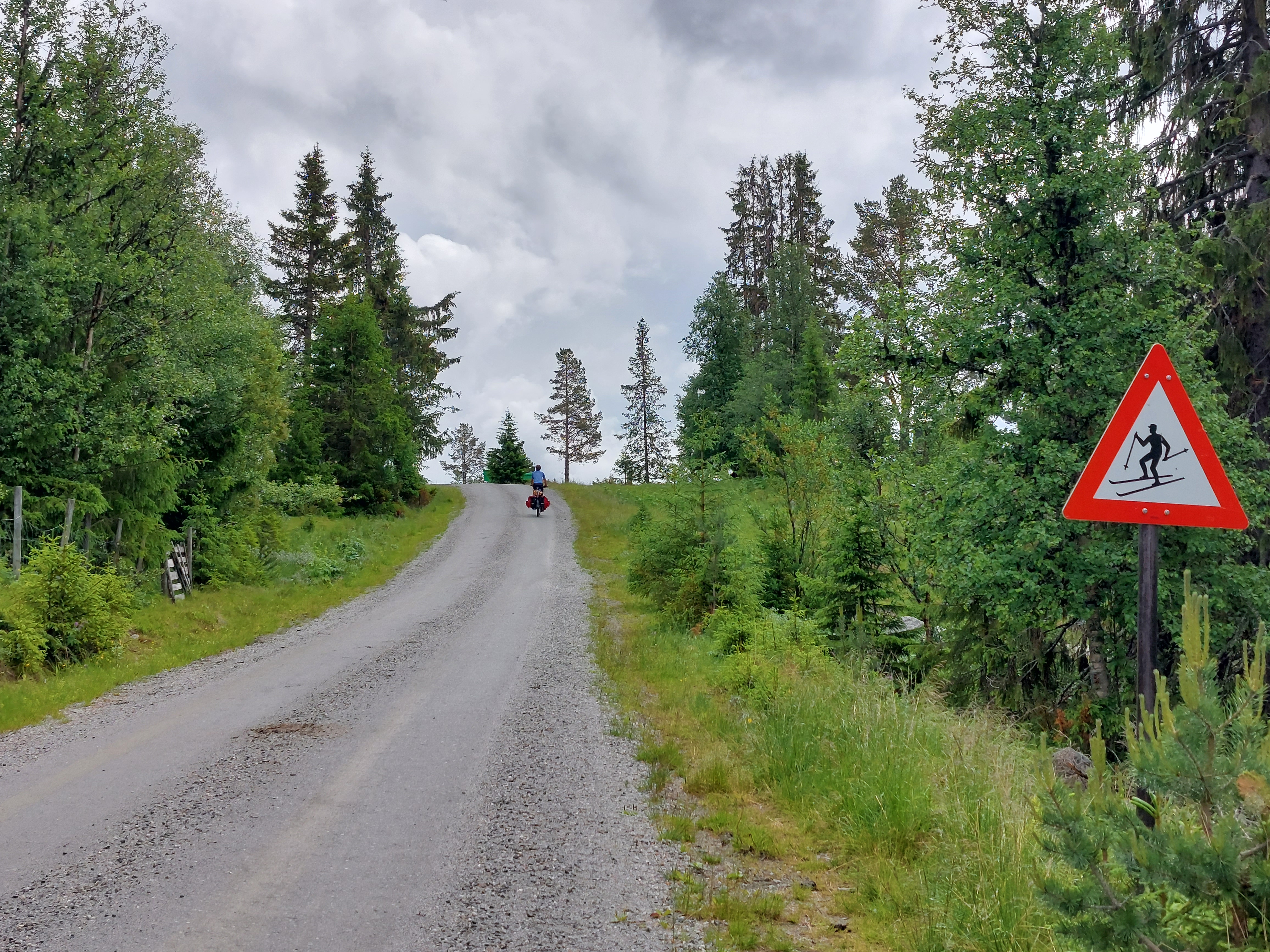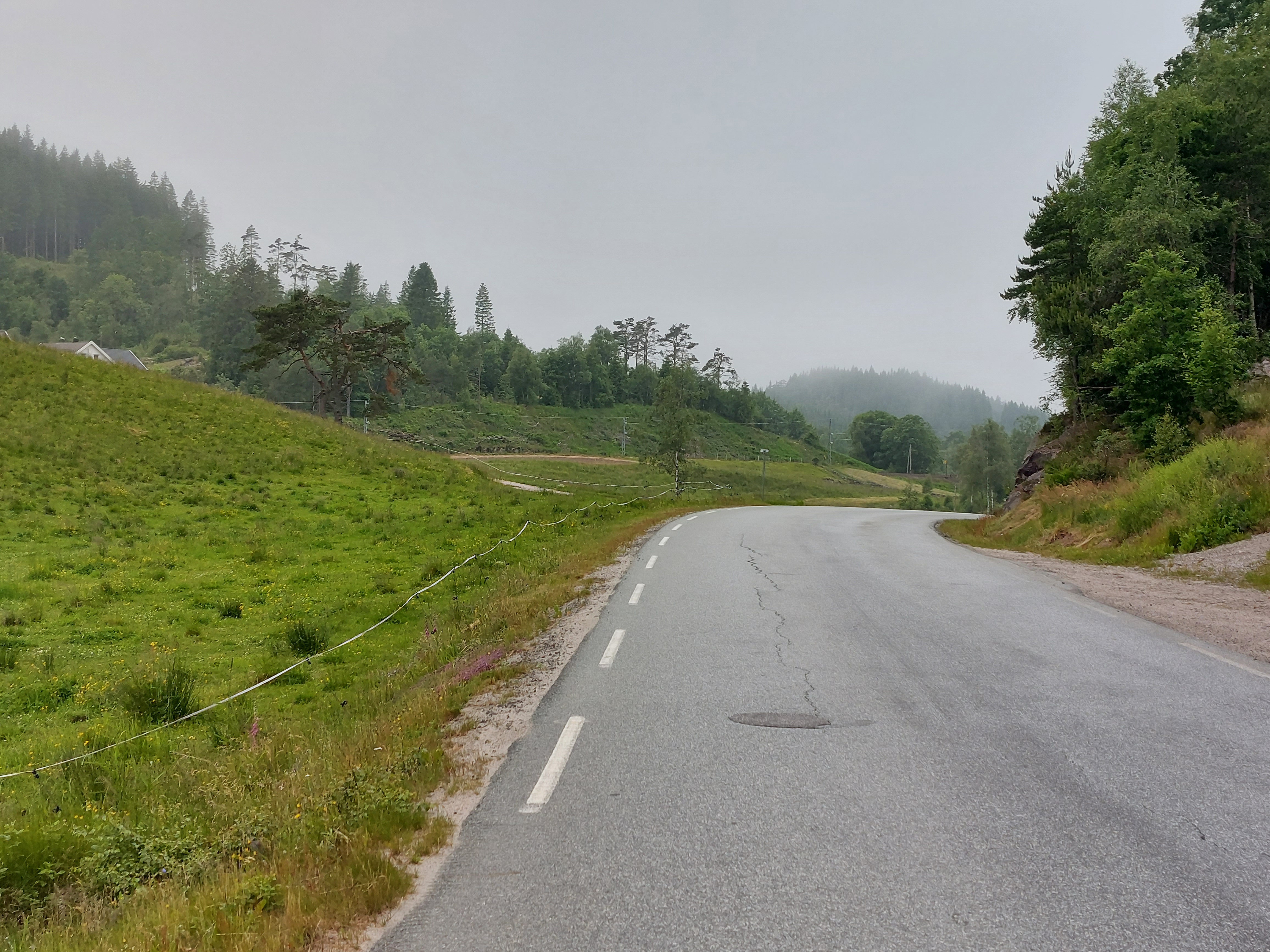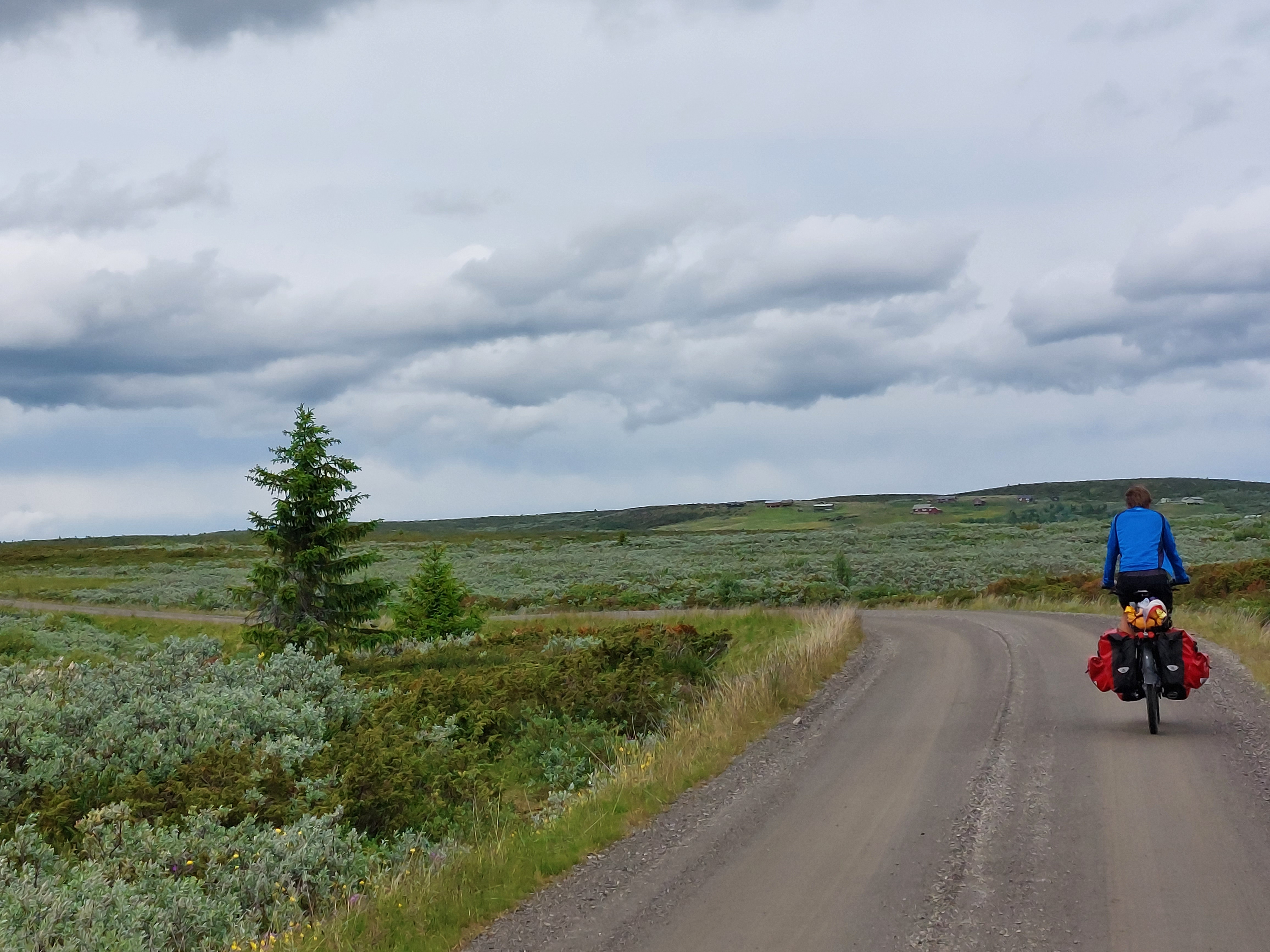 Voor de volgende dag was vanaf ongeveer 1 uur regen voorspelt en we wilden tegen die tijd zo ver mogelijk zijn. Dus we vertrokken vroeg van ons mooie kampeerplekje. Het was koud en de wind waaide hard, maar het was gelukkig droog. Na een aantal kms zijn we van de route af gegaan voor een alternatieve route naar het plaatsje Forset. Dat bleek een goede keus, want het was een heel mooi stuk over een klein weggetje en we zagen er geen enkel ander mens. Het was ook niet heel zwaar om te fietsen omdat bijna alles vlak was of naar beneden ging. We kwamen langs een meer en langs afgelegen boerderijtjes en aan het eind daalden we af naar een prachtig groen dal. We kwamen mooi voor de regen aan in Forset en hebben getwijfeld of we door zouden fietsen naar Dokka of in Forset naar de camping zouden gaan. We wilden eigenlijk door naar Dokka, maar er wachtte ons nog een lange steile klim en de voorspelde regen zat ons inmiddels al op de hielen. We besloten toch om door te gaan.