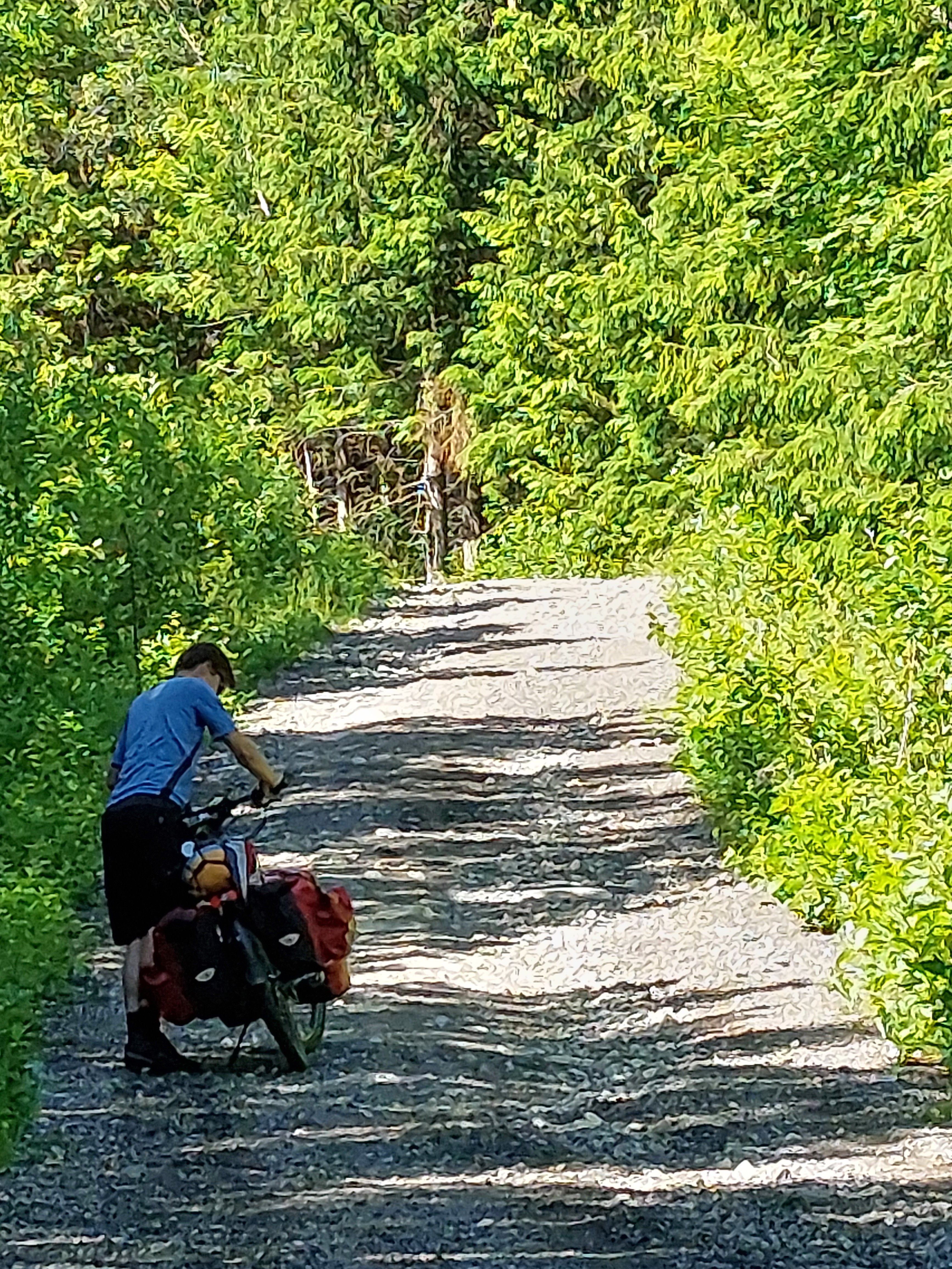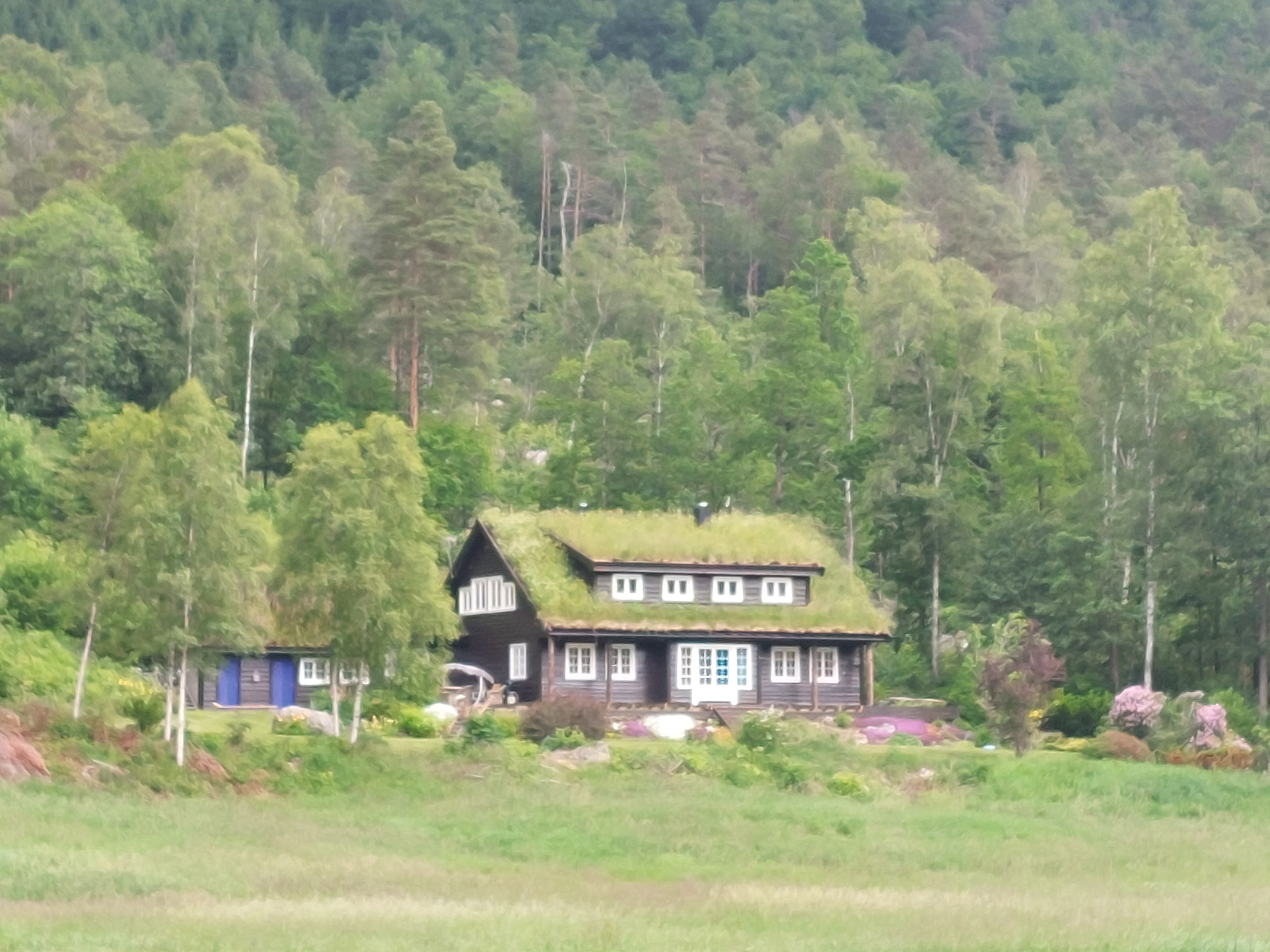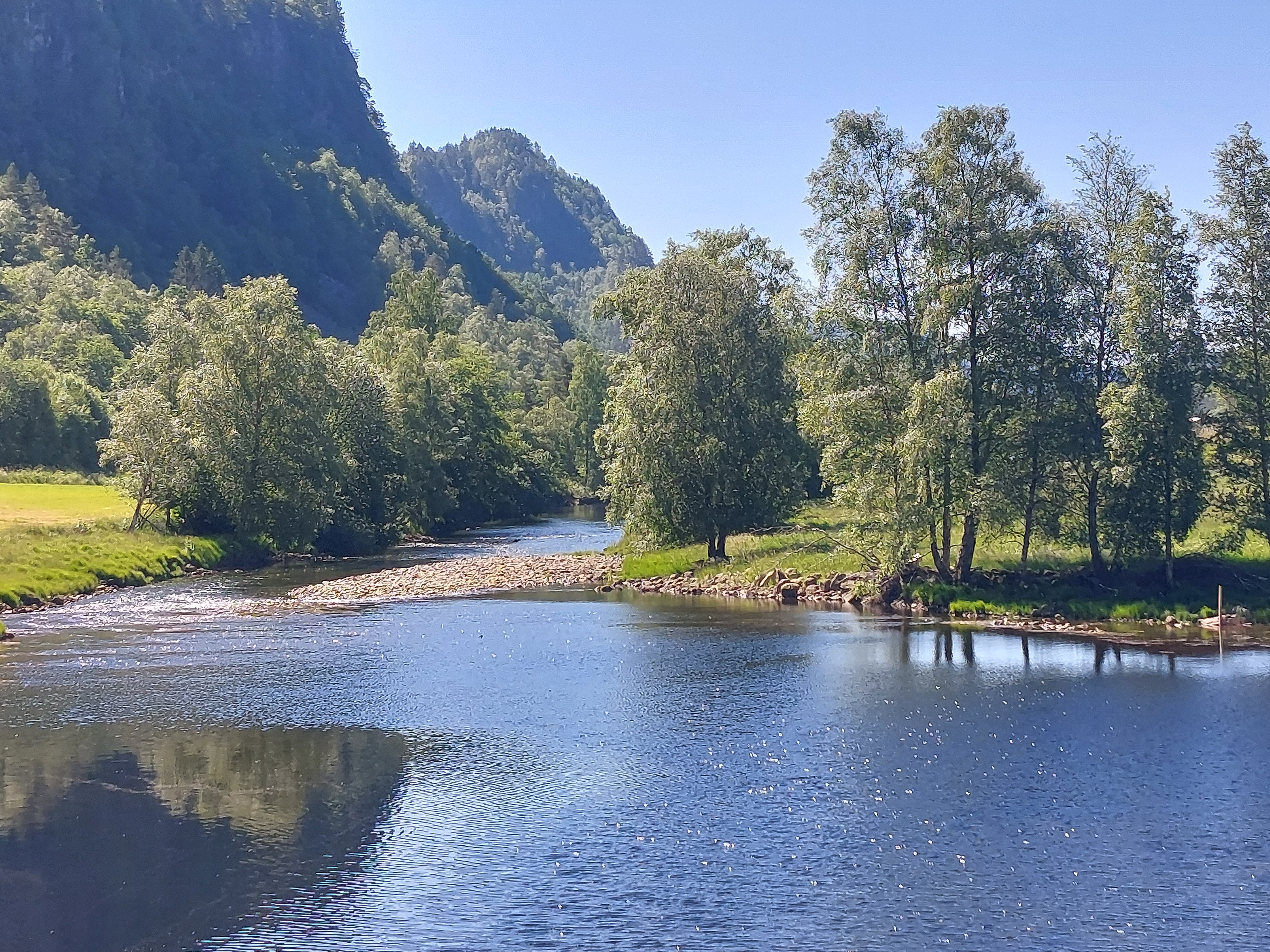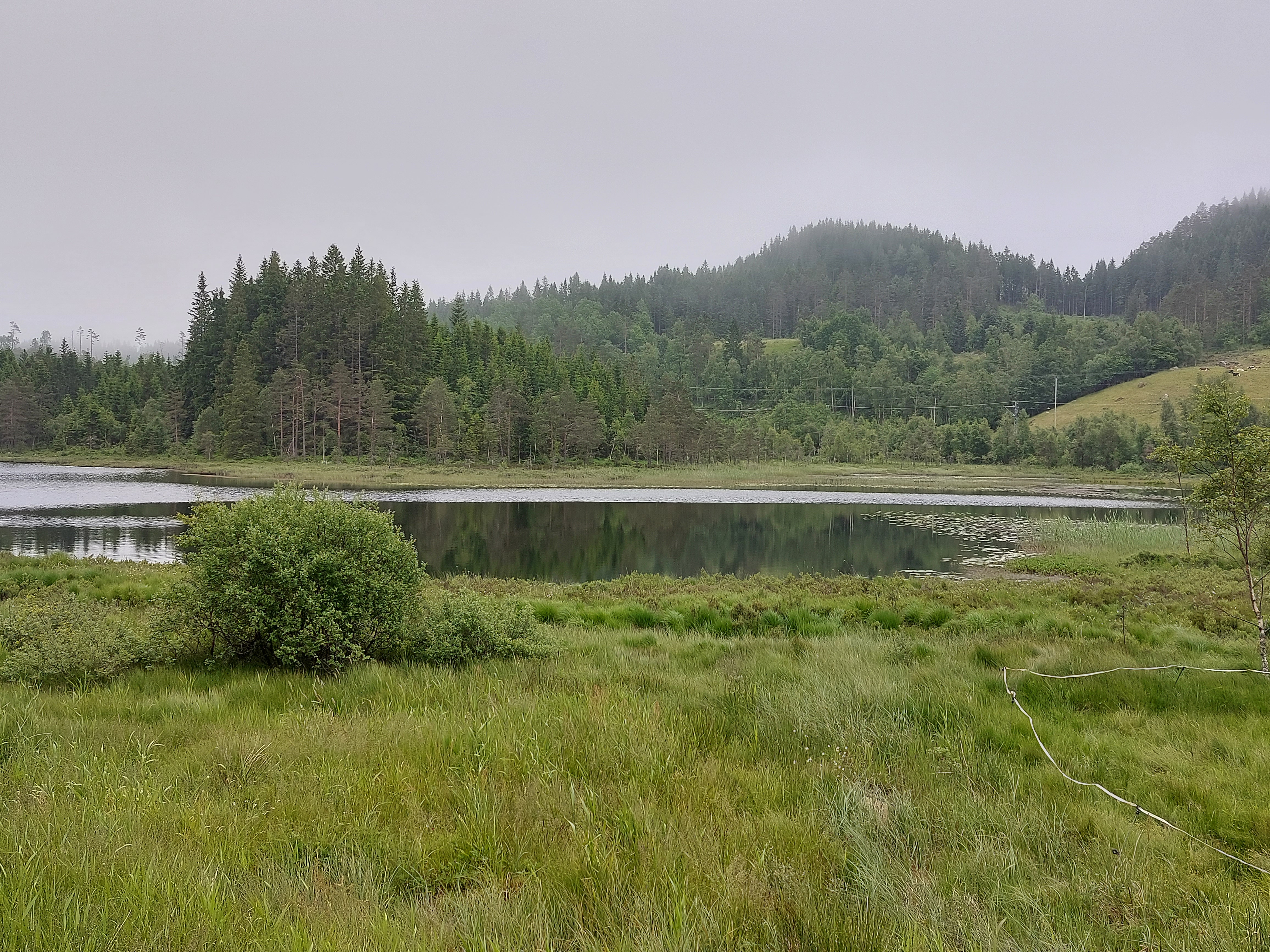 Voor de volgende dag was vanaf ongeveer 1 uur regen voorspelt en we wilden tegen die tijd zo ver mogelijk zijn. Dus we vertrokken vroeg van ons mooie kampeerplekje. Het was koud en de wind waaide hard, maar het was gelukkig droog. Na een aantal kms zijn we van de route af gegaan voor een alternatieve route naar het plaatsje Forset. Dat bleek een goede keus, want het was een heel mooi stuk over een klein weggetje en we zagen er geen enkel ander mens. Het was ook niet heel zwaar om te fietsen omdat bijna alles vlak was of naar beneden ging. We kwamen langs een meer en langs afgelegen boerderijtjes en aan het eind daalden we af naar een prachtig groen dal. We kwamen mooi voor de regen aan in Forset en hebben getwijfeld of we door zouden fietsen naar Dokka of in Forset naar de camping zouden gaan. We wilden eigenlijk door naar Dokka, maar er wachtte ons nog een lange steile klim en de voorspelde regen zat ons inmiddels al op de hielen. We besloten toch om door te gaan.
