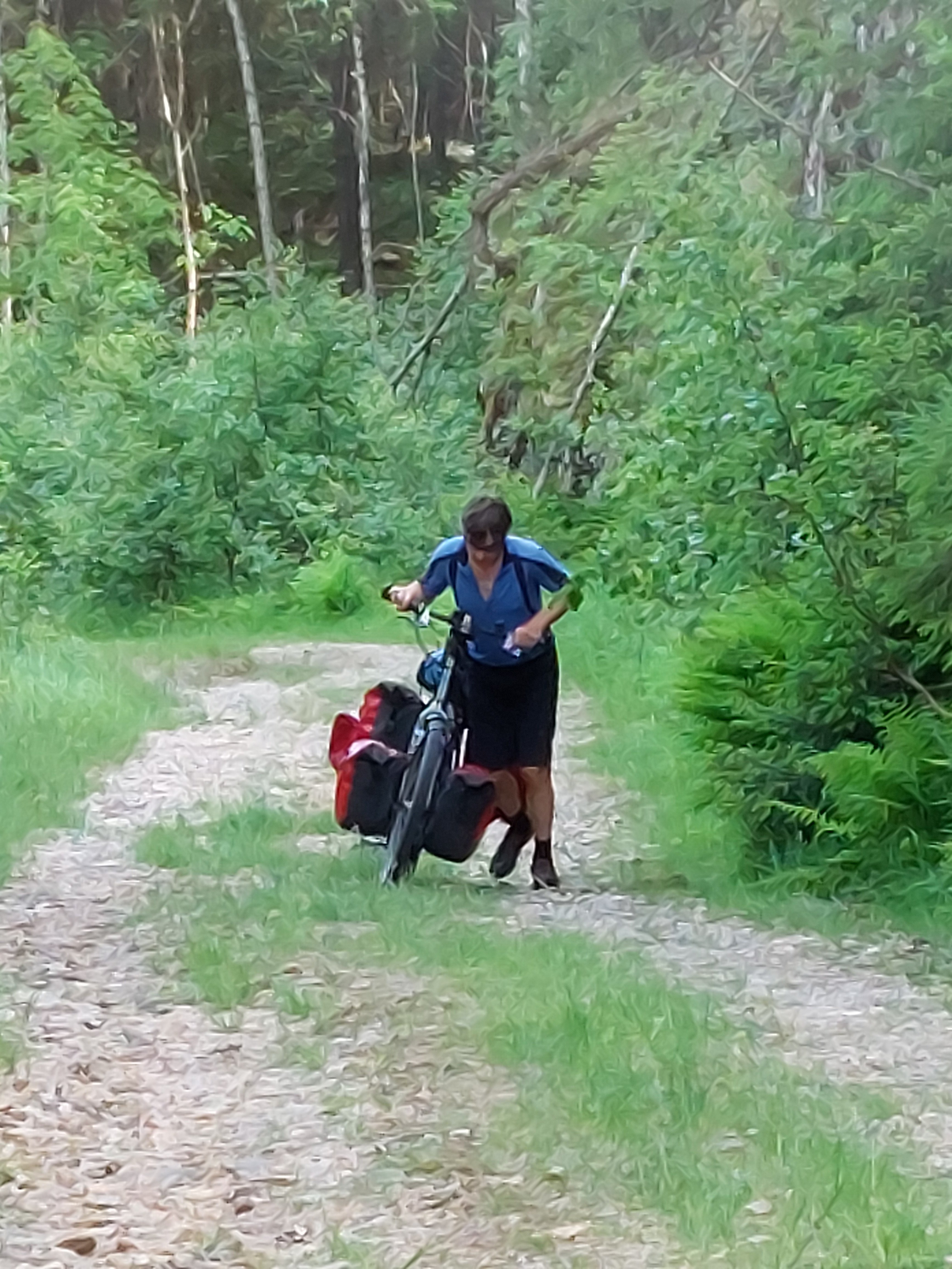Ook de dag erna nog in het hotel gebleven om wat te herstellen en om regelmatig een icepack op het oog/gezicht te leggen. Dat hielp wel, want de volgende dag was het oog weer open. De volgende dag scheen de zon weer, het oog was open en ze voelde zich wat beter dus vertrokken we voor de tweede keer om aan onze tocht te beginnen. Je moet het toch een keer weer proberen. De route was mooi en de heuvels waren steil. We moesten steeds een heuvelrug over en dan daalden we weer af, waarna we aan de andere kant van het dal weer net zo’n heuvelrug over moesten. Veel op en neer dus. Maar het ging redelijk en nu waren we tenminste onderweg. We vonden een leuk klein campinkje en zijn maar vroeg gaan slapen.
