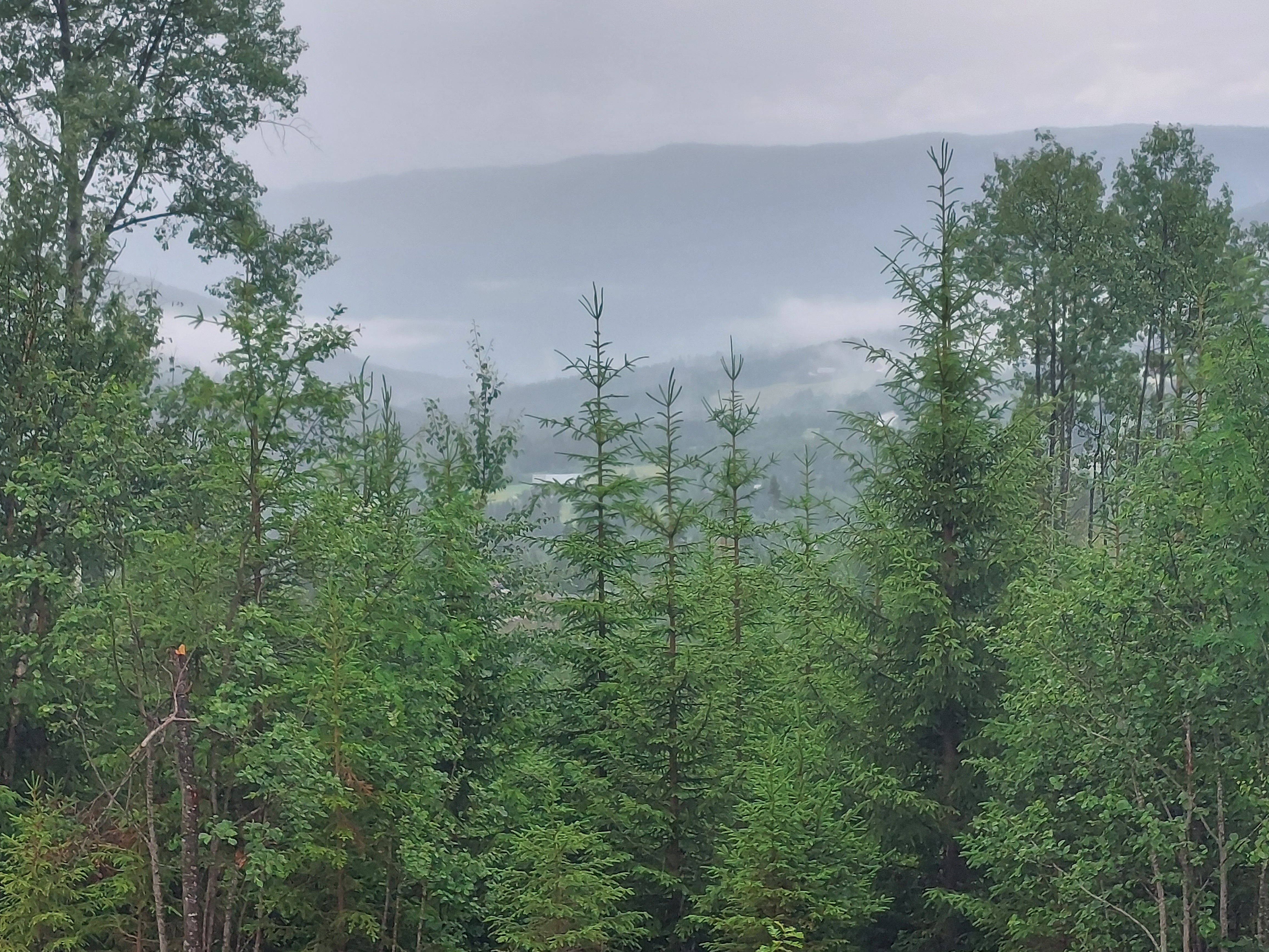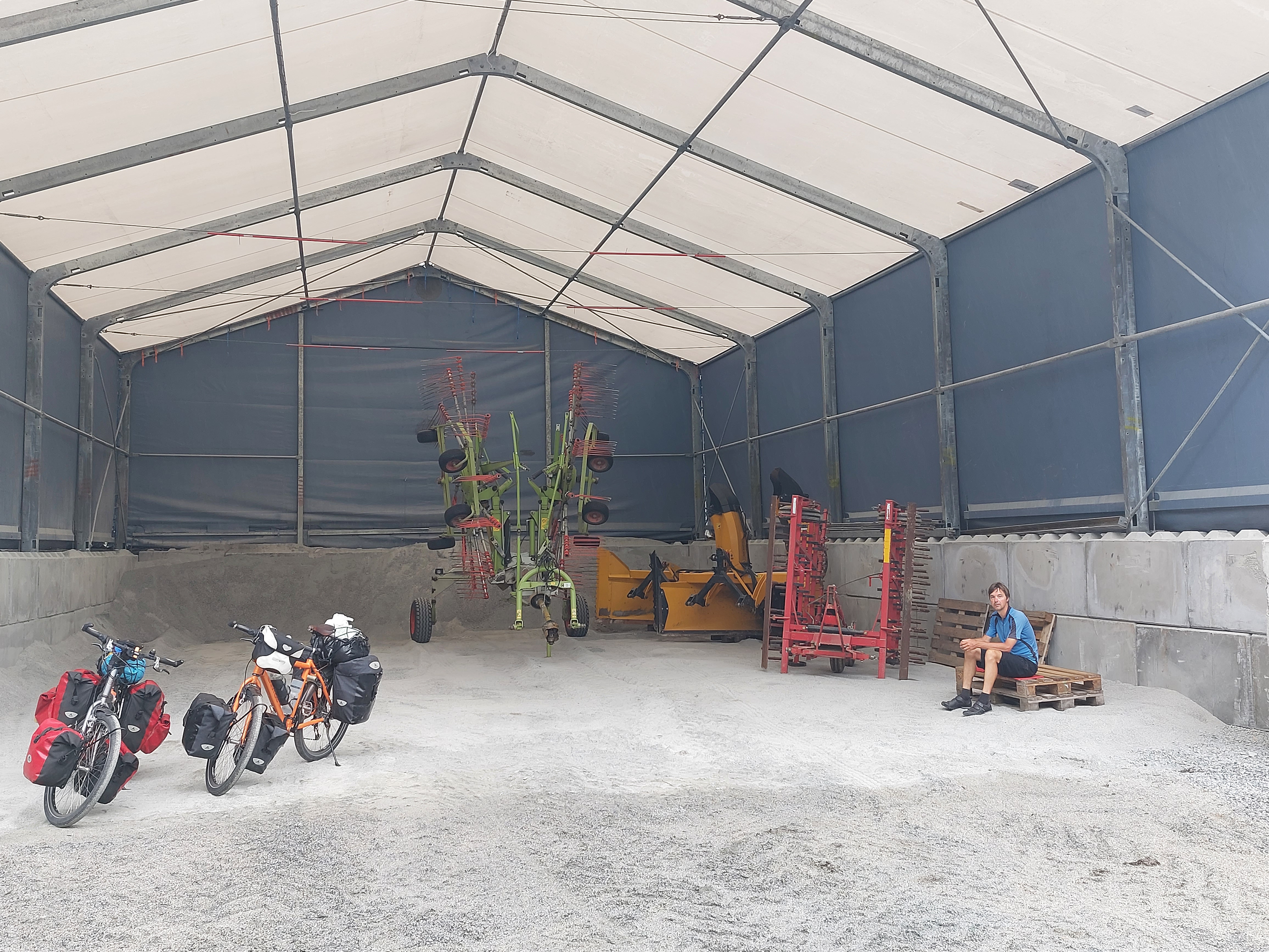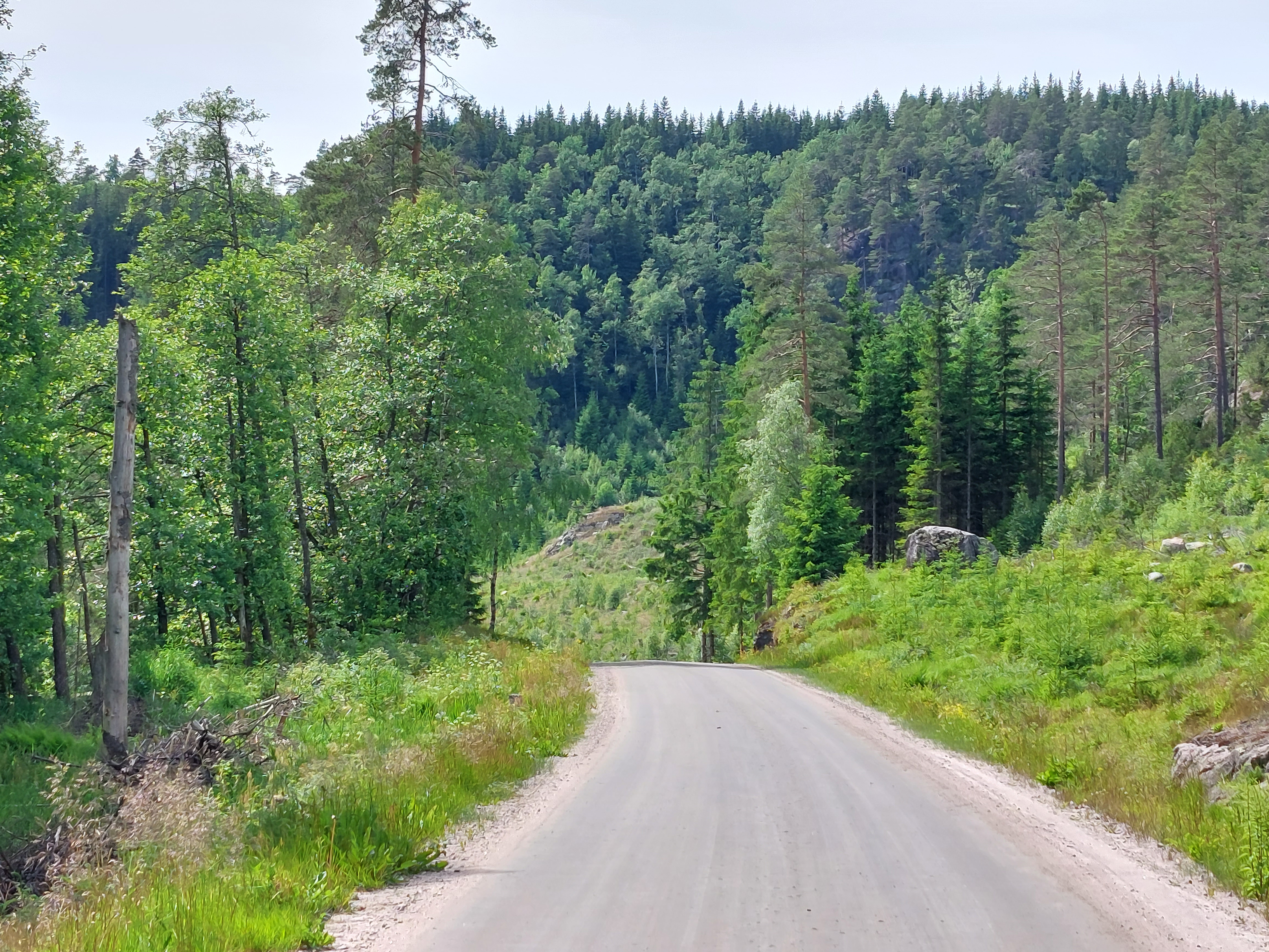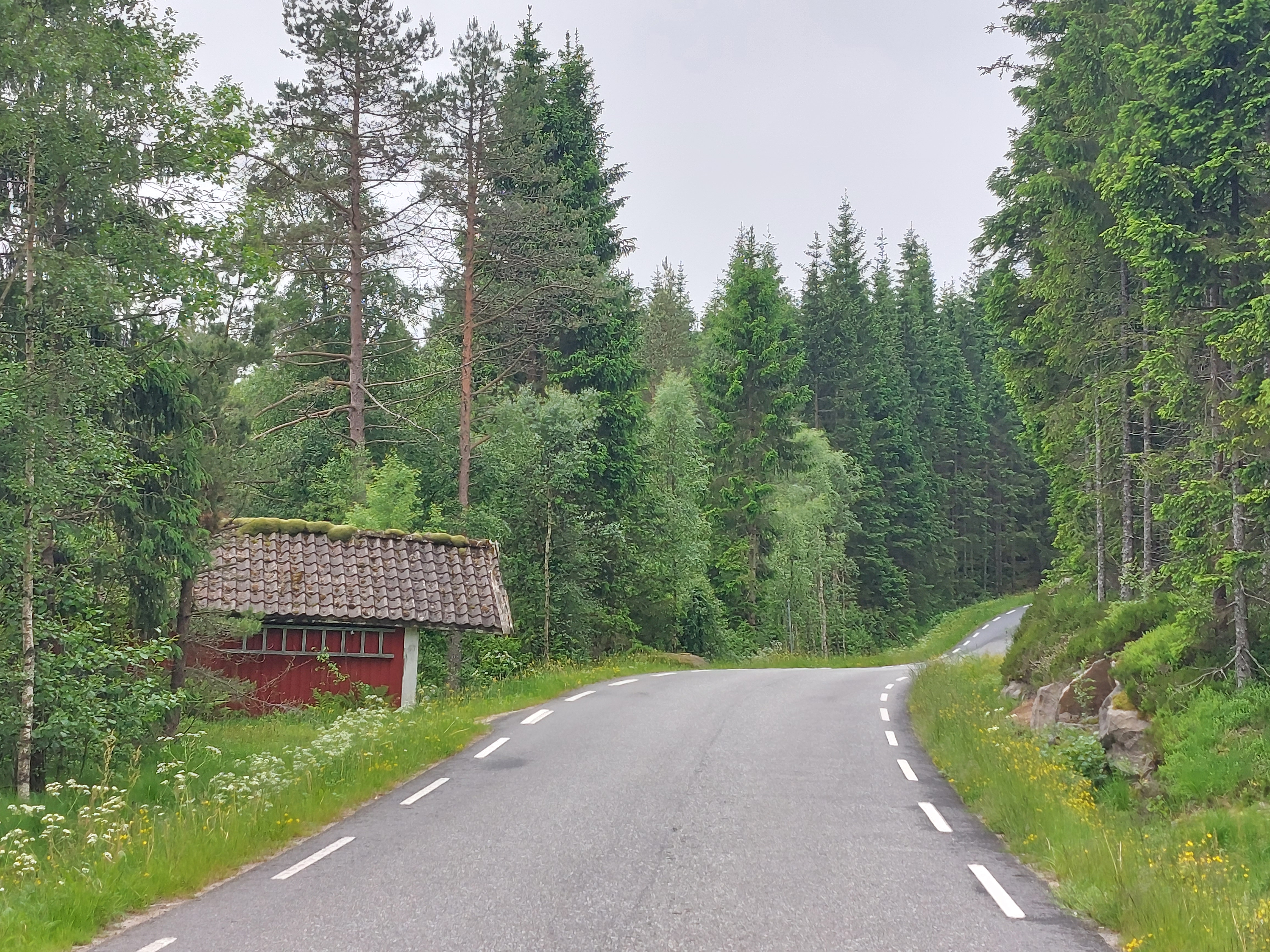 De klim begon met 5 km van 10% en was dus zwaar. Daarna vlakte het wel wat af, maar het bleef zwaar. Ongeveer halverwege begon het inderdaad te regenen, dus moest het regenpak aan. En klimmen in een regenpak is niet bepaald fijn! Op de plek waar de klim echt vlakker werd staat een verlaten restaurant. Daar konden we mooi schuilen op de veranda. En dat was maar goed ook, want het ging alleen maar harder regenen. Op een gegeven moment besloten we toch om maar verder te gaan, want daar blijven zitten schoot natuurlijk ook niet op. De regen werd toen al wel wat minder hard en de klim duurde ook niet meer heel lang. Na een stukje vlak sloegen we weer een onverhard pad in. We hadden ook nog een stuk door kunnen fietsen en dan over een asfalt weg richting Dokka, maar dat was om dus we besloten om het onverharde pad te nemen. En dat bleek een goede keuze te zijn geweest. Het was een mooi pad, langs water en door bos. Het begin was behoorlijk vlak, later kwamen er meer heuvels. Het bleef wel regenen, maar niet zo hard meer, dus  het was te doen. Het bleef door heuvelen tot Dokka en we waren blij toen we daar waren. Gezien het slechte weer de hele dag vonden we dat we wel een hutje hadden verdiend. We hebben het kacheltje lekker opgestookt en hadden dus een heerlijk warme avond.