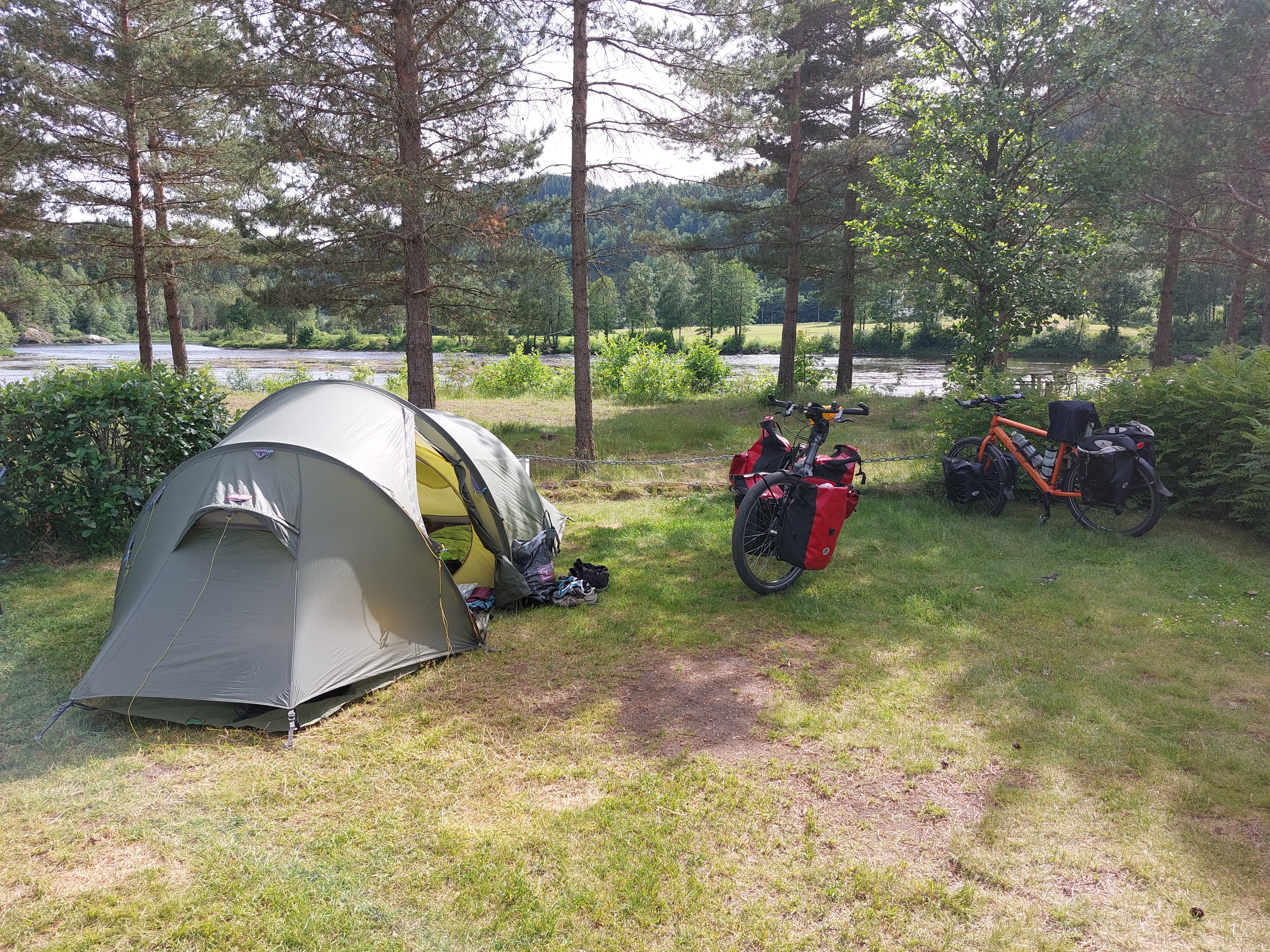 Vanuit Skabu konden we doorsteken om op de volgende onverharde route, Peer Gyntvegen, te komen. We wilden Mjolkevegen niet helemaal naar Vinstra volgen, want dat was iets te ver door voor ons. We zijn dus een paar km voor Vinstra af geslagen naar Peer Gyntvegen. Ook deze route hadden we al eerder gedaan, maar dat maakt het niet minder mooi. De dag begon helder en behoorlijk zonnig, maar het werd steeds bewolker en kouder. Op een gegeven moment begon het ook weer te regenen, maar gelukkig hield dat later weer op. De route was erg heuvelachtig, met veel behoorlijk steile heuvels, en ging door bosachtig terrein. Bij het skidorpje Gala kwamen we tijdelijk op een verharde weg met een hele lange klim. Gelukkig is er bovenaan die klim een winkeltje waar we wat lekkers konden kopen. Daarna werd de weg weer onverhard en duurde het niet lang voordat we bij het kampeerplekje kwamen waar we de vorige keer hadden gekampeerd. Omdat de lucht nog steeds erg dreigend was en omdat het een heel mooi plekje was bij een meer en met een picknick tafel, besloten we om de tent daar weer neer te zetten. Toen de tent stond en de thee was gezet begon het inderdaad weer te regenen, maar ook deze keer duurde het niet heel lang. Het was ons opgevallen dat we heel veel andere fietsers zagen op deze route, veel meer dan de vorige keer. Ook in de tijd dat we bij de tent zaten kwamen er nog heel wat fietsers voorbij. Blijkbaar is er meer bekendheid gekomen in de afgelopen jaren.