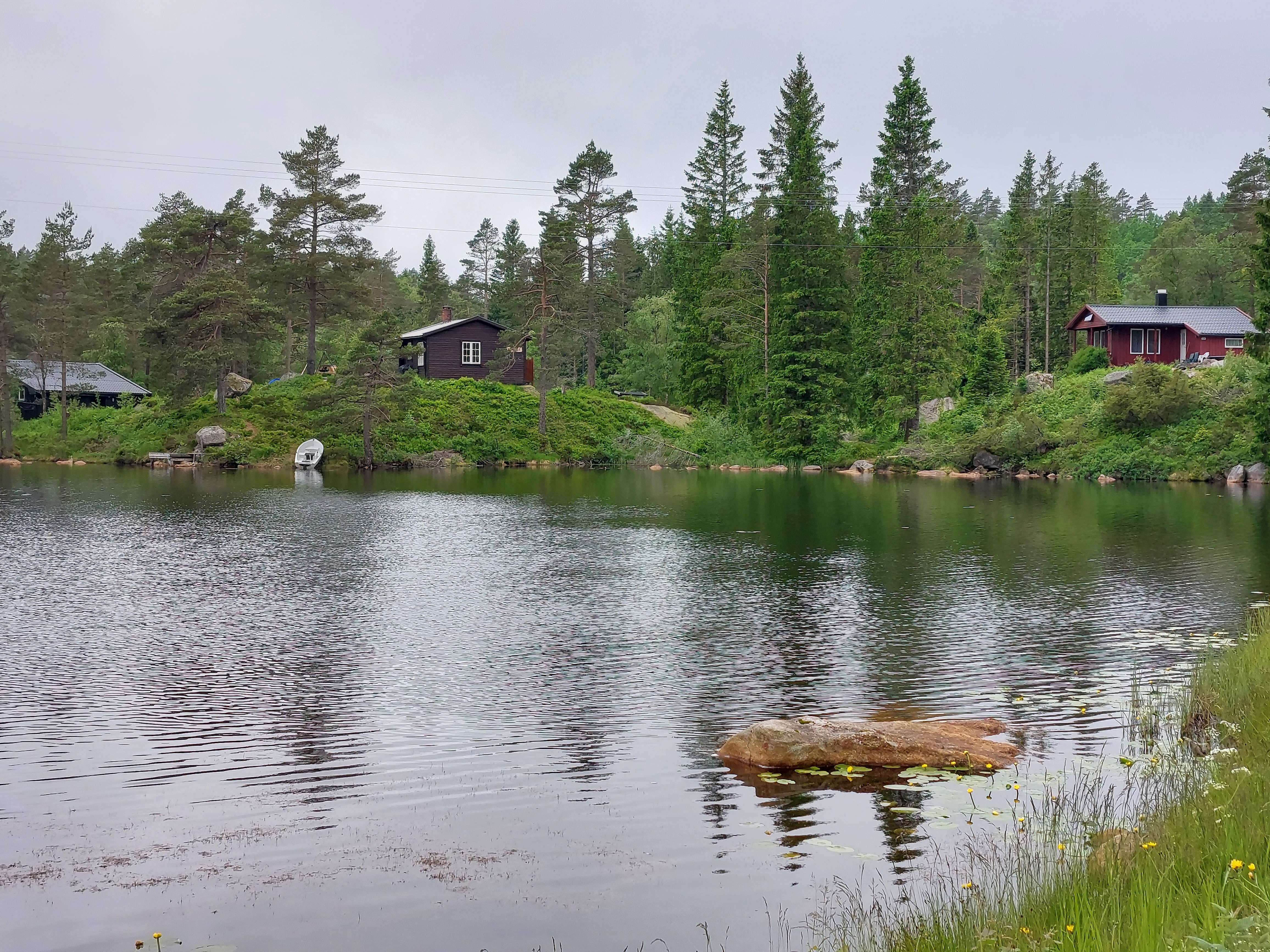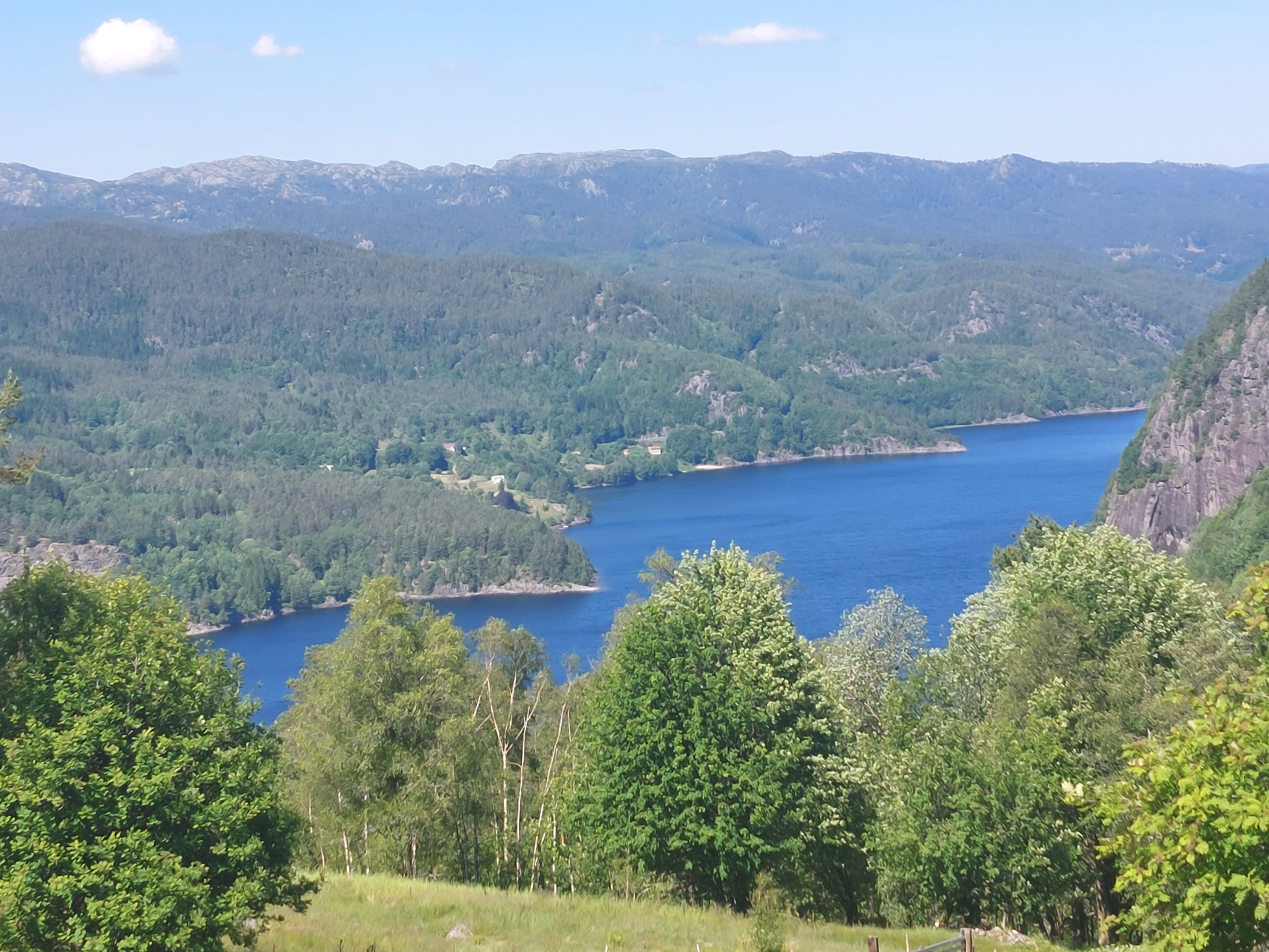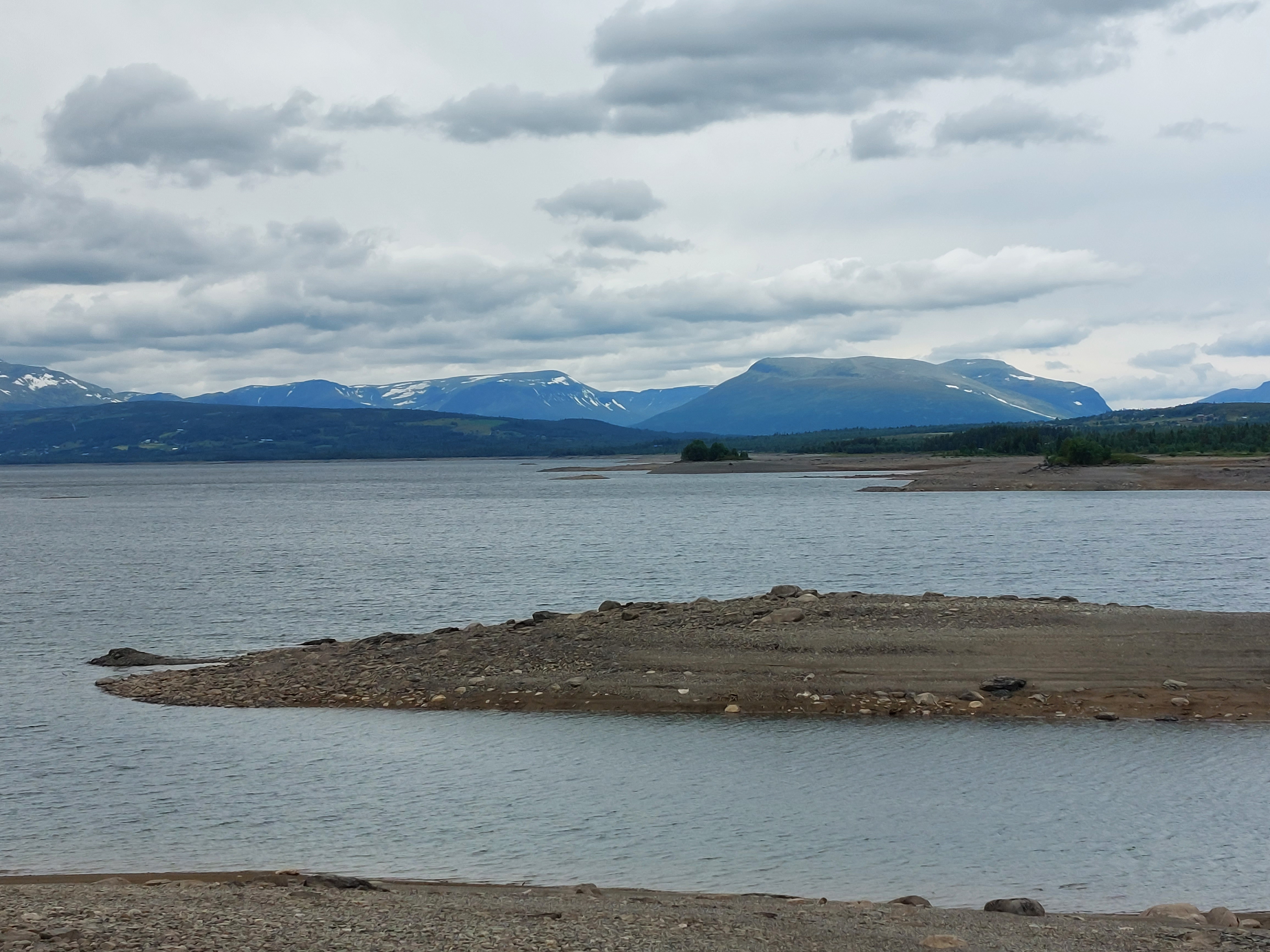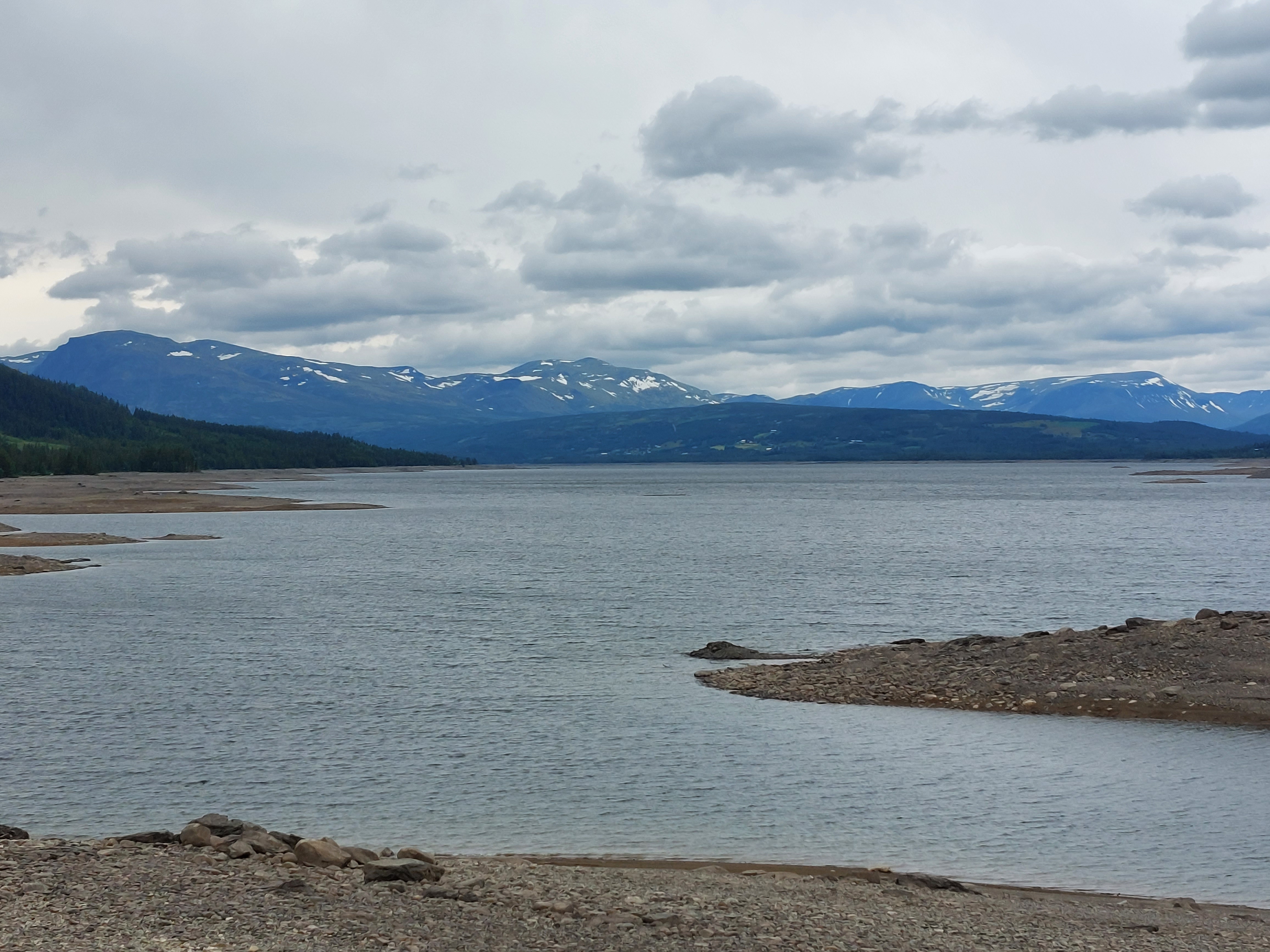 De dagen daarna fietsten we over mooie, kleine weggetjes via Kvinesdal en Tonstad omhoog naar Adneram. We hadden prachtig zonnig en warm weer, dus dat was wel een meevaller. Vanaf daar kom je op een hoogvlakte waar de wind vrij spel heeft en er op veel plekken nog (wat) sneeuw ligt. Een prachtige omgeving die mede door de dreigende wolken en de harde wind nog indrukwekkender werd. We fietsten over de vlakte en daalden aan de andere kant weer af. We moesten door naar de plaats Dalen omdat de weg daar naartoe op doordeweekse dagen afgesloten was in verband met werkzaamheden. Het was zondag, dus we moesten wel door, ook omdat het de volgende dag de hele dag zou regenen. We wilden dan wel ergens op een camping zijn. Er kwam dus nog een lange klim bij, maar het was wel weer een heel mooi stuk. Aan het eind wachtte een steile afdaling voor we het dorp in rolden. De volgende dag heeft het inderdaad zo ongeveer de hele dag geregend, dus we waren blij dat we daar waren.