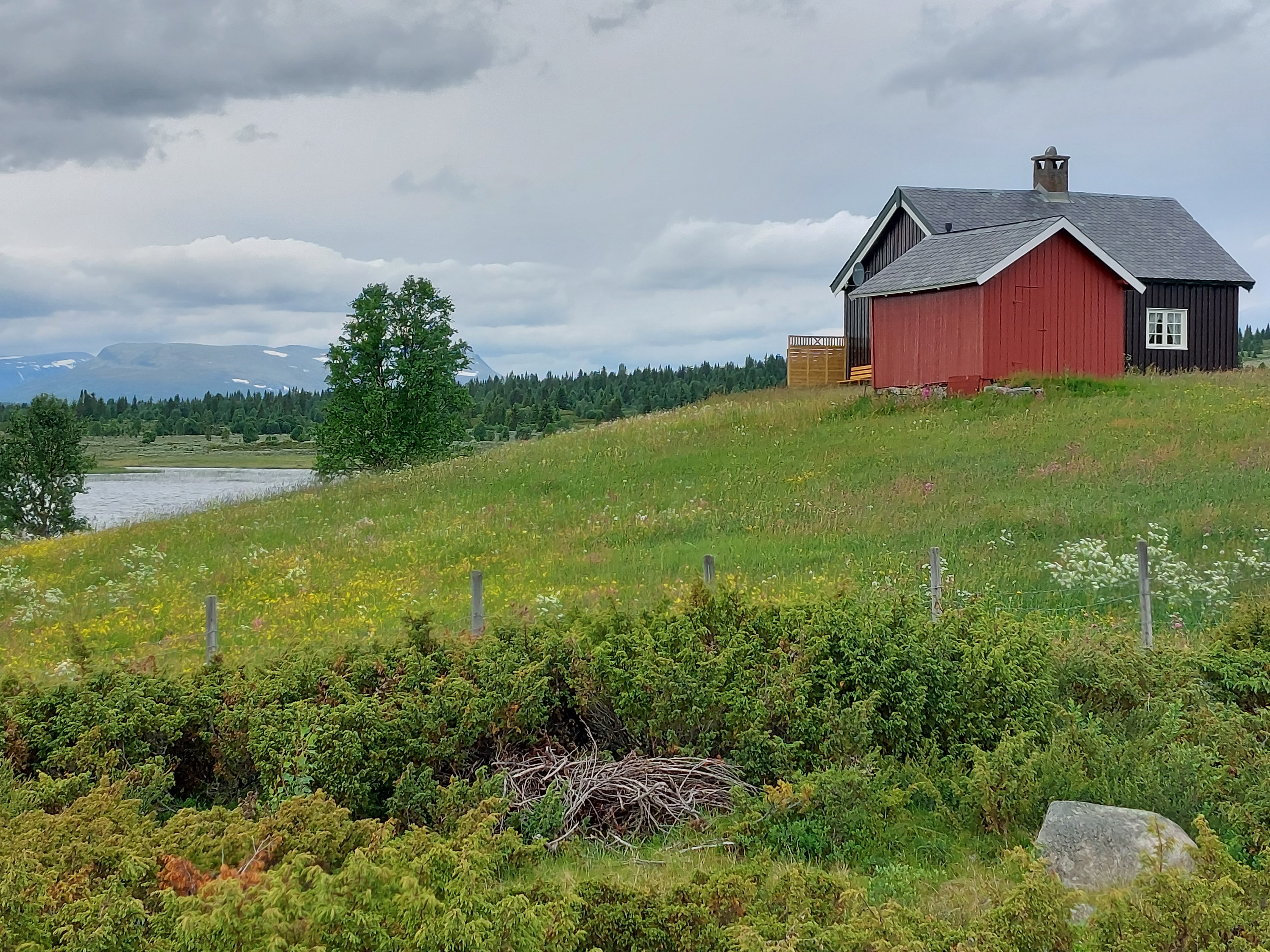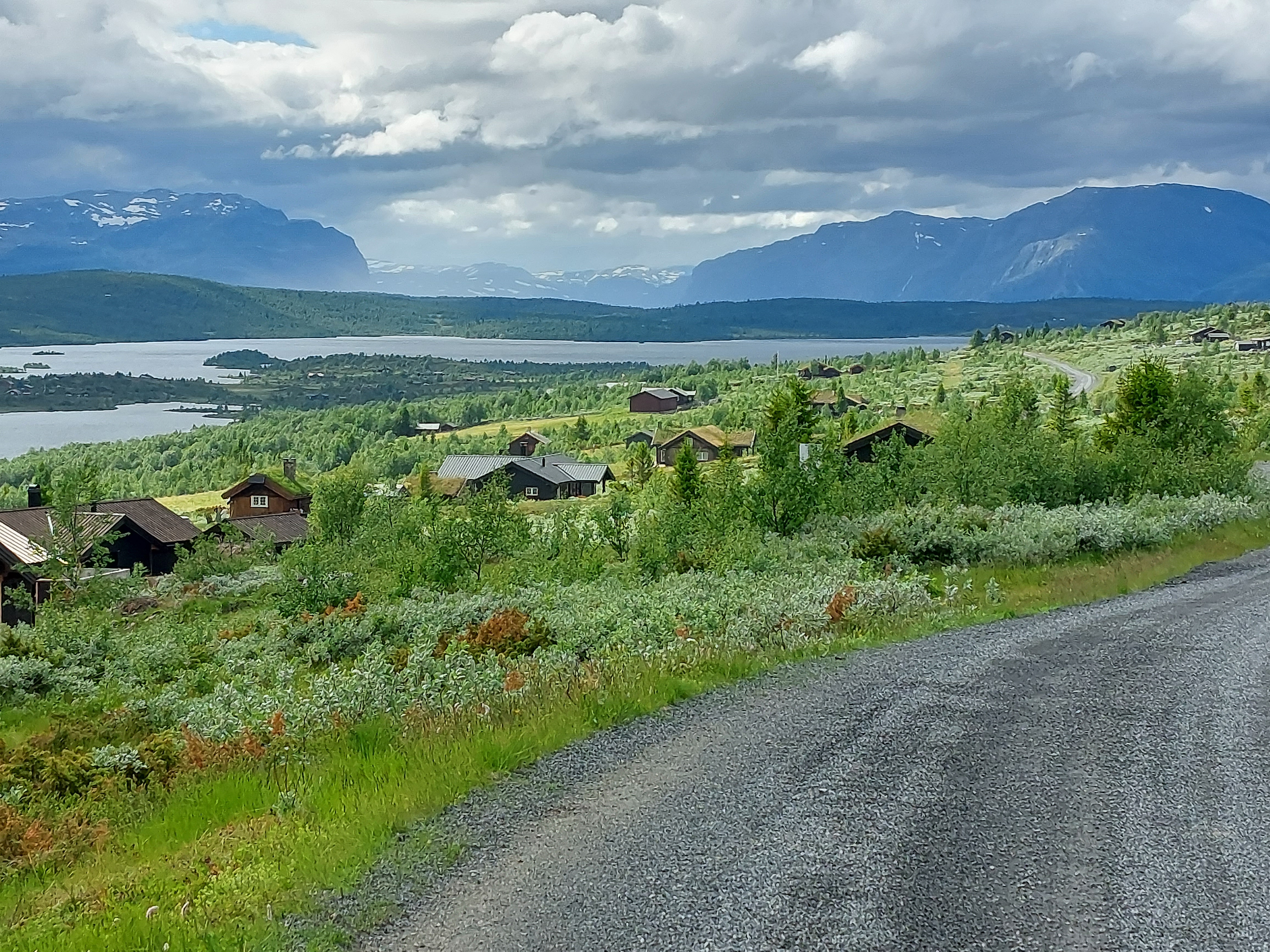 Na die regenachtige dag was de lucht weer schoon gespoeld en was het weer prachtig weer. De lucht was ook lekker opgefrist, dus het was heerlijk fietsweer en dat bleef de dagen daarna ook zo. We fietsten via Austbygde naar de energiecentrale van Rjukan en daarna met heel veel klimmen naar Dagali vanwaar we doorfietsten naar Gol. De omgeving bleef prachtig, met veel klimmen en met bossen, meren, besneeuwde bergen aan de horizon en weer een prachtige hoogvlakte.