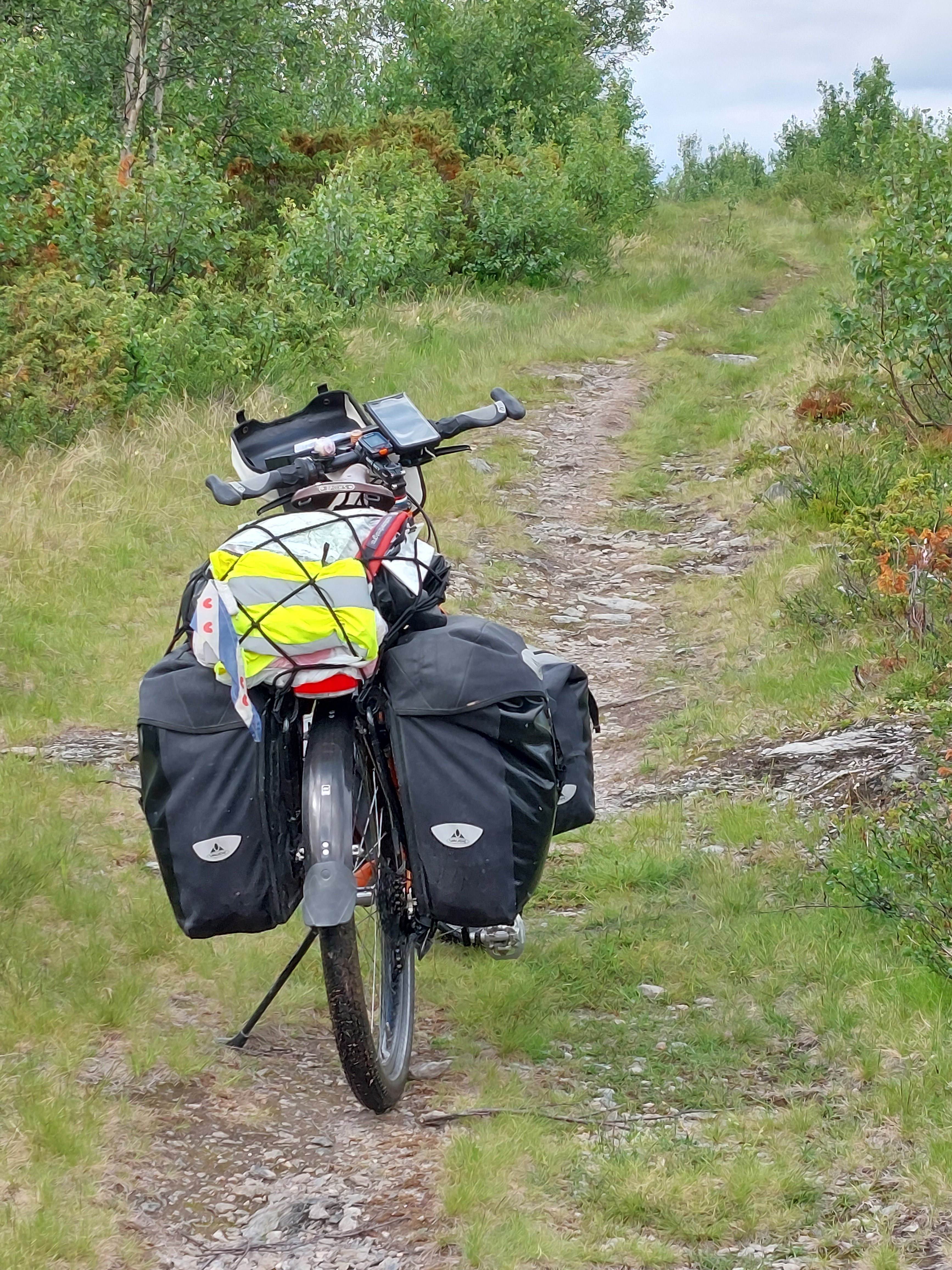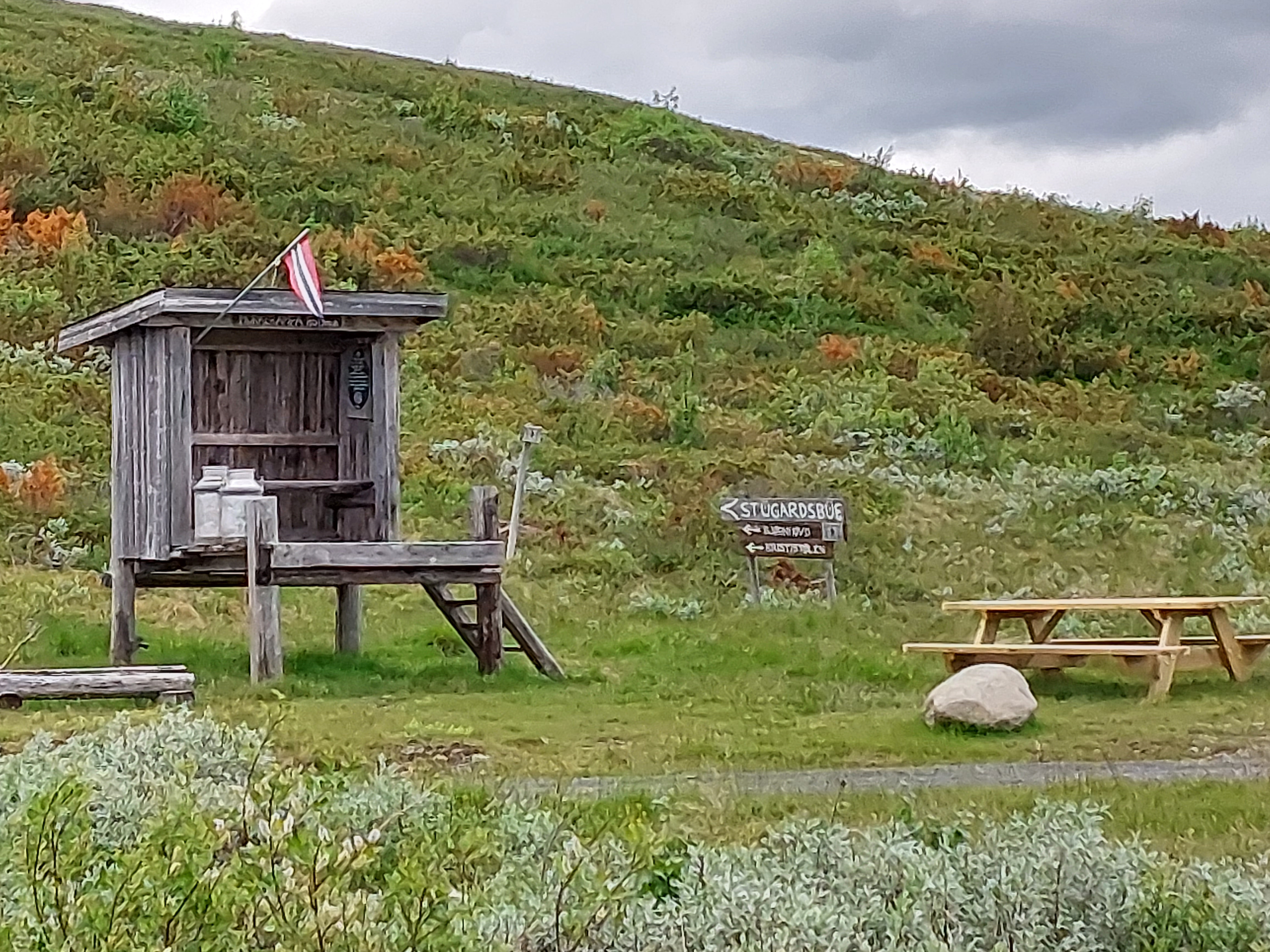 Van Ryfoss is het nog maar ongeveer 40 km naar Beitostolen, maar dat zijn verreweg de zwaarste kms van de hele route. Er zit een stuk van 5 km in waarbij we 650 meter omhoog moesten. Het stijgingspercentage kwam niet onder de 10% en meestal zelfs niet onder de 11%. Er zaten stukken in van 17%. Ondertussen zat de regen ons weer op de hielen, maar de harde wind hielp ons naar boven. Daar boven hadden we wederom een fantastisch en nogal spookachtig uitzicht op de wereld om ons heen. Helaas hadden we niet veel tijd om daar van te genieten, want door de harde wind was het erg koud geworden en we wilden de bui voor zien te blijven. De handschoenen konden aan voor de afdaling, maar gelukkig konden die weer uit zodra we lager kwamen. Voor het kleine buitje dat we niet voor konden blijven konden we schuilen in een schuilhut. Na nog hele heuvelachtige laatste kms naar Beitostolen besloten we om daar te blijven. Het is een skidorpje met een aantal sport- en outdoor winkeltjes. We moesten een nieuwe slaapmat kopen omdat eentje kapot was gegaan. Gelukkig wisten we dat we in Beitostolen een nieuwe konden kopen en dat hebben we dus ook maar gedaan.