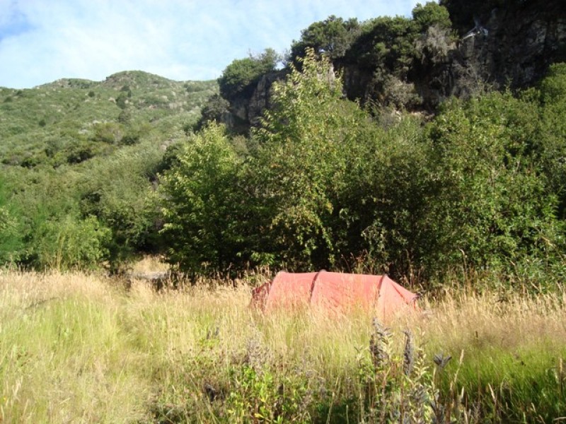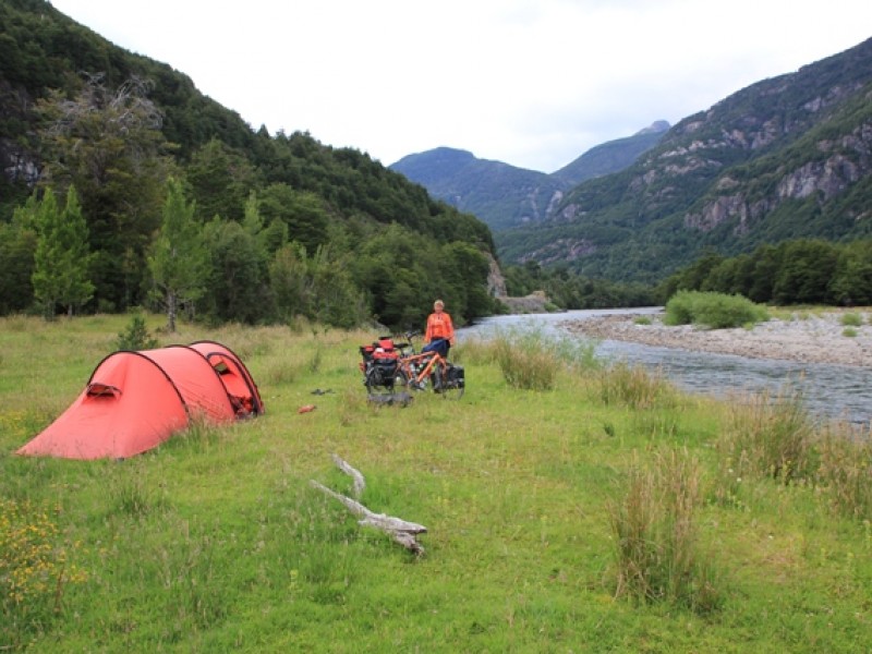 When we left Coyhaique, it was raining a little bit, but the temperature was good for cycling. Fortunately it didn’t rain for long and the temperature remained very nice. We were still cycling on tarmac, so it went very well. Also because most of the route was flat or went downhill. A few small hills, but nothing special. All in all a wonderful day of cycling! The views were nice also, we rode through 2 fairly narrow valleys. After about 90 kms (55 miles) we arrived in Villa Manihuales, but the campground there was so bad that we decided to go on. We found a great camping spot about 10 kms (6 miles) after the town, right next to a small river. We had cycled for about 105 kms (61 miles), so it had been an old fashioned day of cycling! Great!