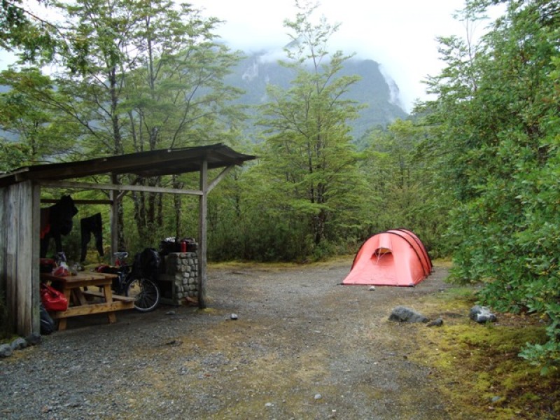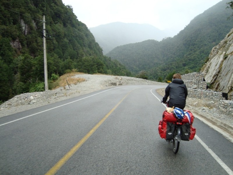 We cycled the pass in the rain, too bad because it’s supposed to be very beautiful over there. Fortunately the pass wasn’t as bad as we had expected, it was only 7 kms (4 miles) up on a road that was in pretty good condition. The road went through a rainforest (maybe that’s why it was raining…) and there’s a hike to a hanging glacier. We didn’t do that hike because of the rain and the clouds. We wouldn’t be able to see much anyway. Too bad… After a cold and wet downhill we went to the campground over there.