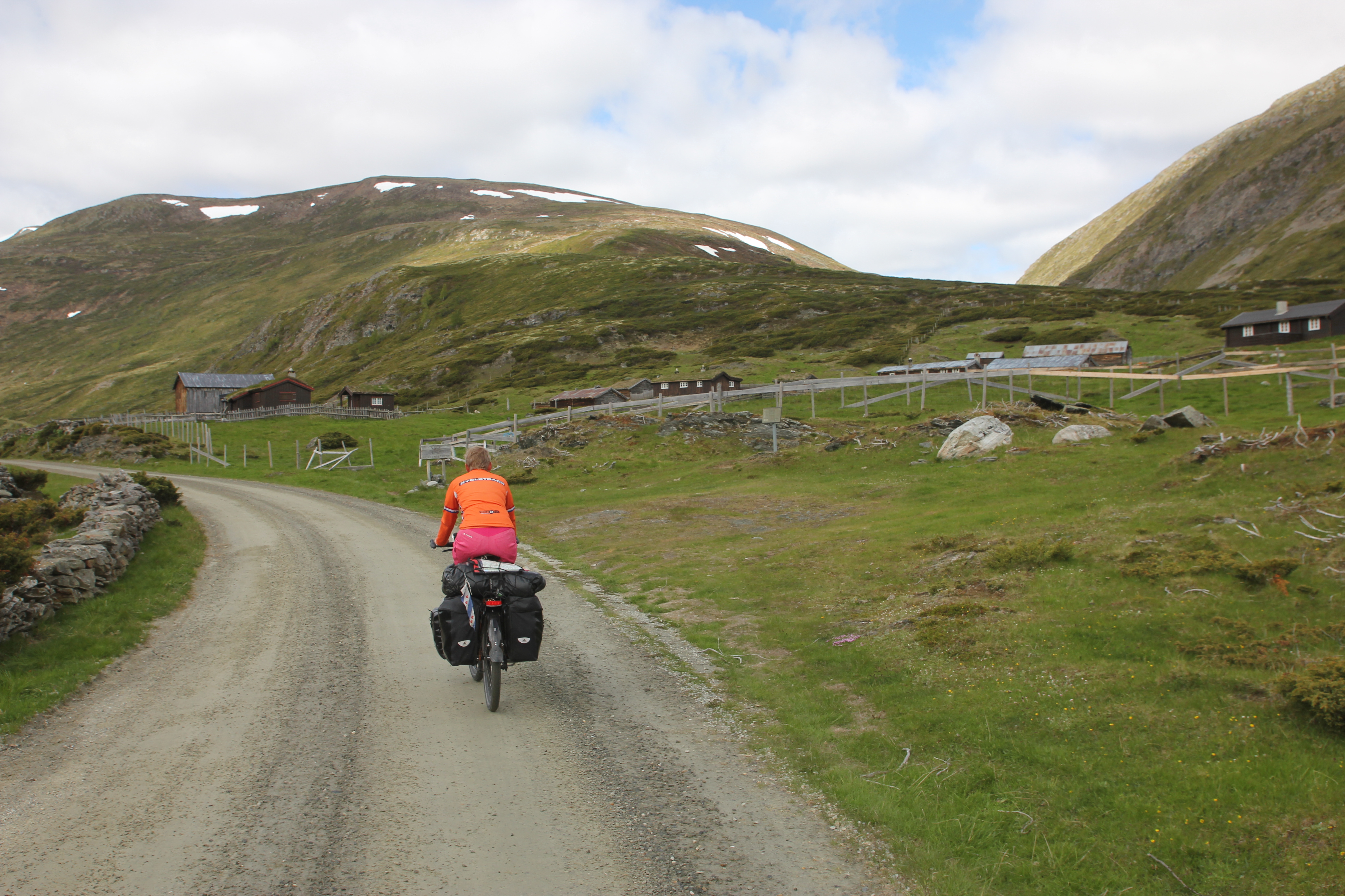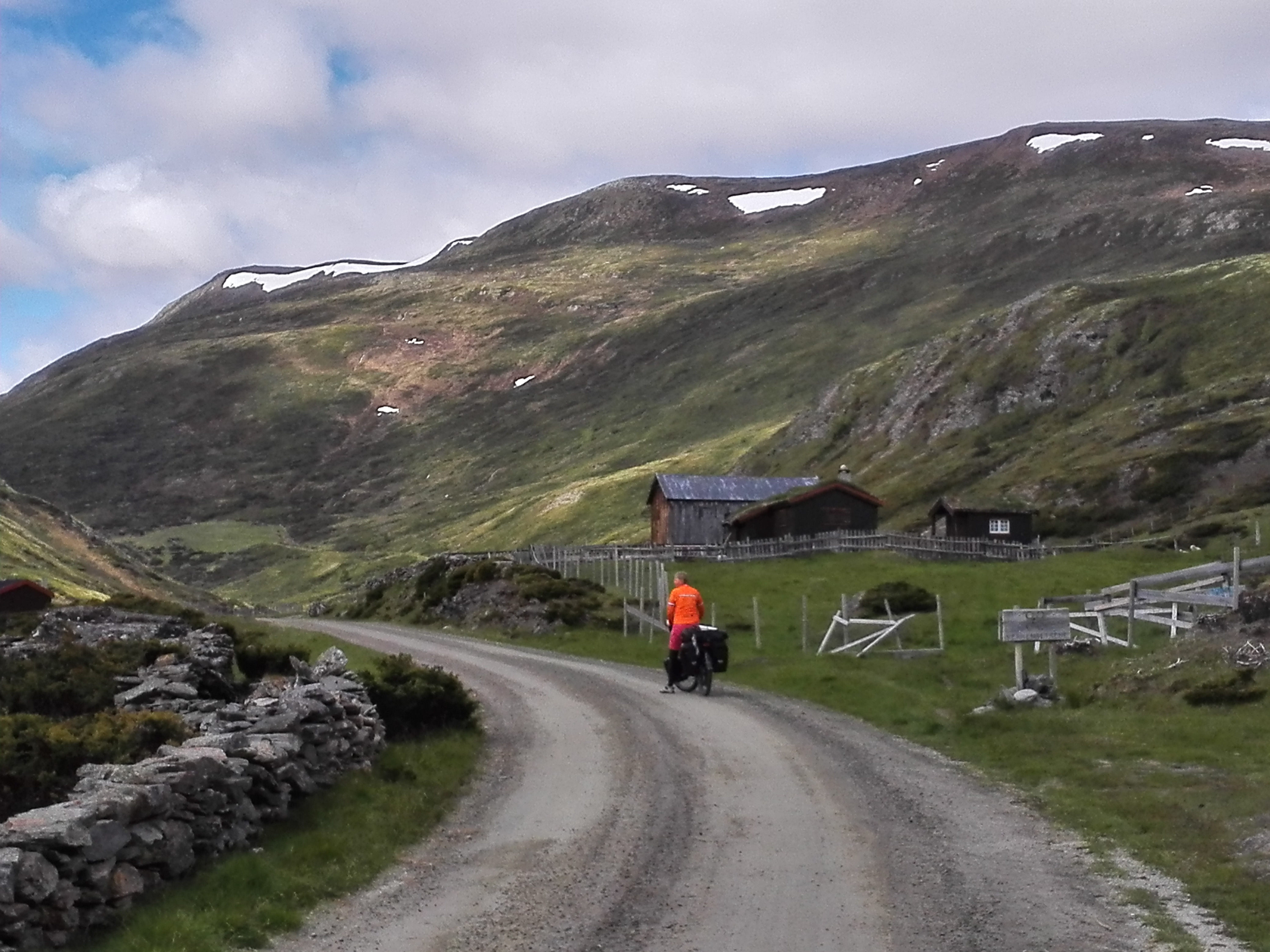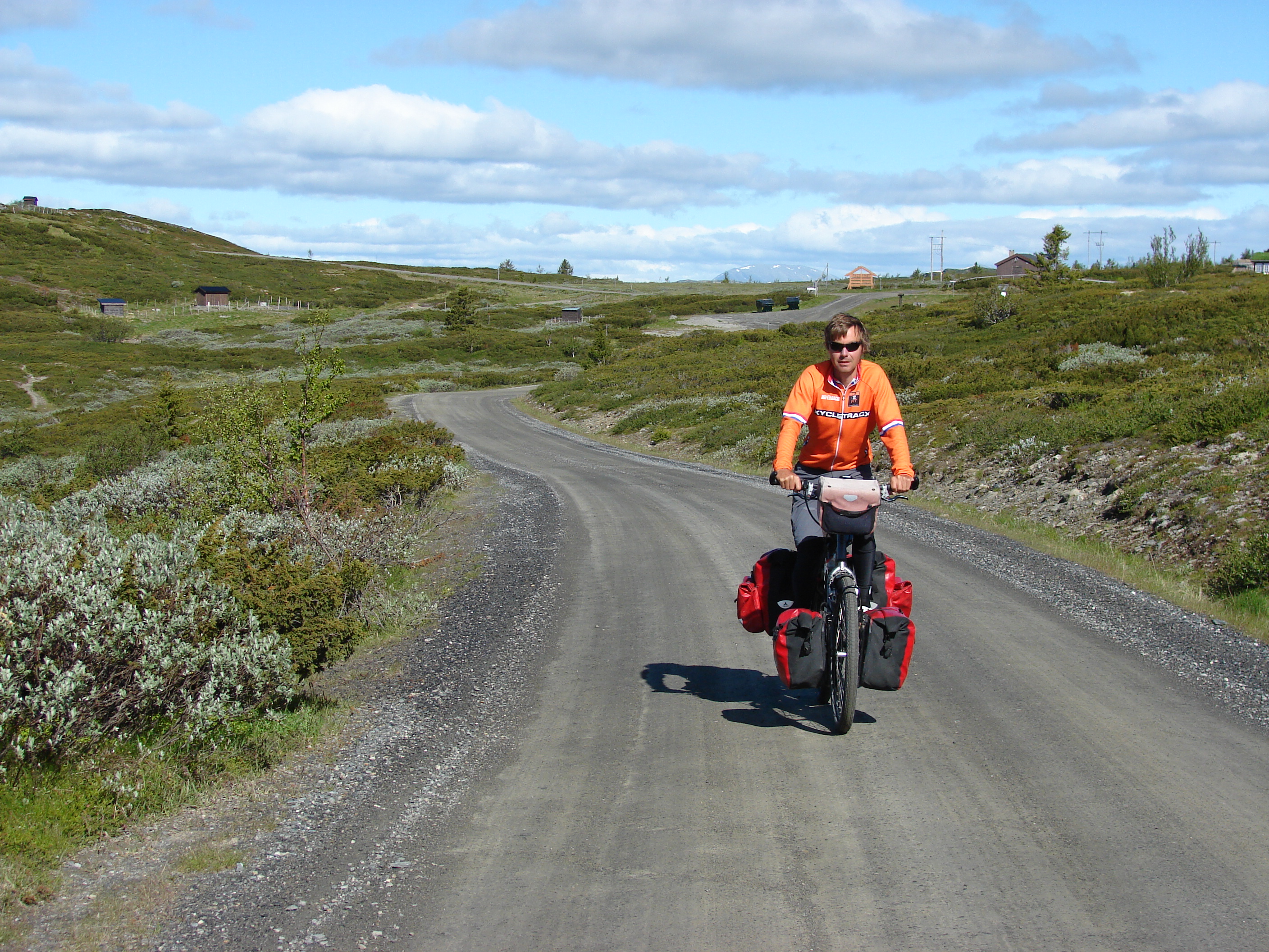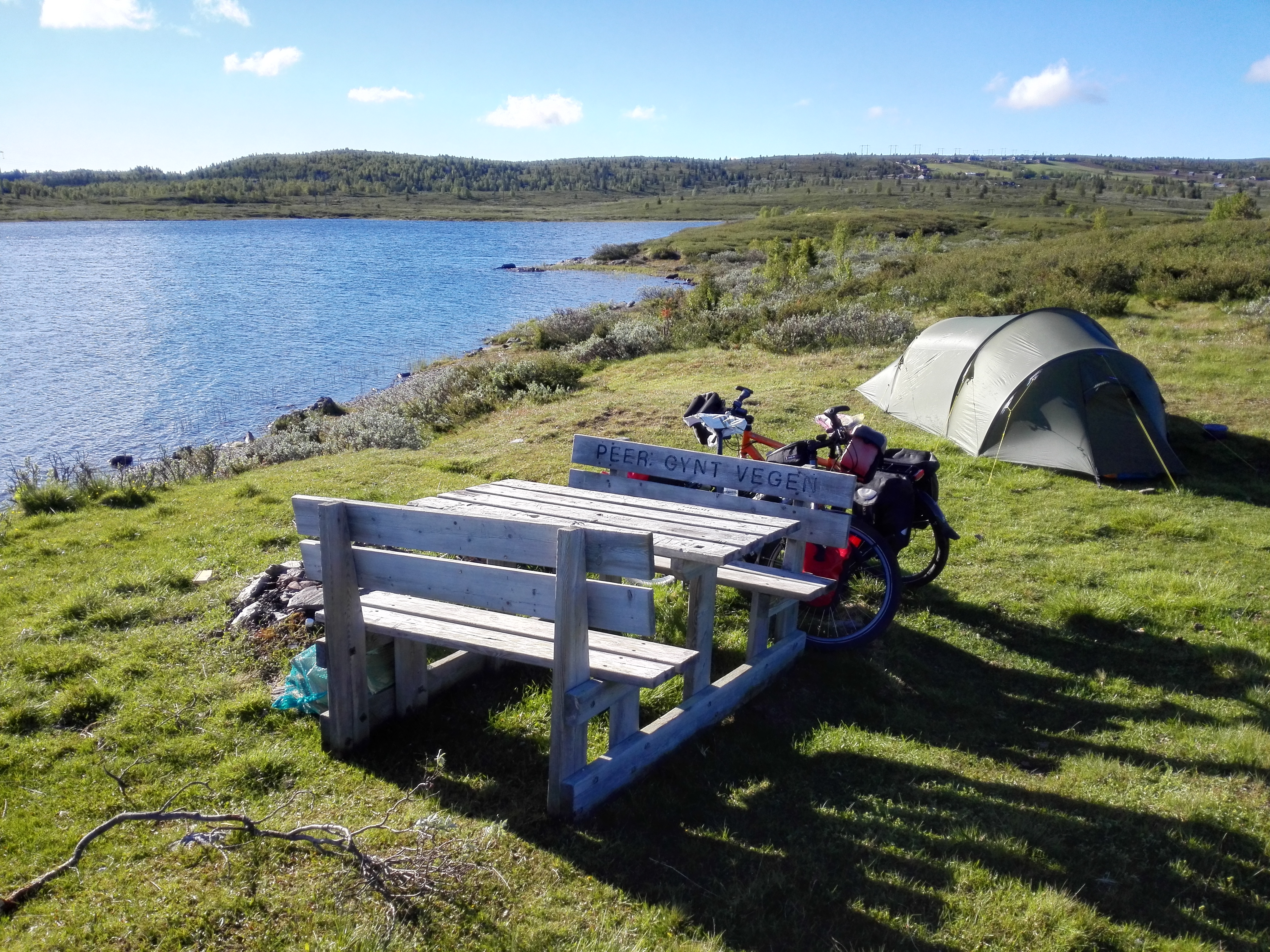 Peer Gynt vegen ended with a very long downhill, from 1000 m (3000 ft) to 200 m (600 ft) in 20 kms (14 miles). The more we descended, the warmer it got. We wanted to go to a town called Dokka, but it turned out there was this huge climb on our route. It turned out to be 750 altimeters (2250 ft) in 9,5 kms (6 miles), of which 500 mts (1500 ft) in the first 4,5 kms (1,5 miles). A lady told us that the Norwegian cyclist Boasson Hagen was from a town in the valley and he always used this climb as a training climb. Well, it’s a hell of a training climb! Fortunately it got a lot better after the top; still a few hills, but then it went down for many kms, all the way till Dokka. Another beautiful, unpaved route where we hardly saw anybody else. And beautiful weather!