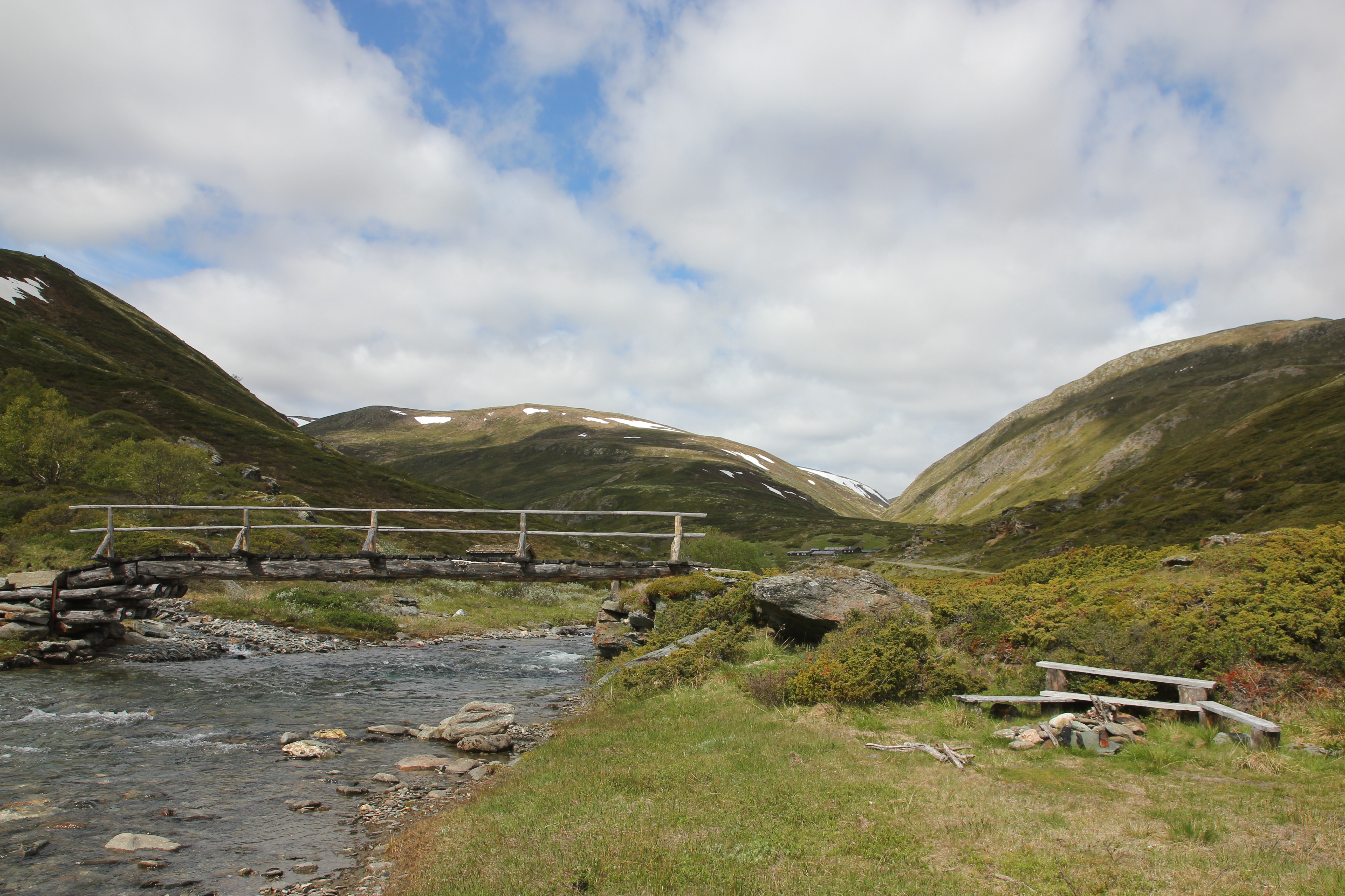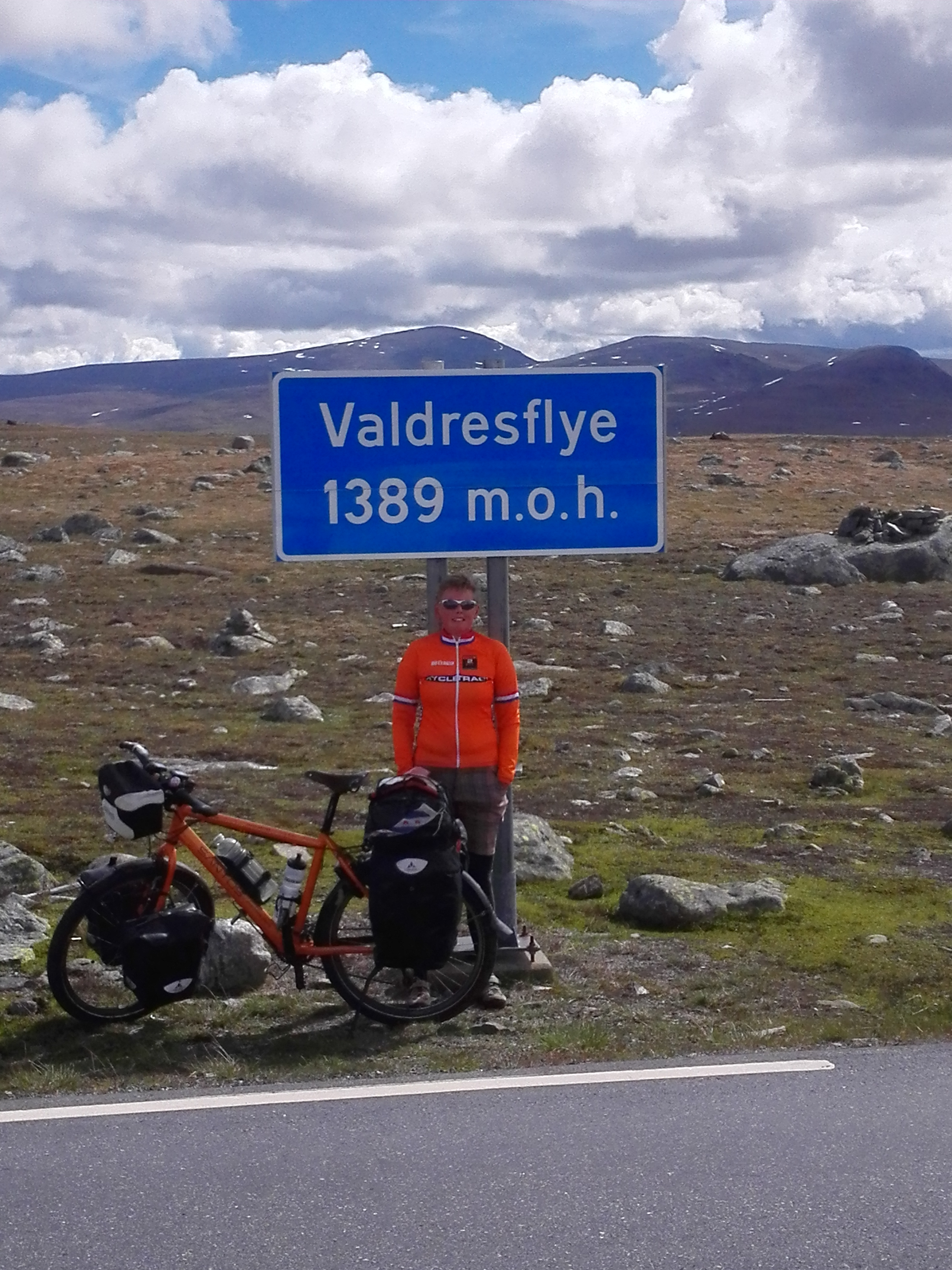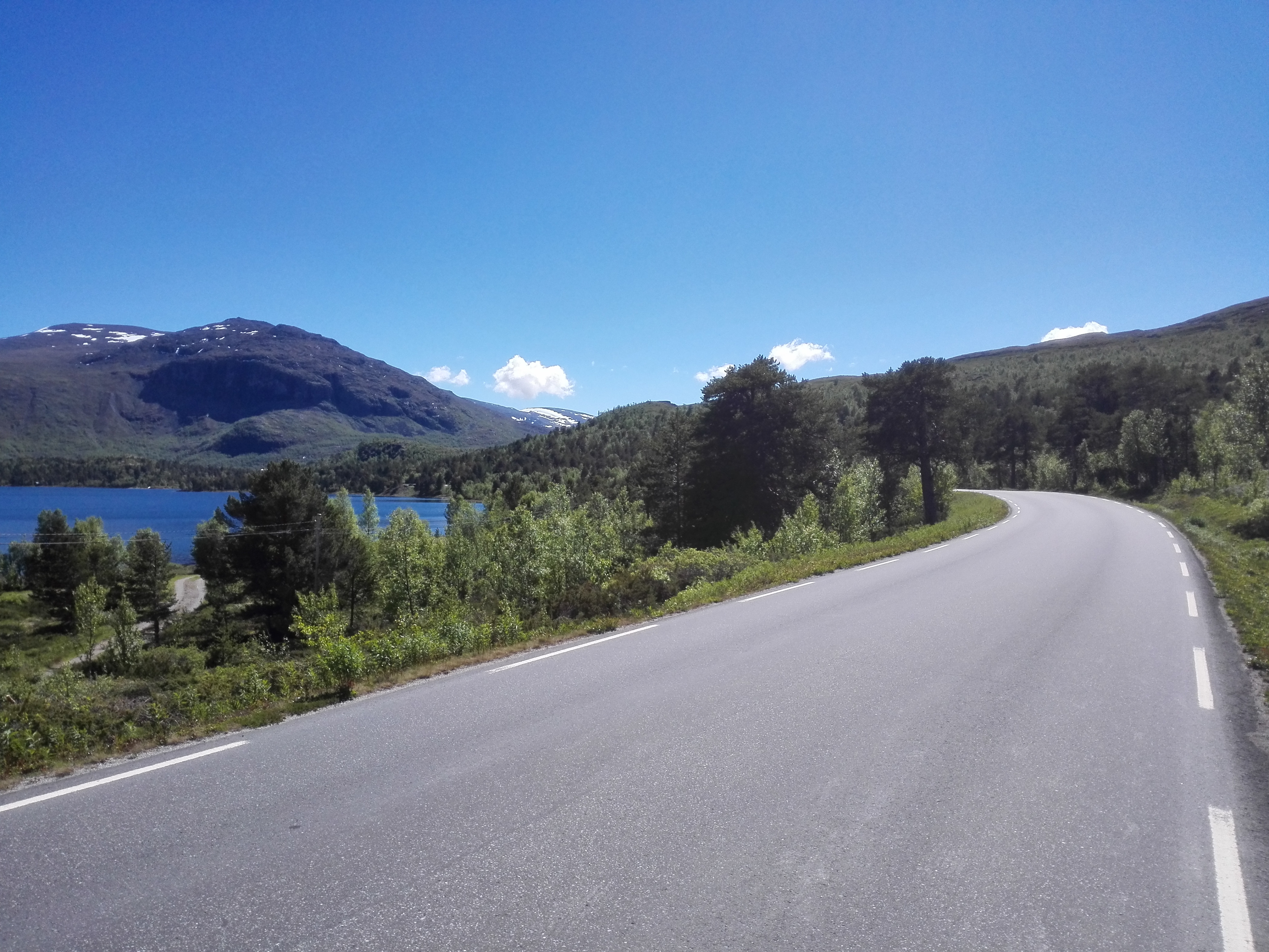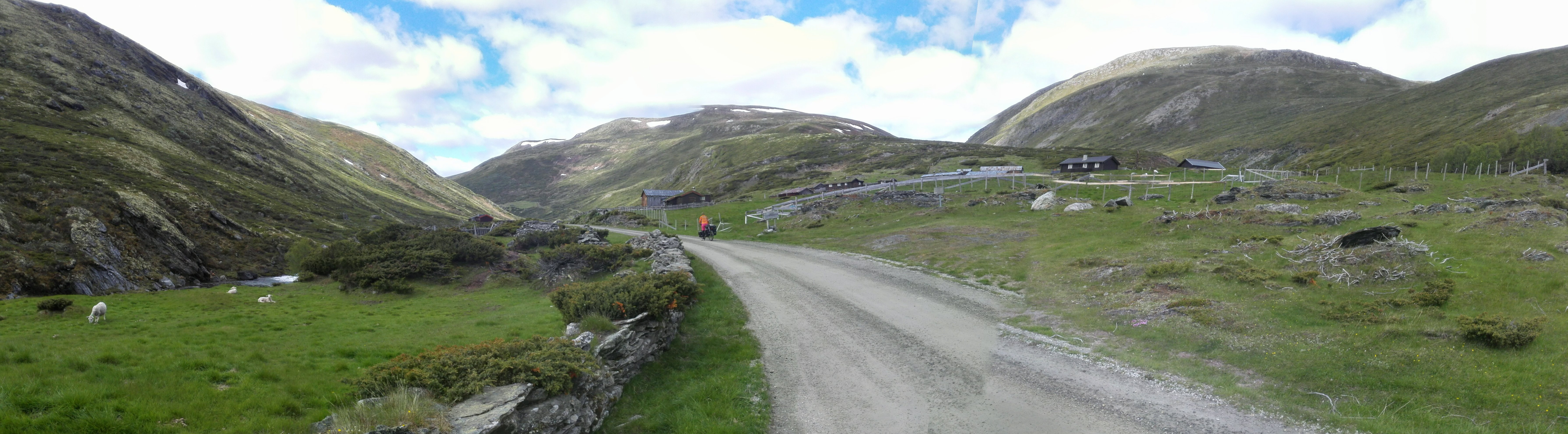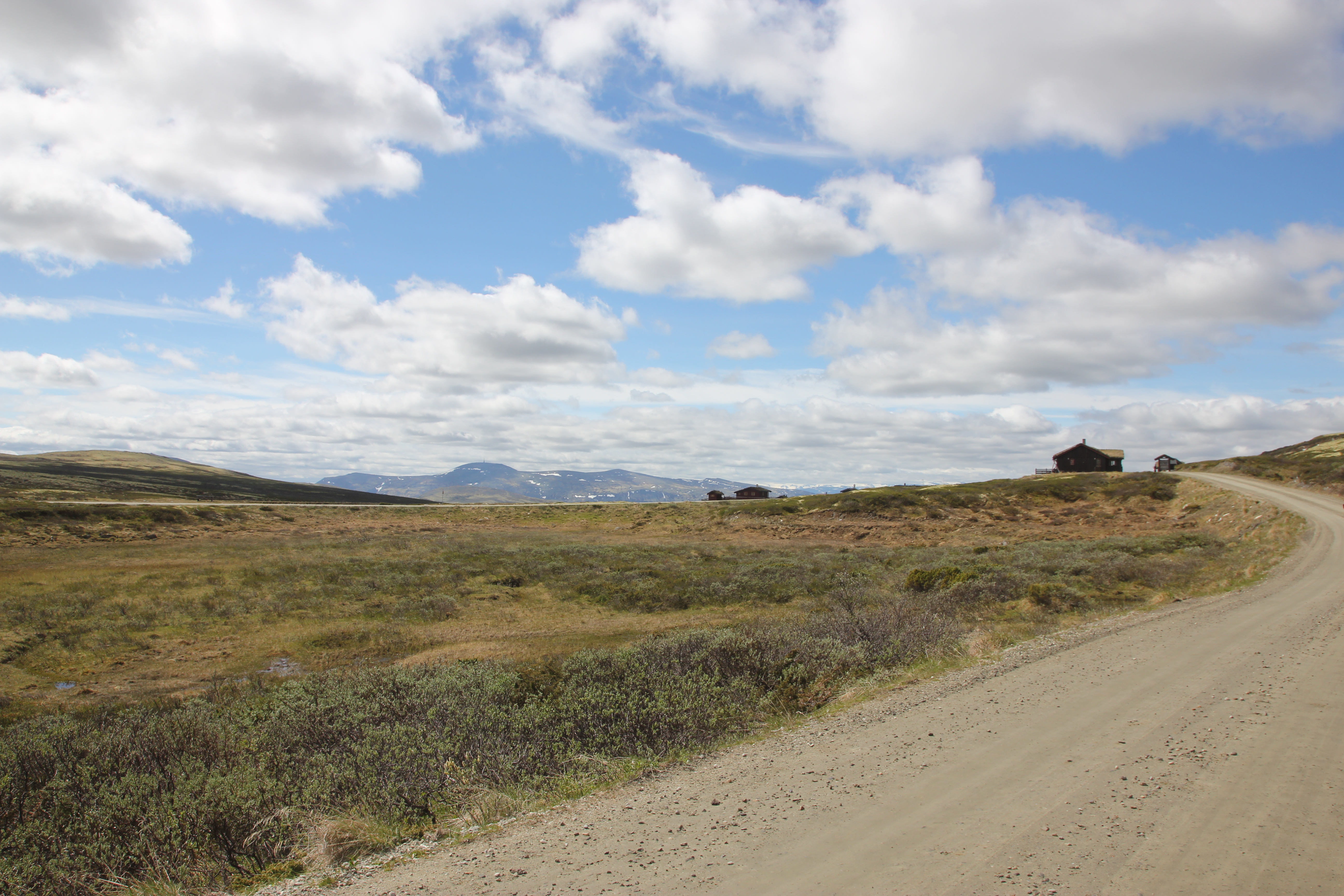 Peer Gynt vegen ended with a very long downhill, from 1000 m (3000 ft) to 200 m (600 ft) in 20 kms (14 miles). The more we descended, the warmer it got. We wanted to go to a town called Dokka, but it turned out there was this huge climb on our route. It turned out to be 750 altimeters (2250 ft) in 9,5 kms (6 miles), of which 500 mts (1500 ft) in the first 4,5 kms (1,5 miles). A lady told us that the Norwegian cyclist Boasson Hagen was from a town in the valley and he always used this climb as a training climb. Well, it’s a hell of a training climb! Fortunately it got a lot better after the top; still a few hills, but then it went down for many kms, all the way till Dokka. Another beautiful, unpaved route where we hardly saw anybody else. And beautiful weather!