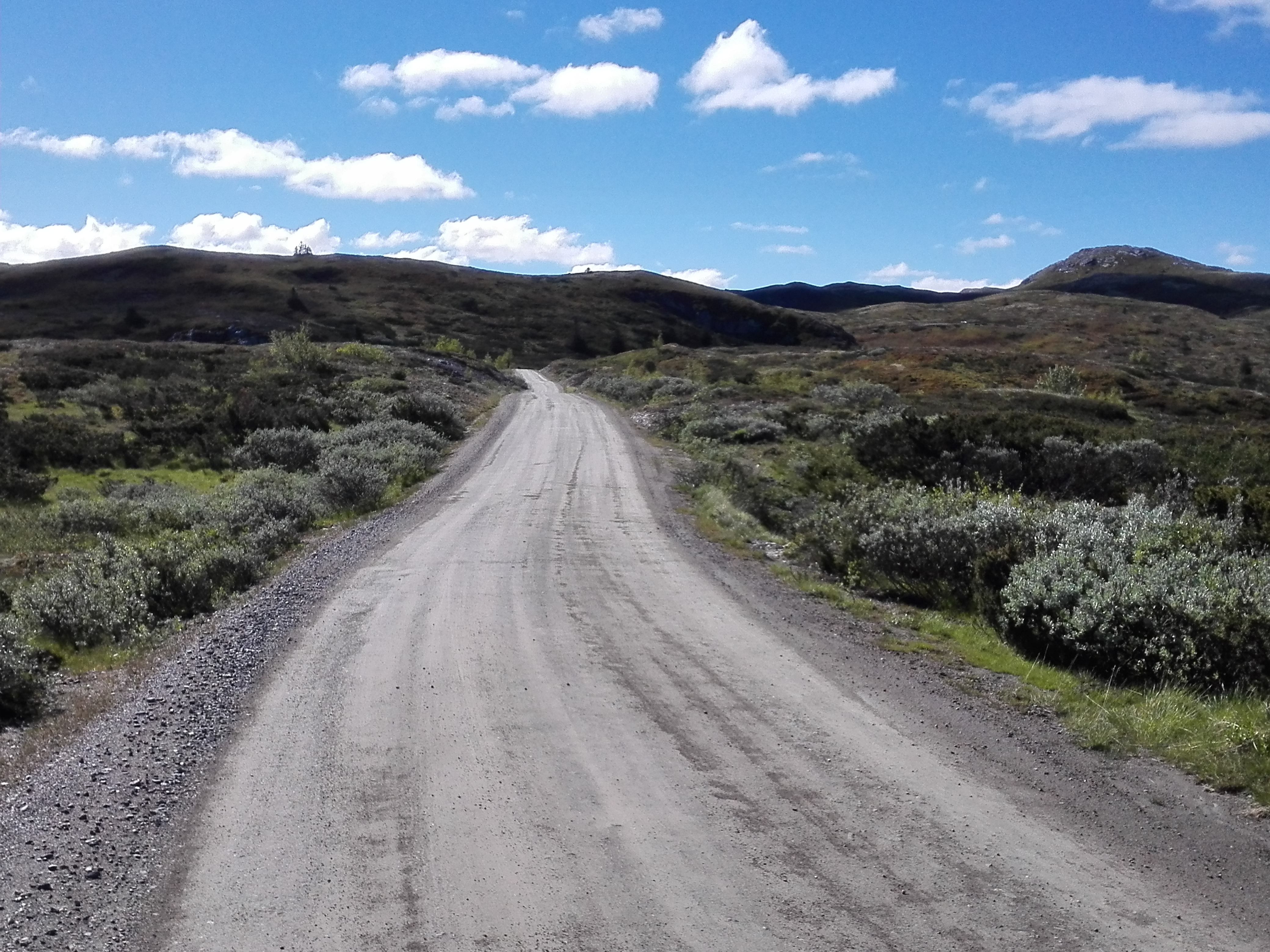 Peer Gynt vegen ended with a very long downhill, from 1000 m (3000 ft) to 200 m (600 ft) in 20 kms (14 miles). The more we descended, the warmer it got. We wanted to go to a town called Dokka, but it turned out there was this huge climb on our route. It turned out to be 750 altimeters (2250 ft) in 9,5 kms (6 miles), of which 500 mts (1500 ft) in the first 4,5 kms (1,5 miles). A lady told us that the Norwegian cyclist Boasson Hagen was from a town in the valley and he always used this climb as a training climb. Well, it’s a hell of a training climb! Fortunately it got a lot better after the top; still a few hills, but then it went down for many kms, all the way till Dokka. Another beautiful, unpaved route where we hardly saw anybody else. And beautiful weather!