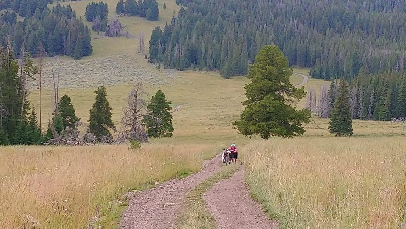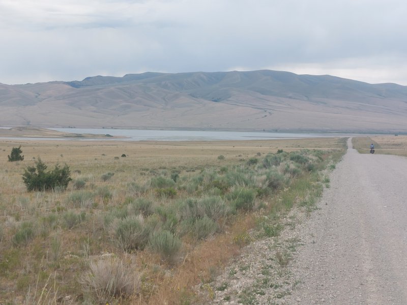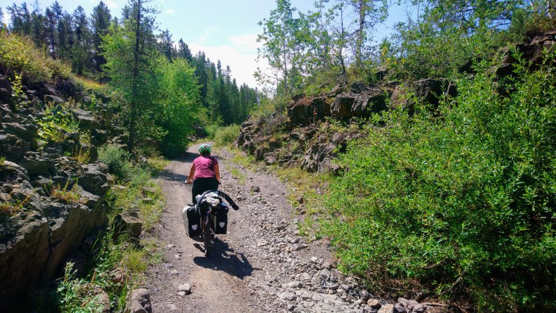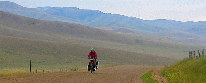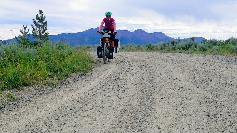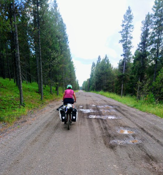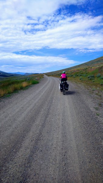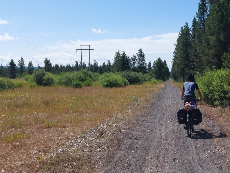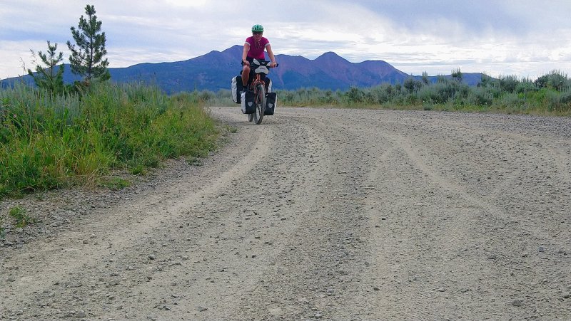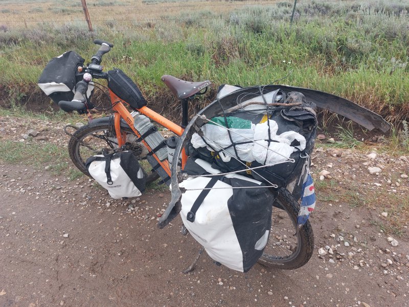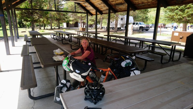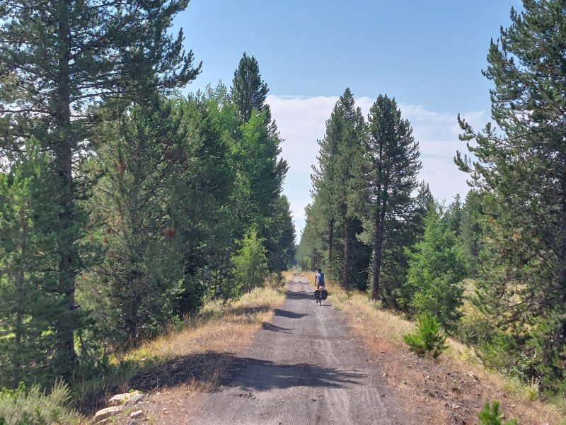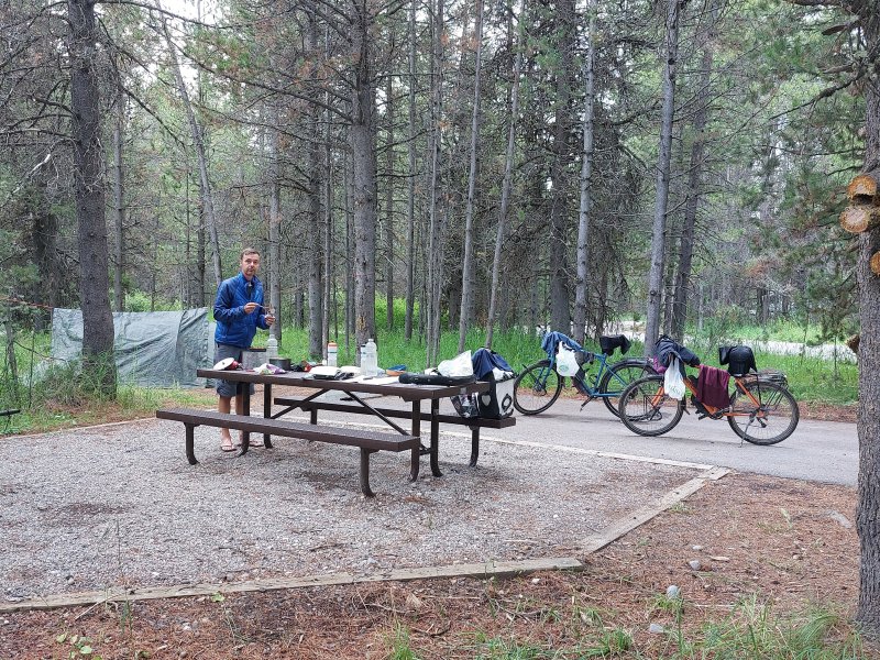 The next day was a little bit dryer and we managed to ride into civilization. Fortunately the weather got a bit better every day and after a few days we were back to riding in warmth and sunshine, even though there were still dark, threatning skies and it stayed a bit unstable. We rode on a rail trail toward Grand Teton National Park. We wanted to camp at a ranch, but weren’t allowed to because of the many (grizzly)bears in the area. The bears had even been on the front porch so camping wasn’t allowed. We had to rent a cabin, but we didn’t even mind because there was another big thunderstorm that evening. We didn’t see any bears…