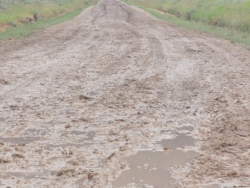 We were worried about the road condition after all that rain and it turned out we were right te be worried. We had only left the pavement a few kms/miles when misery started. The mud was so sticky, like clay, that it stuck everywhere on the bikes and tires. Thick placks of mud formed between the tires and the fenders. Trying to get it off didn’t have any effect, after just a few feet it would be back. We couldn’t move the bikes forward or backward anymore and were absolutely stuck…. The mud had collected underneath the fenders, especially Linda’s back fender.